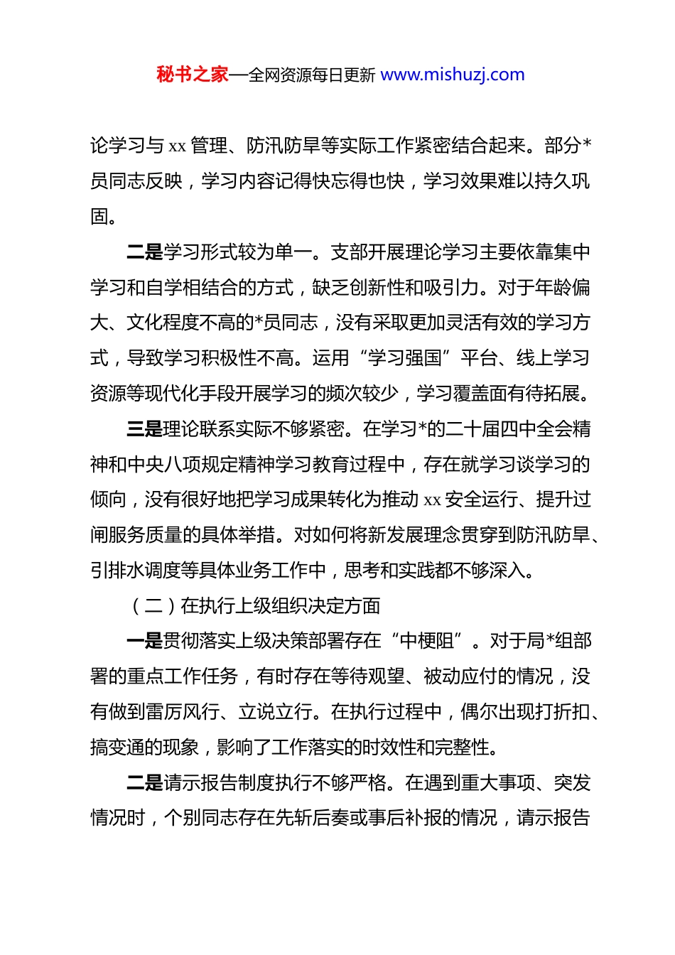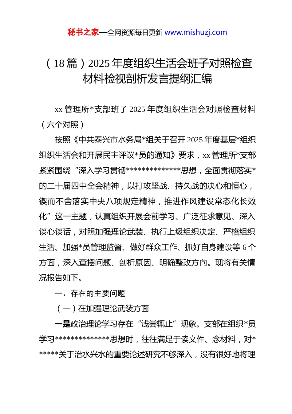 秘书之家—全网资源每日更新 www.mishuzj.com(18 篇)2025 年度组织生活会班子对照检查材料检视剖析发言提纲汇编xx 管理所*支部班子 2025 年度组织生活会对照检查材料(六个对照)按照《中共泰兴市水务局*组关于召开 2025 年度基层*组织组织生活会和开展民主评议*员的通知》要求,xx 管理所*支部紧紧围绕“深入学习贯彻**************思想,全面贯彻落实*的二十届四中全会精神,以打攻坚战、持久战的决心和恒心,锲而不舍落实中央八项规定精神,推进作风建设常态化长效化”这一主题,认真组织开展会前学习、广泛征求意见、深入谈心谈话,对照加强理论武装、执行上级组织决定、严格组织生活、加强*员管理监督、做好群众工作、抓好自身建设等 6 个方面,深入查摆问题、剖析原因、明确整改方向。现将有关情况报告如下。一、存在的主要问题(一)在加强理论武装方面一是政治理论学习存在“浅尝辄止”现象。支部在组织*员学习**************思想时,往往满足于读文件、念材料,对******关于治水兴水的重要论述研究不够深入,没有很好地将理秘书之家—全网资源每日更新 www.mishuzj.com论学习与 xx 管理、防汛防旱等实际工作紧密结合起来。部分*员同志反映,学习内容记得快忘得也快,学习效果难以持久巩固。二是学习形式较为单一。支部开展理论学习主要依靠集中学习和自学相结合的方式,缺乏创新性和吸引力。对于年龄偏大、文化程度不高的*员同志,没有采取更加灵活有效的学习方式,导致学习积极性不高。运用“学习强国”平台、线上学习资源等现代化手段开展学习的频次较少,学习覆盖面有待拓展。三是理论联系实际不够紧密。在学习*的二十届四中全会精神和中央八项规定精神学习教育过程中,存在就学习谈学习的倾向,没有很好地把学习成果转化为推动 xx 安全运行、提升过闸服务质量的具体举措。对如何将新发展理念贯穿到防汛防旱、引排水调度等具体业务工作中,思考和实践都不够深入。(二)在执行上级组织决定方面一是贯彻落实上级决策部署存在“中梗阻”。对于局*组部署的重点工作任务,有时存在等待观望、被动应付的情况,没有做到雷厉风行、立说立行。在执行过程中,偶尔出现打折扣、搞变通的现象,影响了工作落实的时效性和完整性。二是请示报告制度执行不够严格。在遇到重大事项、突发情况时,个别同志存在先斩后奏或事后补报的情况,请示报告秘书之家—全网资源每日更新 www.mishuzj.com的及时性和规范性有待加强。对于 xx 设备故障、汛期调度等专业性较强的事项,有时因担心上级不了解具体情况而自行决定,未能严格按程序请示。三是工作标准存在就低不就高现象。在落实局*组安排的创建任务、迎检工作时,有时满足于“过得去”,缺乏争先创优的进取意识。对标先进找差距的主动性不强,工作中存在按部就班、因循守旧的惯性思维。(三)在严格组织生活方面一是“三会一课”质量有待提升。支部*员大会、支委会、*小组会和*课的召开虽然能够按时完成,但会议质量参差不齐。部分会议存在议题不够聚焦、讨论不够深入、决议执行跟踪不够到位等问题。*课内容与 xx 管理实际结合不够紧密,对*员的教育引导作用发挥不够充分。二是主题*日活动形式不够丰富。支部开展主题*日活动时,形式相对单一,主要以学习文件、观看视频为主,缺乏实践性、体验性强的活动载体。与兄弟单位联合开展活动、深入一线岗位开展志愿服务等活动较少,*员参与积极性不够高。三是批评与自我批评开展不够深入。在组织生活会上,存在“好人主义”倾向,批评意见大多停留在工作层面,触及思想根源的少;自我批评多讲客观困难,少讲主观不足;相互批秘书之家—全网资源每日更新 www.mishuzj.com评怕伤和气、怕得罪人,辣味不足、红脸出汗不够。(四)在加强*员管理监督方面一是*员日常教育管理存在薄弱环节。对于在一线值班、轮班作业的*员同志,日常教育管理覆盖不够全面,存在管理盲区。个别*员同志组织纪律观念有所松懈,迟到早退、工作时间处理私事等现象时有发生,支部发现问题、纠正偏差的能力需要加强。二是*员先锋模范作用发挥不够充分。在急难险重任务面前,*员冲在前、干在先的意识还需...