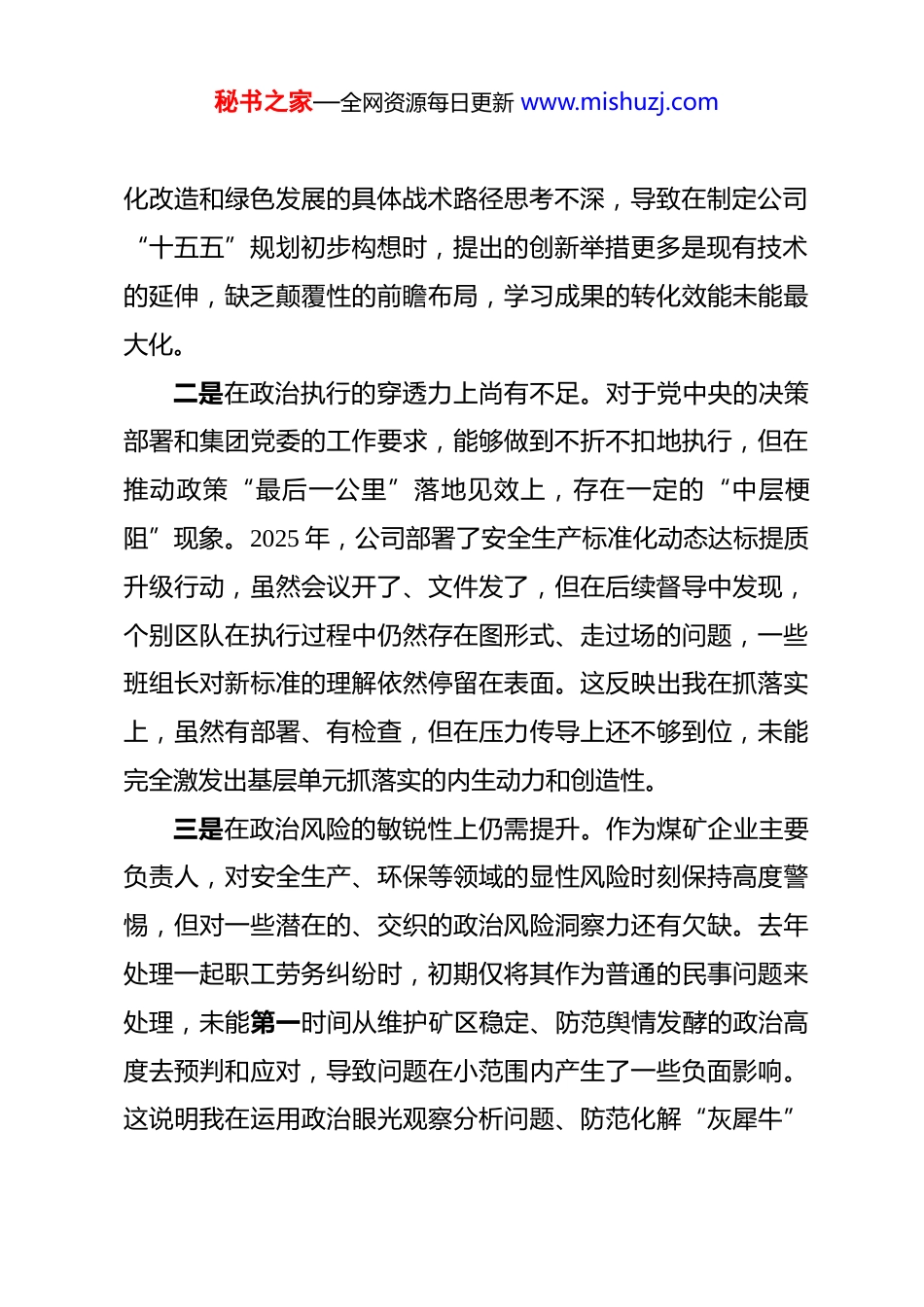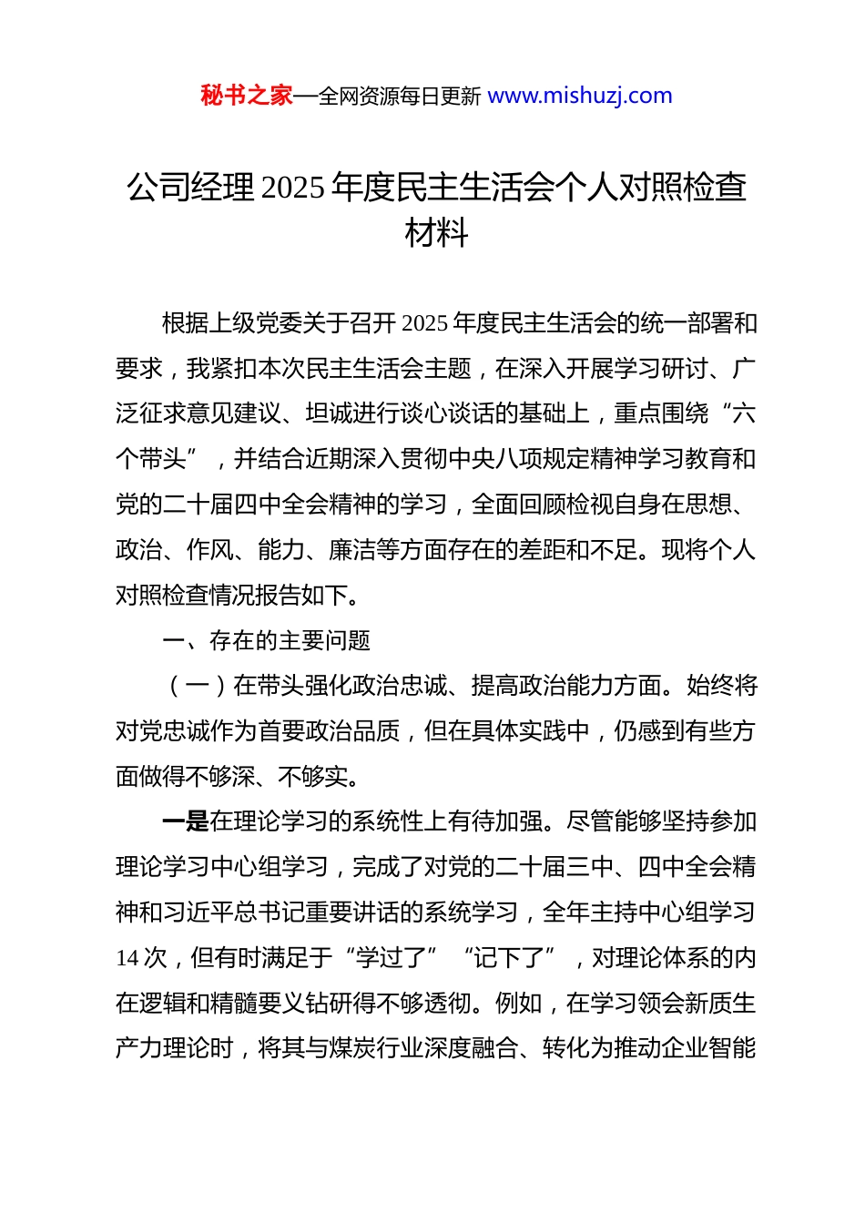 秘书之家—全网资源每日更新 www.mishuzj.com公司经理 2025 年度民主生活会个人对照检查材料 根据上级党委关于召开 2025 年度民主生活会的统一部署和要求,我紧扣本次民主生活会主题,在深入开展学习研讨、广泛征求意见建议、坦诚进行谈心谈话的基础上,重点围绕“六个带头”,并结合近期深入贯彻中央八项规定精神学习教育和党的二十届四中全会精神的学习,全面回顾检视自身在思想、政治、作风、能力、廉洁等方面存在的差距和不足。现将个人对照检查情况报告如下。一、存在的主要问题(一)在带头强化政治忠诚、提高政治能力方面。始终将对党忠诚作为首要政治品质,但在具体实践中,仍感到有些方面做得不够深、不够实。一是在理论学习的系统性上有待加强。尽管能够坚持参加理论学习中心组学习,完成了对党的二十届三中、四中全会精神和习近平总书记重要讲话的系统学习,全年主持中心组学习14 次,但有时满足于“学过了”“记下了”,对理论体系的内在逻辑和精髓要义钻研得不够透彻。例如,在学习领会新质生产力理论时,将其与煤炭行业深度融合、转化为推动企业智能秘书之家—全网资源每日更新 www.mishuzj.com化改造和绿色发展的具体战术路径思考不深,导致在制定公司“十五五”规划初步构想时,提出的创新举措更多是现有技术的延伸,缺乏颠覆性的前瞻布局,学习成果的转化效能未能最大化。二是在政治执行的穿透力上尚有不足。对于党中央的决策部署和集团党委的工作要求,能够做到不折不扣地执行,但在推动政策“最后一公里”落地见效上,存在一定的“中层梗阻”现象。2025 年,公司部署了安全生产标准化动态达标提质升级行动,虽然会议开了、文件发了,但在后续督导中发现,个别区队在执行过程中仍然存在图形式、走过场的问题,一些班组长对新标准的理解依然停留在表面。这反映出我在抓落实上,虽然有部署、有检查,但在压力传导上还不够到位,未能完全激发出基层单元抓落实的内生动力和创造性。三是在政治风险的敏锐性上仍需提升。作为煤矿企业主要负责人,对安全生产、环保等领域的显性风险时刻保持高度警惕,但对一些潜在的、交织的政治风险洞察力还有欠缺。去年处理一起职工劳务纠纷时,初期仅将其作为普通的民事问题来处理,未能第一时间从维护矿区稳定、防范舆情发酵的政治高度去预判和应对,导致问题在小范围内产生了一些负面影响。这说明我在运用政治眼光观察分析问题、防范化解“灰犀牛”秘书之家—全网资源每日更新 www.mishuzj.com事件的能力上,还存在短板和不足。(二)在带头固本培元、增强党性方面。始终注重加强党性修养,但在持之以恒、融入日常上还需进一步下功夫。一是在党性锤炼的内化深度上有所欠缺。在参加党内政治生活时,能够认真完成各项规定动作,但有时存在“事务主义”倾向,把更多的精力投入到解决生产经营的实际问题中,对通过严肃的党内政治生活来净化思想、锤炼党性的深层次作用认识不足。比如,在组织“红色基地励党性”主题党日活动后,虽然大家深受触动,但我后续未能及时组织开展深入的分享研讨,将一次性的感动转化为持续性的党性滋养,导致活动效果打了折扣。二是在革命传统的传承践行上不够经常。对艰苦奋斗、勤俭节约的优良传统,主观上是高度认同的,但在行动上,随着企业经营效益的好转,对一些“小事”“小节”的要求有所放松。例如,在审批办公用品采购时,有时对价格的把关不够严格,认为只要不超预算即可,没有把“紧日子”思想真正贯穿到经营管理的全过程,无形中放松了对自我党性修养的严格要求。三是在自我革命的斗争精神上有所弱化。在班子内部或与中层干部的交流中,出于维护团结、调动积极性的考虑,开展秘书之家—全网资源每日更新 www.mishuzj.com批评时“辣味”不足,讲成绩多、谈问题少,讲客观原因多、点主观思想少。尤其是在涉及一些部门协同不畅、工作效率不高的问题时,有时采取了比较委婉的提醒方式,没有一针见血地指出问题根源,怕影响干部的工作热情,这种“爱之深、责之切”的斗争精神发扬得不够充分。(三)在带头敬畏人民、敬畏组织、敬畏法纪方面。始终牢记权力是党和人民赋予的,但在行使权力、...