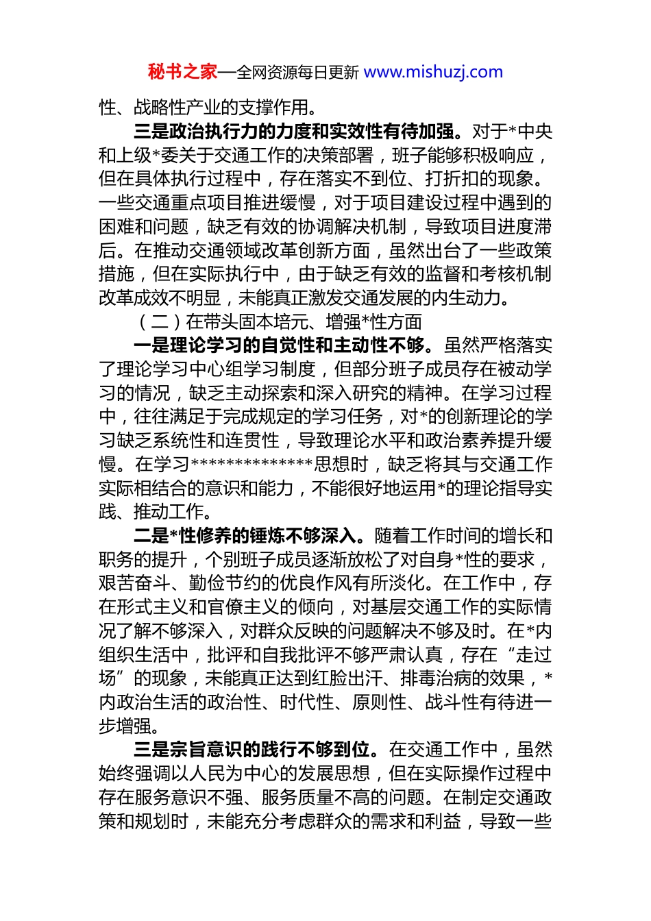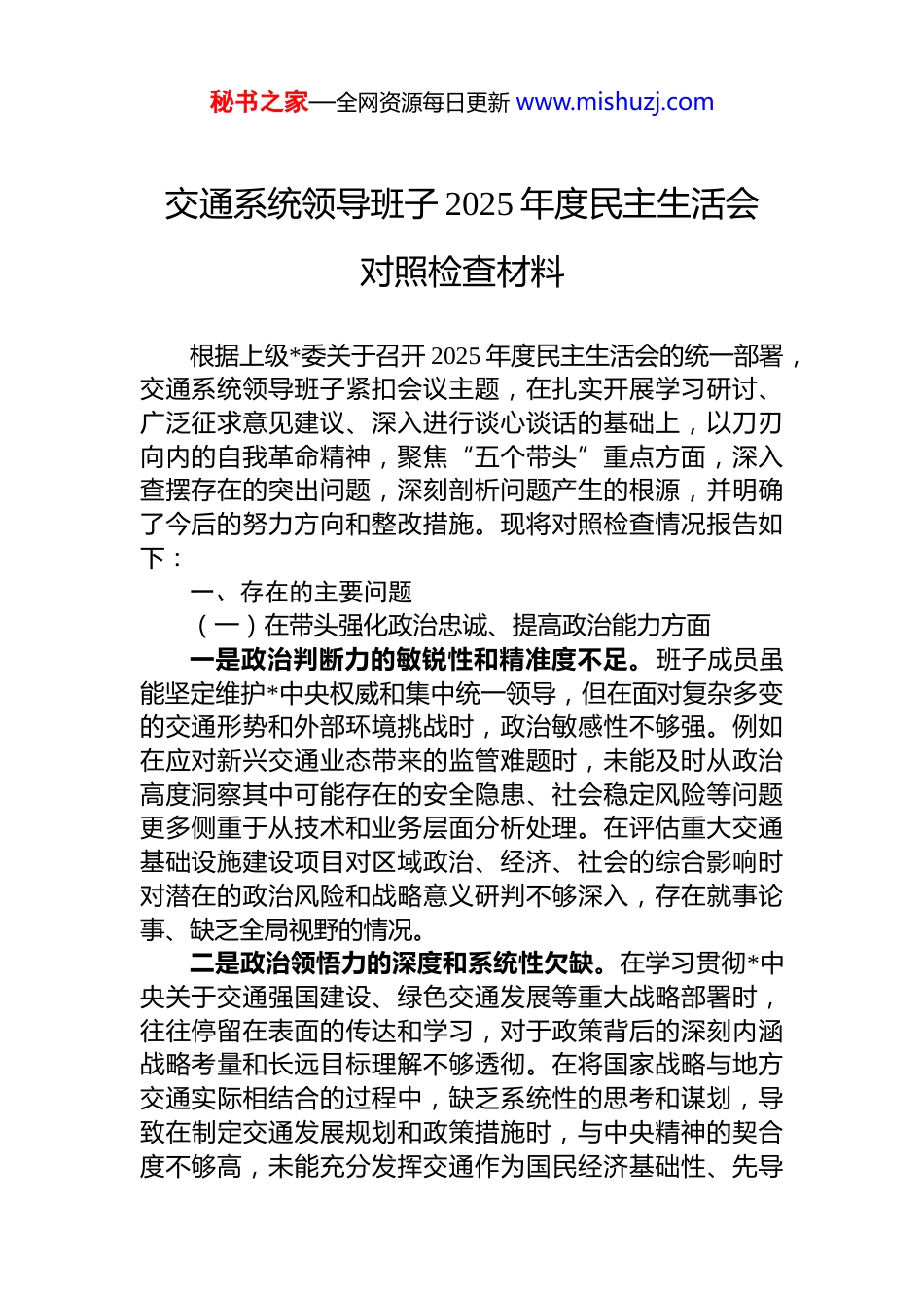 秘书之家—全网资源每日更新 www.mishuzj.com交通系统领导班子 2025 年度民主生活会对照检查材料根据上级*委关于召开 2025 年度民主生活会的统一部署,交通系统领导班子紧扣会议主题,在扎实开展学习研讨、广泛征求意见建议、深入进行谈心谈话的基础上,以刀刃向内的自我革命精神,聚焦“五个带头”重点方面,深入查摆存在的突出问题,深刻剖析问题产生的根源,并明确了今后的努力方向和整改措施。现将对照检查情况报告如下:一、存在的主要问题(一)在带头强化政治忠诚、提高政治能力方面一是政治判断力的敏锐性和精准度不足。班子成员虽能坚定维护*中央权威和集中统一领导,但在面对复杂多变的交通形势和外部环境挑战时,政治敏感性不够强。例如在应对新兴交通业态带来的监管难题时,未能及时从政治高度洞察其中可能存在的安全隐患、社会稳定风险等问题更多侧重于从技术和业务层面分析处理。在评估重大交通基础设施建设项目对区域政治、经济、社会的综合影响时对潜在的政治风险和战略意义研判不够深入,存在就事论事、缺乏全局视野的情况。二是政治领悟力的深度和系统性欠缺。在学习贯彻*中央关于交通强国建设、绿色交通发展等重大战略部署时,往往停留在表面的传达和学习,对于政策背后的深刻内涵战略考量和长远目标理解不够透彻。在将国家战略与地方交通实际相结合的过程中,缺乏系统性的思考和谋划,导致在制定交通发展规划和政策措施时,与中央精神的契合度不够高,未能充分发挥交通作为国民经济基础性、先导秘书之家—全网资源每日更新 www.mishuzj.com性、战略性产业的支撑作用。三是政治执行力的力度和实效性有待加强。对于*中央和上级*委关于交通工作的决策部署,班子能够积极响应,但在具体执行过程中,存在落实不到位、打折扣的现象。一些交通重点项目推进缓慢,对于项目建设过程中遇到的困难和问题,缺乏有效的协调解决机制,导致项目进度滞后。在推动交通领域改革创新方面,虽然出台了一些政策措施,但在实际执行中,由于缺乏有效的监督和考核机制改革成效不明显,未能真正激发交通发展的内生动力。(二)在带头固本培元、增强*性方面一是理论学习的自觉性和主动性不够。虽然严格落实了理论学习中心组学习制度,但部分班子成员存在被动学习的情况,缺乏主动探索和深入研究的精神。在学习过程中,往往满足于完成规定的学习任务,对*的创新理论的学习缺乏系统性和连贯性,导致理论水平和政治素养提升缓慢。在学习**************思想时,缺乏将其与交通工作实际相结合的意识和能力,不能很好地运用*的理论指导实践、推动工作。二是*性修养的锤炼不够深入。随着工作时间的增长和职务的提升,个别班子成员逐渐放松了对自身*性的要求,艰苦奋斗、勤俭节约的优良作风有所淡化。在工作中,存在形式主义和官僚主义的倾向,对基层交通工作的实际情况了解不够深入,对群众反映的问题解决不够及时。在*内组织生活中,批评和自我批评不够严肃认真,存在“走过场”的现象,未能真正达到红脸出汗、排毒治病的效果,*内政治生活的政治性、时代性、原则性、战斗性有待进一步增强。三是宗旨意识的践行不够到位。在交通工作中,虽然始终强调以人民为中心的发展思想,但在实际操作过程中存在服务意识不强、服务质量不高的问题。在制定交通政策和规划时,未能充分考虑群众的需求和利益,导致一些秘书之家—全网资源每日更新 www.mishuzj.com交通基础设施项目建设与群众的实际出行需求脱节。在交通公共服务方面,对老年人、残疾人等特殊群体的关怀不够,未能提供更加便捷、舒适、安全的出行环境。(三)在带头敬畏人民、敬畏组织、敬畏法纪方面一是对人民群众主体地位认识不足。在交通决策过程中,虽然会征求群众意见,但往往流于形式,未能充分尊重群众的意愿和诉求。在交通基础设施建设项目选址、线路规划等工作中,没有真正做到从群众中来、到群众中去导致一些项目在实施过程中遭遇阻力,影响了项目的顺利推进。对群众反映的交通拥堵、公交服务质量差等问题,虽然采取了一些措施,但缺乏系统性和长期性的解决方案未能从根本上解决群众的出行难题。二是组织纪律执行不够严格。民...
