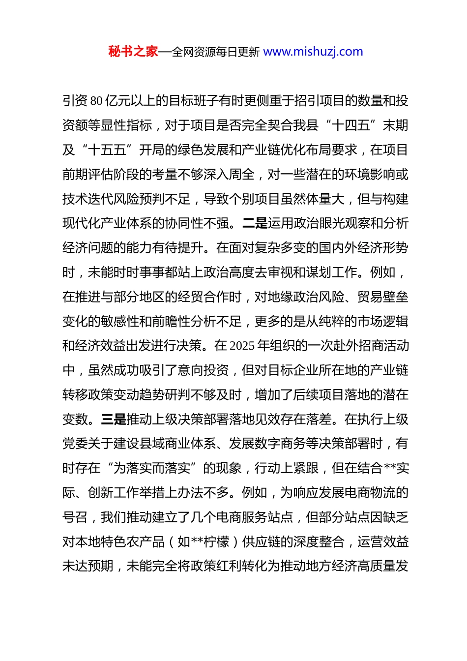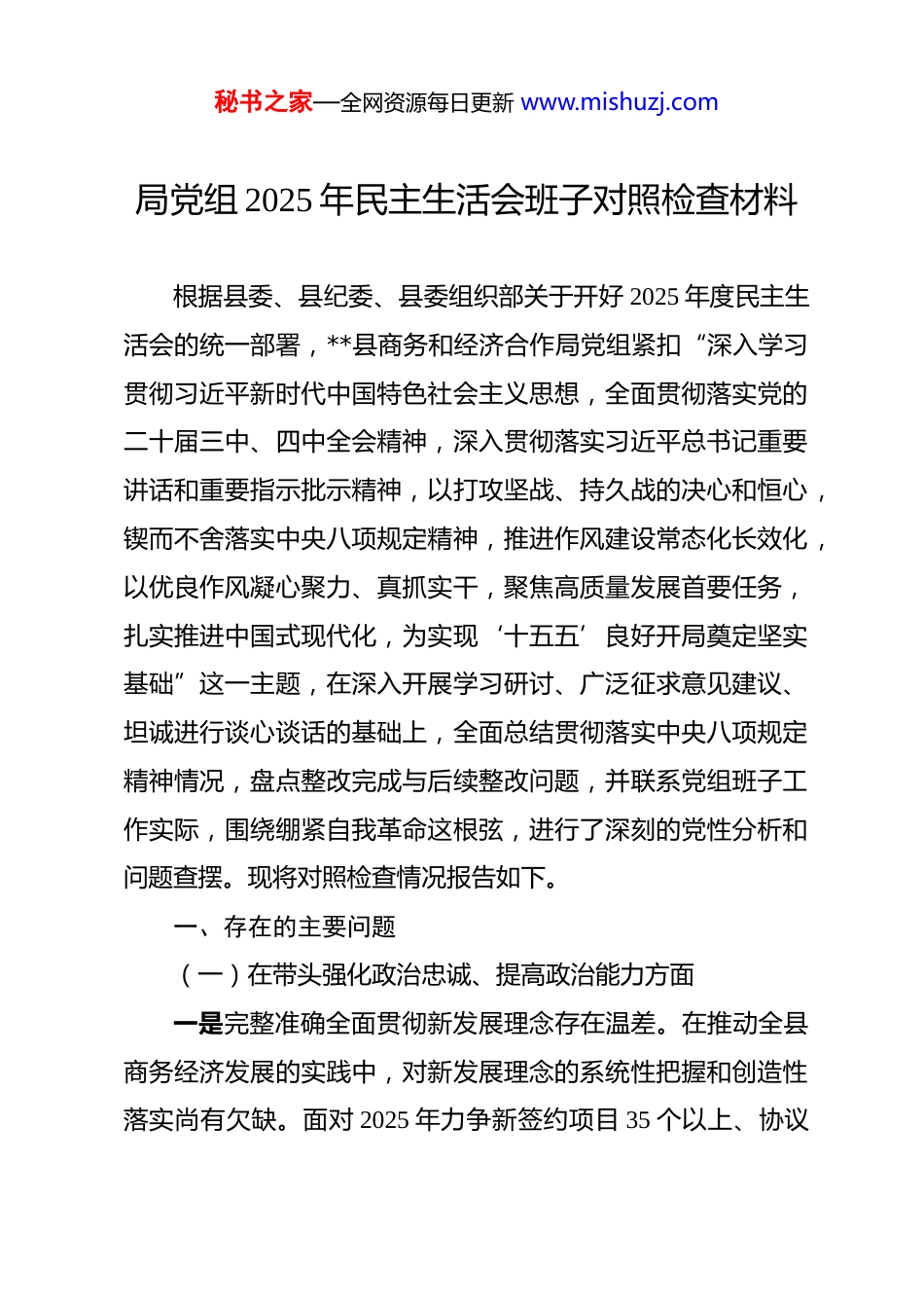 秘书之家—全网资源每日更新 www.mishuzj.com局党组 2025 年民主生活会班子对照检查材料 根据县委、县纪委、县委组织部关于开好 2025 年度民主生活会的统一部署,**县商务和经济合作局党组紧扣“深入学习贯彻习近平新时代中国特色社会主义思想,全面贯彻落实党的二十届三中、四中全会精神,深入贯彻落实习近平总书记重要讲话和重要指示批示精神,以打攻坚战、持久战的决心和恒心,锲而不舍落实中央八项规定精神,推进作风建设常态化长效化,以优良作风凝心聚力、真抓实干,聚焦高质量发展首要任务,扎实推进中国式现代化,为实现‘十五五’良好开局奠定坚实基础”这一主题,在深入开展学习研讨、广泛征求意见建议、坦诚进行谈心谈话的基础上,全面总结贯彻落实中央八项规定精神情况,盘点整改完成与后续整改问题,并联系党组班子工作实际,围绕绷紧自我革命这根弦,进行了深刻的党性分析和问题查摆。现将对照检查情况报告如下。一、存在的主要问题(一)在带头强化政治忠诚、提高政治能力方面一是完整准确全面贯彻新发展理念存在温差。在推动全县商务经济发展的实践中,对新发展理念的系统性把握和创造性落实尚有欠缺。面对 2025 年力争新签约项目 35 个以上、协议秘书之家—全网资源每日更新 www.mishuzj.com引资 80 亿元以上的目标班子有时更侧重于招引项目的数量和投资额等显性指标,对于项目是否完全契合我县“十四五”末期及“十五五”开局的绿色发展和产业链优化布局要求,在项目前期评估阶段的考量不够深入周全,对一些潜在的环境影响或技术迭代风险预判不足,导致个别项目虽然体量大,但与构建现代化产业体系的协同性不强。二是运用政治眼光观察和分析经济问题的能力有待提升。在面对复杂多变的国内外经济形势时,未能时时事事都站上政治高度去审视和谋划工作。例如,在推进与部分地区的经贸合作时,对地缘政治风险、贸易壁垒变化的敏感性和前瞻性分析不足,更多的是从纯粹的市场逻辑和经济效益出发进行决策。在 2025 年组织的一次赴外招商活动中,虽然成功吸引了意向投资,但对目标企业所在地的产业链转移政策变动趋势研判不够及时,增加了后续项目落地的潜在变数。三是推动上级决策部署落地见效存在落差。在执行上级党委关于建设县域商业体系、发展数字商务等决策部署时,有时存在“为落实而落实”的现象,行动上紧跟,但在结合**实际、创新工作举措上办法不多。例如,为响应发展电商物流的号召,我们推动建立了几个电商服务站点,但部分站点因缺乏对本地特色农产品(如**柠檬)供应链的深度整合,运营效益未达预期,未能完全将政策红利转化为推动地方经济高质量发秘书之家—全网资源每日更新 www.mishuzj.com展的实际动能,存在一定的“上热下冷”现象。(二)在带头固本培元、增强党性方面一是理论学习与中心工作的“黏合度”不高。虽然党组理论学习中心组坚持了学习制度,但有时学习内容与商务、经合工作的结合点找得不准,存在“两张皮”现象。在学习党的二十届四中全会精神时,满足于读原文、悟原理,但如何将其转化为优化营商环境、创新招商引资体制机制的具体路径,研讨不深、转化不够,导致理论学习的成果未能高效指导解决招商引资项目落地难、见效慢等实际问题。二是在自我革命的斗争精神上有所松懈。随着工作取得一定成绩,班子成员中滋生了些许“歇歇脚、喘口气”的念头,缺乏“归零”心态和持续攻坚的锐气。在 2025 年年中工作复盘时,面对部分经济指标增速放缓的情况,有的同志第一反应是强调外部宏观环境的不利影响,而不是立即从主观上、从自身工作作风上查找差距和不足,在刀刃向内、自我剖析的狠劲上有所欠缺,批评和自我批评的“辣味”不足。三是在急难险重任务中锤炼党性有所弱化。日常工作中,党性修养的锤炼更多停留在思想层面,融入具体工作的自觉性不强。在推进年度重点项目,如某个大型商业综合体建设协调工作时,面对涉及多部门的复杂审批流程和利益纠纷,少数班子成员表现出畏难情绪,习惯于“等靠要”,依赖秘书之家—全网资源每日更新 www.mishuzj.com上级协调或“击鼓传花”,而不是主动靠前、带头啃“硬骨头”,把解决...