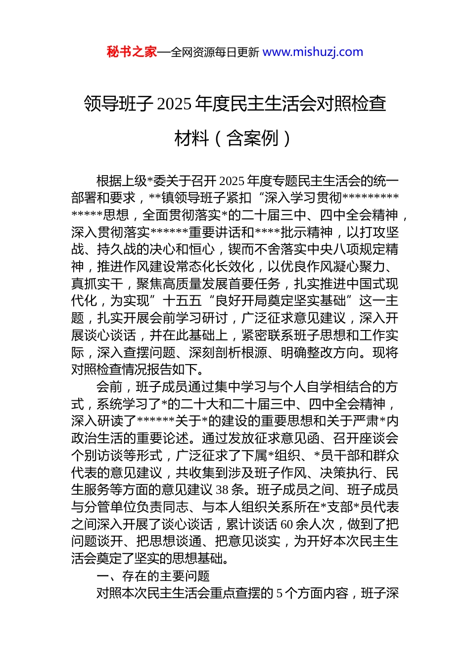 秘书之家—全网资源每日更新 www.mishuzj.com领导班子 2025 年度民主生活会对照检查材料(含案例)根据上级*委关于召开 2025 年度专题民主生活会的统一部署和要求,**镇领导班子紧扣“深入学习贯彻**************思想,全面贯彻落实*的二十届三中、四中全会精神,深入贯彻落实******重要讲话和****批示精神,以打攻坚战、持久战的决心和恒心,锲而不舍落实中央八项规定精神,推进作风建设常态化长效化,以优良作风凝心聚力、真抓实干,聚焦高质量发展首要任务,扎实推进中国式现代化,为实现”十五五“良好开局奠定坚实基础”这一主题,扎实开展会前学习研讨,广泛征求意见建议,深入开展谈心谈话,并在此基础上,紧密联系班子思想和工作实际,深入查摆问题、深刻剖析根源、明确整改方向。现将对照检查情况报告如下。会前,班子成员通过集中学习与个人自学相结合的方式,系统学习了*的二十大和二十届三中、四中全会精神,深入研读了******关于*的建设的重要思想和关于严肃*内政治生活的重要论述。通过发放征求意见函、召开座谈会个别访谈等形式,广泛征求了下属*组织、*员干部和群众代表的意见建议,共收集到涉及班子作风、决策执行、民生服务等方面的意见建议 38 条。班子成员之间、班子成员与分管单位负责同志、与本人组织关系所在*支部*员代表之间深入开展了谈心谈话,累计谈话 60 余人次,做到了把问题谈开、把思想谈通、把意见谈实,为开好本次民主生活会奠定了坚实的思想基础。一、存在的主要问题对照本次民主生活会重点查摆的 5 个方面内容,班子深秘书之家—全网资源每日更新 www.mishuzj.com刻检视,发现仍存在一些不容忽视的问题。(一)在带头强化政治忠诚、提高政治能力方面一是理论武装的转化运用不够深入。班子虽然坚持了集体学习制度,但有时存在为学习而学习的现象,满足于读过了、学过了,但在如何将**************思想的立场、观点、方法,与我镇“再造一个新**”的宏伟目标紧密结合上,思考不深、研讨不够、转化不足。例如,在推动传统制造业转型升级的过程中,对于如何运用新发展理念指导具体产业政策的制定,班子成员在讨论会上提出的创新性操作性强的建议不多,导致部分扶持政策未能精准滴灌到最需要的企业,影响了政策实效。2025 年,全镇虽然新增市场主体数量可观,但其中高新技术企业的比例仅为12%,低于全市平均水平,这反映出我们在推动产业向“新”向“质”发展的战略引领上,政治判断力和执行力结合得不够紧密。二是政治判断力和政治敏锐性不够强。面对复杂多变的外部环境和经济下行压力,班子对一些潜在的风险挑战预判不足,对一些苗头性、倾向性问题背后的政治因素洞察不够深刻。例如,在处理**工业园区的环保升级改造问题上,初期仅将其作为一项技术性整改任务来部署,未能从生态文明建设这一“国之大者”的高度来审视,导致工作推进缓慢,引起了部分周边群众的信访反映,一度造成了工作上的被动。这说明我们在从具体业务问题中洞察政治问题的能力、从纷繁复杂的矛盾中把握政治逻辑的能力仍有欠缺。三是贯彻执行上级决策部署不够坚决。对中央和省市的决策部署,班子层面能够做到闻令而动、迅速传达,但在具体执行过程中,有时存在结合本地实际“选择性”落实或“打折扣”执行的现象。比如,在推进“百县千镇万村高质量发展工程”中,上级要求全面推进乡村风貌提升但我们在实际操作中,将更多资源和精力集中在了几个秘书之家—全网资源每日更新 www.mishuzj.com“明星村”“示范点”,对一些基础较差的村居投入不足导致全镇整体提升效果不均衡,出现了“盆景”与“苗圃”并存的现象,这实质上是对上级决策部署理解不透、执行不彻底的表现。(二)在带头固本培元、增强*性修养方面一是*性锤炼的自觉性不够主动。部分班子成员在繁重的日常事务中,存在以事务工作代替*性锻炼的倾向,认为只要把经济搞上去、把任务完成了,就是最好的*性体现。在实际工作中,自觉用*性原则约束自己言行的“弦”绷得不够紧。比如,在一些非正式场合,对社会上流传的一些错误言论,有时未能第一时间站出来旗帜鲜明地批驳和纠正,存在“多一事不如少一事”...