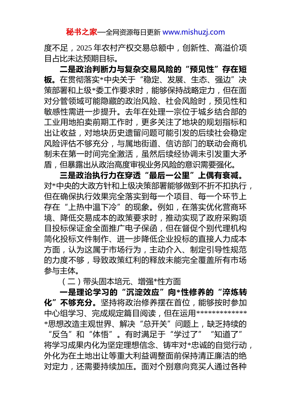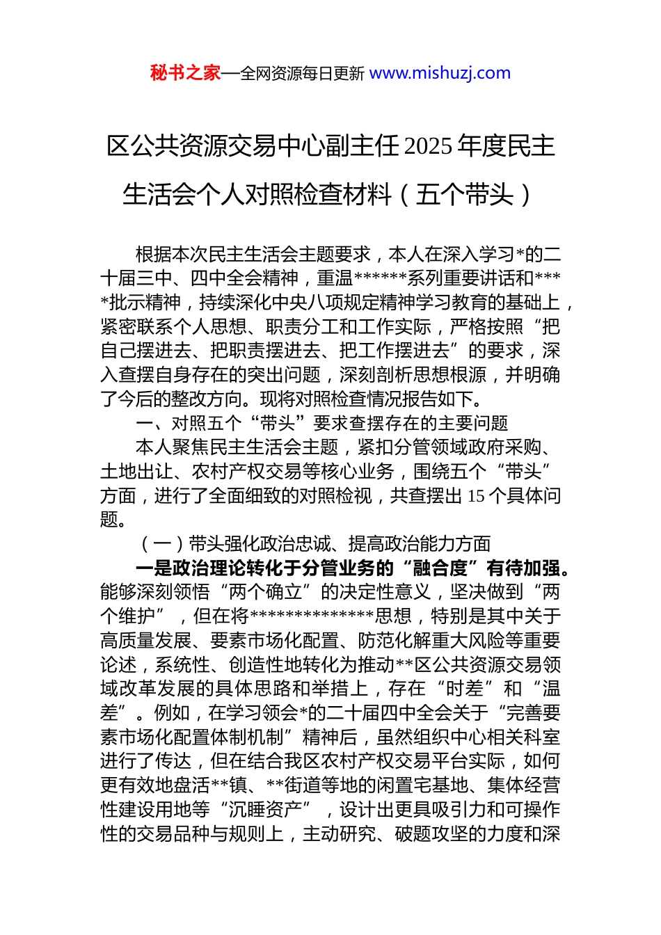 秘书之家—全网资源每日更新 www.mishuzj.com区公共资源交易中心副主任 2025 年度民主生活会个人对照检查材料(五个带头)根据本次民主生活会主题要求,本人在深入学习*的二十届三中、四中全会精神,重温******系列重要讲话和****批示精神,持续深化中央八项规定精神学习教育的基础上,紧密联系个人思想、职责分工和工作实际,严格按照“把自己摆进去、把职责摆进去、把工作摆进去”的要求,深入查摆自身存在的突出问题,深刻剖析思想根源,并明确了今后的整改方向。现将对照检查情况报告如下。一、对照五个“带头”要求查摆存在的主要问题本人聚焦民主生活会主题,紧扣分管领域政府采购、土地出让、农村产权交易等核心业务,围绕五个“带头”方面,进行了全面细致的对照检视,共查摆出 15 个具体问题。(一)带头强化政治忠诚、提高政治能力方面一是政治理论转化于分管业务的“融合度”有待加强。能够深刻领悟“两个确立”的决定性意义,坚决做到“两个维护”,但在将**************思想,特别是其中关于高质量发展、要素市场化配置、防范化解重大风险等重要论述,系统性、创造性地转化为推动**区公共资源交易领域改革发展的具体思路和举措上,存在“时差”和“温差”。例如,在学习领会*的二十届四中全会关于“完善要素市场化配置体制机制”精神后,虽然组织中心相关科室进行了传达,但在结合我区农村产权交易平台实际,如何更有效地盘活**镇、**街道等地的闲置宅基地、集体经营性建设用地等“沉睡资产”,设计出更具吸引力和可操作性的交易品种与规则上,主动研究、破题攻坚的力度和深秘书之家—全网资源每日更新 www.mishuzj.com度不足,2025 年农村产权交易总额中,创新性、高溢价项目占比未达预期目标。二是政治判断力与复杂交易风险的“预见性”存在短板。在贯彻落实*中央关于“稳定、发展、生态、强边”决策部署和上级*委工作要求时,能够保持战略定力,但在面对分管领域可能隐藏的政治风险、社会风险时,预见性和敏感性需进一步提升。去年在处理一宗位于城乡结合部的工业用地拍卖前期工作时,更多关注了地块的规划指标和出让收益,对地块历史遗留问题可能引发的后续社会稳定风险评估不够充分,与属地街道、信访部门的联动会商机制未在第一时间完全激活,虽然后续经协调未引发重大矛盾,但暴露出从政治高度审视业务风险的意识需要强化。三是政治执行力在穿透“最后一公里”上偶有衰减。对*中央的大政方针和上级决策部署能够做到不折不扣执行,但在确保执行效果完全落实到每一个项目、每一个环节上存在“上热中温下冷”的现象。例如,在落实优化营商环境、降低交易成本的政策要求时,推动实现了政府采购项目投标保证金全面推广电子保函,但在督促个别代理机构简化投标文件制作、进一步降低企业投标的直接人力成本方面,认为这属于市场行为,主动介入、制定引导性规范的力度不够,导致政策红利的释放未能完全覆盖所有市场参与主体。(二)带头固本培元、增强*性方面一是理论学习的“沉淀效应”向*性修养的“淬炼转化”不够充分。坚持将政治修养摆在首位,能够按时参加中心组学习、完成规定篇目阅读,但在运用**************思想改造主观世界、解决“总开关”问题上,缺乏持续的“反刍”和“体悟”。有时满足于“学过了”“知道了”将学习成果内化为坚定理想信念、铸牢对*忠诚的自觉行动,外化为在土地出让等重大利益调整面前保持清正廉洁的绝对定力,还需要持续加压。面对个别意向竞买人通过各种秘书之家—全网资源每日更新 www.mishuzj.com渠道表达的“沟通”意愿,虽然能坚守底线,但内心偶尔会产生“是否影响了区域招商环境”的短暂纠结,说明*性原则的“防火墙”仍需加固。二是*章*规 dj 学习的“常态化”与“场景化”结合不紧。能够认真学习*章*规 dj,但在将其精神实质与分管工作的具体场景、廉政风险点紧密结合,进行常态化、沉浸式警示教育方面做得不足。组织科室学习廉政规定,有时以传达文件、通报案例为主,未能经常性地将本区、本系统乃至自身分管业务中可能存在的围标串标、泄露信息、规避招标等风险点,置于*规 dj 的“探照灯”下进行情景模拟和...