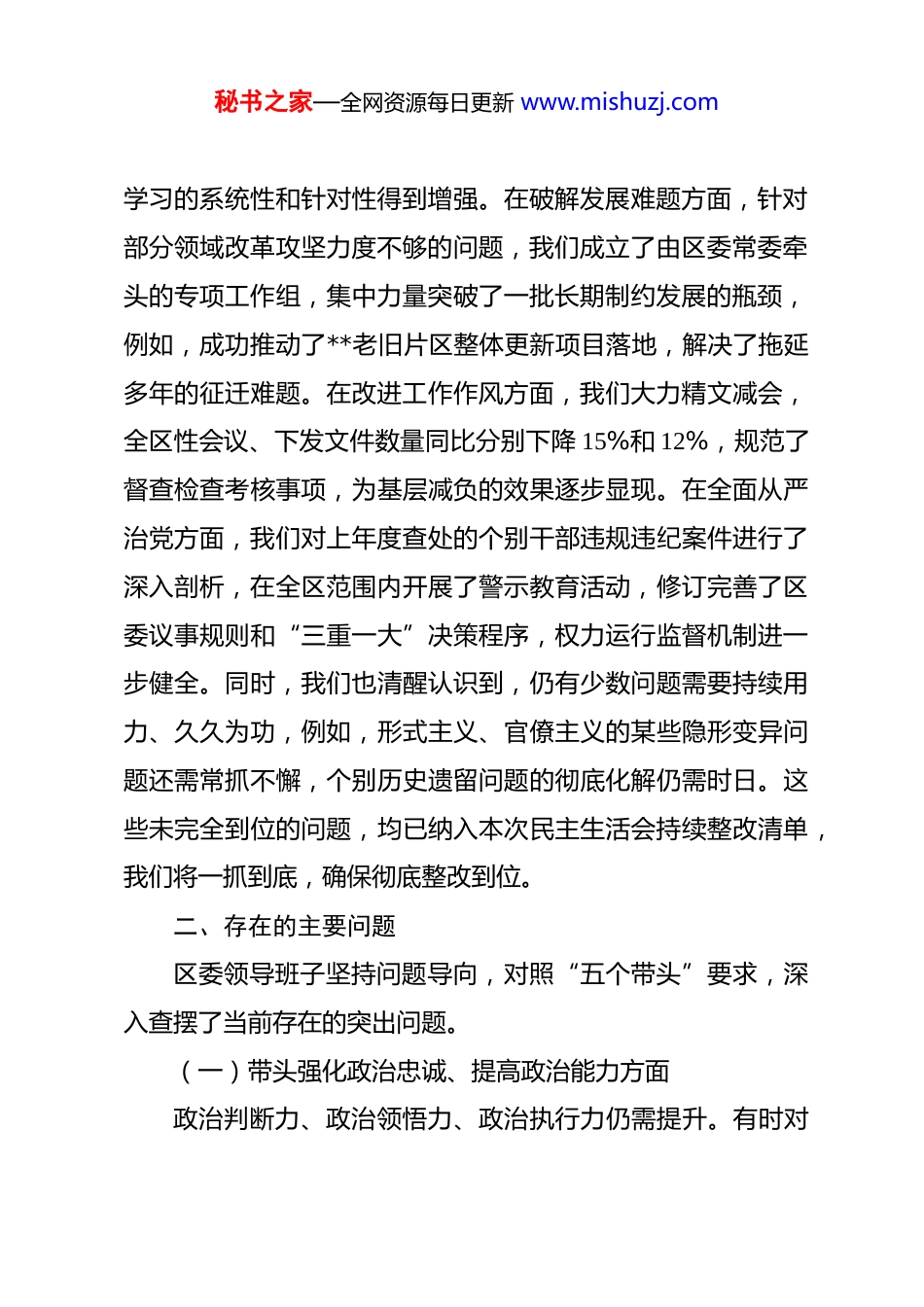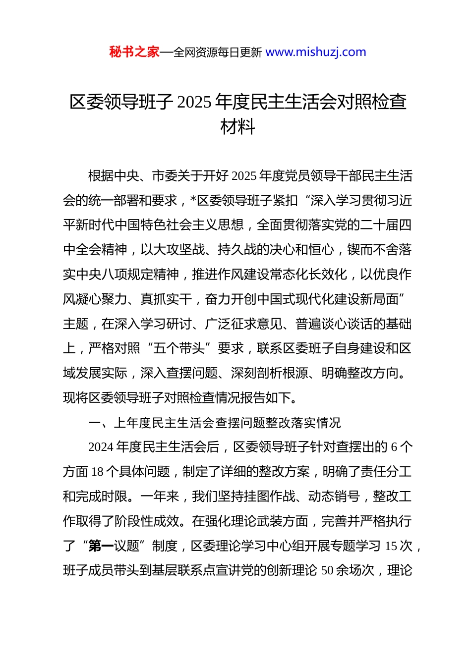 秘书之家—全网资源每日更新 www.mishuzj.com区委领导班子 2025 年度民主生活会对照检查材料 根据中央、市委关于开好 2025 年度党员领导干部民主生活会的统一部署和要求,*区委领导班子紧扣“深入学习贯彻习近平新时代中国特色社会主义思想,全面贯彻落实党的二十届四中全会精神,以大攻坚战、持久战的决心和恒心,锲而不舍落实中央八项规定精神,推进作风建设常态化长效化,以优良作风凝心聚力、真抓实干,奋力开创中国式现代化建设新局面”主题,在深入学习研讨、广泛征求意见、普遍谈心谈话的基础上,严格对照“五个带头”要求,联系区委班子自身建设和区域发展实际,深入查摆问题、深刻剖析根源、明确整改方向。现将区委领导班子对照检查情况报告如下。一、上年度民主生活会查摆问题整改落实情况2024 年度民主生活会后,区委领导班子针对查摆出的 6 个方面 18 个具体问题,制定了详细的整改方案,明确了责任分工和完成时限。一年来,我们坚持挂图作战、动态销号,整改工作取得了阶段性成效。在强化理论武装方面,完善并严格执行了“第一议题”制度,区委理论学习中心组开展专题学习 15 次,班子成员带头到基层联系点宣讲党的创新理论 50 余场次,理论秘书之家—全网资源每日更新 www.mishuzj.com学习的系统性和针对性得到增强。在破解发展难题方面,针对部分领域改革攻坚力度不够的问题,我们成立了由区委常委牵头的专项工作组,集中力量突破了一批长期制约发展的瓶颈,例如,成功推动了**老旧片区整体更新项目落地,解决了拖延多年的征迁难题。在改进工作作风方面,我们大力精文减会,全区性会议、下发文件数量同比分别下降 15%和 12%,规范了督查检查考核事项,为基层减负的效果逐步显现。在全面从严治党方面,我们对上年度查处的个别干部违规违纪案件进行了深入剖析,在全区范围内开展了警示教育活动,修订完善了区委议事规则和“三重一大”决策程序,权力运行监督机制进一步健全。同时,我们也清醒认识到,仍有少数问题需要持续用力、久久为功,例如,形式主义、官僚主义的某些隐形变异问题还需常抓不懈,个别历史遗留问题的彻底化解仍需时日。这些未完全到位的问题,均已纳入本次民主生活会持续整改清单,我们将一抓到底,确保彻底整改到位。二、存在的主要问题区委领导班子坚持问题导向,对照“五个带头”要求,深入查摆了当前存在的突出问题。(一)带头强化政治忠诚、提高政治能力方面政治判断力、政治领悟力、政治执行力仍需提升。有时对秘书之家—全网资源每日更新 www.mishuzj.com中央精神和市委要求的理解停留在字面层面,结合*实际进行创造性转化、落地落实的深度不够,存在一定的“温差”。例如,在对接上海“五个中心”建设战略时,对如何将*的区位优势、产业基础更深度地融入国家战略,缺乏前瞻性、系统性的突破性举措,部分工作满足于“做了”而非“做实、做优”。在面对复杂严峻的风险挑战时,部分班子成员的忧患意识和斗争精神有所弱化,对意识形态领域可能存在的风险点排查不够细致,对经济社会发展中潜在矛盾的预见性、化解能力有待加强。在执行党的政治纪律和政治规矩上,虽然班子成员个人都能严守底线,但在带动分管领域和部门党员干部时刻绷紧政治弦方面,压力传导还不到位,对一些苗头性、倾向性问题的提醒纠正不够及时、不够有力。(二)带头固本培元、增强党性方面理论武装的自觉性和系统性有待增强。虽然能够坚持集体学习,但部分班子成员在个人自学上投入的时间精力不足,对习近平新时代中国特色社会主义思想的核心要义、精神实质、丰富内涵和实践要求的理解把握还不够融会贯通,存在“零散化”、“选择性”学习现象。运用党的创新理论指导实践、破解难题的能力有差距,比如,在运用新发展理念引领城区数字化转型、推动经济高质量发展方面,思路还不够开阔,办法还秘书之家—全网资源每日更新 www.mishuzj.com不多,有时显得“老办法不管用,新办法不会用”。党性锻炼的主动性有所欠缺,满足于完成规定动作,对照党章党规党纪进行自我检视、自我净化、自我提高的标准不够高、要求不够严,艰苦奋斗、勤俭节约的精神在公务活动...