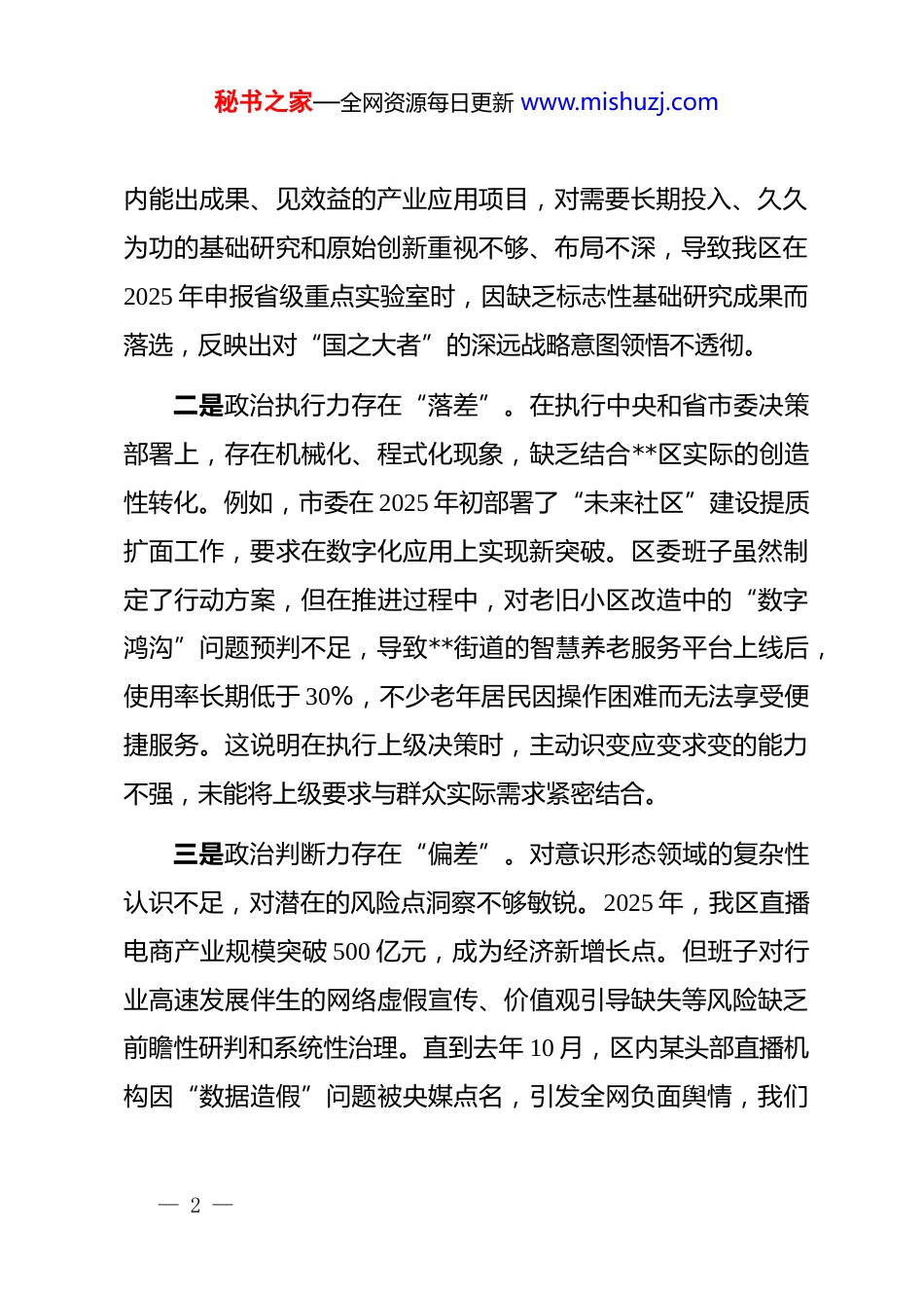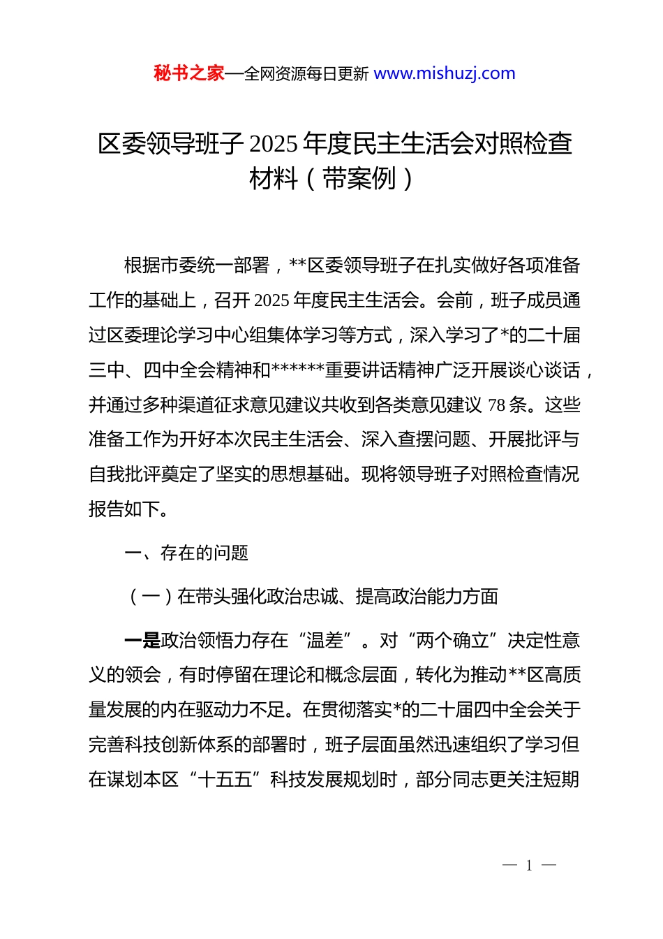 秘书之家—全网资源每日更新 www.mishuzj.com区委领导班子 2025 年度民主生活会对照检查材料(带案例)根据市委统一部署,**区委领导班子在扎实做好各项准备工作的基础上,召开 2025 年度民主生活会。会前,班子成员通过区委理论学习中心组集体学习等方式,深入学习了*的二十届三中、四中全会精神和******重要讲话精神广泛开展谈心谈话,并通过多种渠道征求意见建议共收到各类意见建议 78 条。这些准备工作为开好本次民主生活会、深入查摆问题、开展批评与自我批评奠定了坚实的思想基础。现将领导班子对照检查情况报告如下。一、存在的问题(一)在带头强化政治忠诚、提高政治能力方面一是政治领悟力存在“温差”。对“两个确立”决定性意义的领会,有时停留在理论和概念层面,转化为推动**区高质量发展的内在驱动力不足。在贯彻落实*的二十届四中全会关于完善科技创新体系的部署时,班子层面虽然迅速组织了学习但在谋划本区“十五五”科技发展规划时,部分同志更关注短期— 1 —秘书之家—全网资源每日更新 www.mishuzj.com内能出成果、见效益的产业应用项目,对需要长期投入、久久为功的基础研究和原始创新重视不够、布局不深,导致我区在2025 年申报省级重点实验室时,因缺乏标志性基础研究成果而落选,反映出对“国之大者”的深远战略意图领悟不透彻。二是政治执行力存在“落差”。在执行中央和省市委决策部署上,存在机械化、程式化现象,缺乏结合**区实际的创造性转化。例如,市委在 2025 年初部署了“未来社区”建设提质扩面工作,要求在数字化应用上实现新突破。区委班子虽然制定了行动方案,但在推进过程中,对老旧小区改造中的“数字鸿沟”问题预判不足,导致**街道的智慧养老服务平台上线后,使用率长期低于 30%,不少老年居民因操作困难而无法享受便捷服务。这说明在执行上级决策时,主动识变应变求变的能力不强,未能将上级要求与群众实际需求紧密结合。三是政治判断力存在“偏差”。对意识形态领域的复杂性认识不足,对潜在的风险点洞察不够敏锐。2025 年,我区直播电商产业规模突破 500 亿元,成为经济新增长点。但班子对行业高速发展伴生的网络虚假宣传、价值观引导缺失等风险缺乏前瞻性研判和系统性治理。直到去年 10 月,区内某头部直播机构因“数据造假”问题被央媒点名,引发全网负面舆情,我们— 2 —秘书之家—全网资源每日更新 www.mishuzj.com才紧急出台行业规范整治措施,错失了主动引导、防患于未然的最佳时机,暴露出在复杂局面中见微知著、抓早抓小的政治判断力不强。(二)在带头固本培元、增强*性方面一是理论武装铸魂不深。理论学习中心组学习虽然在次数和形式上都达到要求,全年组织专题学习研讨 12 次,但存在“为了学习而学习”的倾向,学思用贯通、知信行统一做得不好。在学习******关于新质生产力的重要论述后,班子成员在讨论中多是复述概念、交流心得,但如何结合我区传统制造业占比依然偏高的现状,拿出切实可行的“一企一策”转型升级路线图,讨论不深、办法不多。直到 2025 年底,全区仍有近40%的规上工业企业尚未启动智能化改造,理论学习成果未有效转化为破解发展难题的实际成效。二是精神追求守正不牢。革命精神和奋斗激情在一定程度上有所消退,面对发展中的“硬骨头”,有时滋生了“求稳怕乱”的心态。我区**工业园区转型升级课题已研究多年,园区内低效用地和高能耗企业占据了宝贵的发展空间,但班子在下决心整体清退、腾笼换鸟时,顾虑企业安置、职工维稳等问题,议而不决、决而不行,导致园区升级改造方案在 2025 年内三次— 3 —秘书之家—全网资源每日更新 www.mishuzj.com提交常委会讨论均未形成最终决议,共产*人“敢于斗争”的精神血脉有所弱化。三是价值追求为民不纯。在政绩观上存在偏差,有时不自觉地把“显绩”放在了“潜绩”之前。2025 年,区里投入近 2亿元对主要景观河道进行了亮化提升,城市夜景确实增色不少,也获得了上级领导的肯定。但在背街小巷,特别是**城中村,仍有超过 5 公里的“断头路”和雨污管网堵塞问题长期未能解决,影响近万名居民的日常生活。这种“面子”和“...