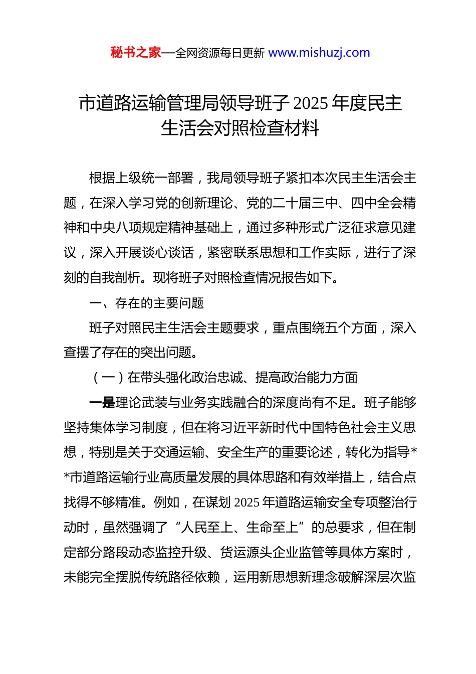 秘书之家—全网资源每日更新 www.mishuzj.com市道路运输管理局领导班子 2025 年度民主生活会对照检查材料 根据上级统一部署,我局领导班子紧扣本次民主生活会主题,在深入学习党的创新理论、党的二十届三中、四中全会精神和中央八项规定精神基础上,通过多种形式广泛征求意见建议,深入开展谈心谈话,紧密联系思想和工作实际,进行了深刻的自我剖析。现将班子对照检查情况报告如下。一、存在的主要问题班子对照民主生活会主题要求,重点围绕五个方面,深入查摆了存在的突出问题。(一)在带头强化政治忠诚、提高政治能力方面一是理论武装与业务实践融合的深度尚有不足。班子能够坚持集体学习制度,但在将习近平新时代中国特色社会主义思想,特别是关于交通运输、安全生产的重要论述,转化为指导**市道路运输行业高质量发展的具体思路和有效举措上,结合点找得不够精准。例如,在谋划 2025 年道路运输安全专项整治行动时,虽然强调了“人民至上、生命至上”的总要求,但在制定部分路段动态监控升级、货运源头企业监管等具体方案时,未能完全摆脱传统路径依赖,运用新思想新理念破解深层次监秘书之家—全网资源每日更新 www.mishuzj.com管难题的主动性、创新性有待加强,导致部分措施的前瞻性和系统性略显不足。二是政治判断力、领悟力、执行力在应对复杂局面时存在温差。面对道路运输市场新业态、新模式带来的监管挑战,班子有时未能第一时间从政治高度审视风险、研判形势。例如,在处理网约车合规化进程与稳定就业、保障民生等多重目标平衡问题时,虽然坚决执行上级部署,但在结合本市实际创造性地落实政策、提前介入化解潜在社会风险方面,思考谋划不够周全,政策宣传解读的穿透力不够强,致使部分工作推进中遇到了预期之外的阻力,影响了整体效果。三是在贯彻落实党中央决策部署及省委、市委工作要求上,存在“最后一公里”不够畅通的现象。班子能够做到令行禁止,但在将大政方针细化为本部门可操作、可考核的具体任务时,有时存在机械传导、简单分解的情况。比如,在落实“稳定、发展、生态、强边”四件大事中涉及运输结构调整、绿色交通发展的要求时,更多着眼于完成年度指标任务,对如何建立长效机制、激发市场主体内生动力缺乏系统性的顶层设计和持续跟踪问效,工作成效的巩固提升面临压力。(二)在带头固本培元、增强党性方面一是理想信念的“总开关”在日常工作中拧得不够紧。班秘书之家—全网资源每日更新 www.mishuzj.com子成员能够坚守共产党人精神追求,但在繁重的业务工作压力下,有时不自觉地放松了党性修养的持续锤炼,将更多精力放在了具体事务上。例如,在面对长期存在的非法营运整治难题时,个别同志偶尔会产生畏难情绪和“歇歇脚”的想法,认为这是全国性普遍问题,难以根治,攻坚克难的锐气和“钉钉子”精神有所减退,未能始终以最坚定的党性原则要求自己迎难而上。二是运用党性原则修身律己的标准有时不够严格。班子能够认真学习党章党规党纪,但在对照检视、反躬自省上主动性、深刻性有待提升。例如,在公务接待、会议活动等方面,虽然严格遵守了规定标准,但在倡导勤俭节约、反对铺张浪费的细节上,要求不够严苛,对一些非必要的办公消耗、资源浪费现象提醒制止不够及时有力,艰苦奋斗、勤俭办事的优良传统在思想深处扎根不够牢固。三是在传承红色基因、弘扬优良作风上表率作用发挥不够充分。班子成员注重个人品德修养,但在带动全局党员干部加强党性锻炼、提升精神境界方面,形式不够丰富,载体不够新颖。例如,在组织开展主题党日活动时,有时局限于参观学习、理论宣讲,未能深入挖掘本地红色交通史、先进模范事迹等资源,将其有效融入干部职工的日常教育管理,党性教育的感染秘书之家—全网资源每日更新 www.mishuzj.com力、实效性有待进一步增强。(三)在带头敬畏人民、敬畏组织、敬畏法纪方面一是走好新时代群众路线的具体实践不够深入扎实。虽然落实了“四下基层”制度,但有时调研走访存在“走马观花”现象,真正沉到运输企业、客运站场、驾驶员群体中倾听原汁原味呼声、了解急难愁盼问题的时间和深度不够。例如,在优化调整主城区公交线...