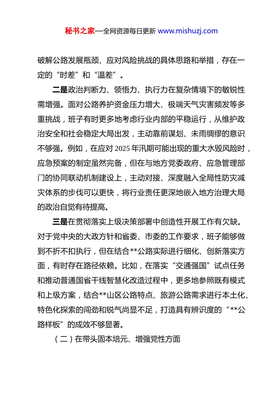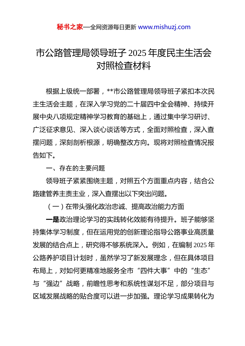 秘书之家—全网资源每日更新 www.mishuzj.com市公路管理局领导班子 2025 年度民主生活会对照检查材料 根据上级统一部署,**市公路管理局领导班子紧扣本次民主生活会主题,在深入学习党的二十届四中全会精神、持续开展中央八项规定精神学习教育的基础上,通过集中学习研讨、广泛征求意见、深入谈心谈话等方式,全面对照检查,深入查摆问题,深刻剖析根源,明确整改方向。现将对照检查情况报告如下。一、存在的主要问题领导班子紧紧围绕主题,对照五个方面重点内容,结合公路建管养主责主业,深入查摆出以下突出问题。(一)在带头强化政治忠诚、提高政治能力方面一是政治理论学习的实践转化效能有待提升。班子能够坚持集体学习制度,但在运用党的创新理论指导公路事业高质量发展的结合点上,研究得不够系统深入。例如,在编制 2025 年公路养护项目计划时,虽然学习了新发展理念,但在具体项目布局上,对如何更精准地服务全市“四件大事”中的“生态”与“强边”战略,前瞻性思考和系统性谋划不足,部分项目与区域发展战略的贴合度可以进一步加强。理论学习成果转化为秘书之家—全网资源每日更新 www.mishuzj.com破解公路发展瓶颈、应对风险挑战的具体思路和举措,存在一定的“时差”和“温差”。二是政治判断力、领悟力、执行力在复杂情境下的敏锐性需增强。面对公路养护资金压力增大、极端天气灾害频发等多重挑战,班子有时更多地考虑行业内部的平稳运行,从维护政治安全和社会稳定大局出发,主动靠前谋划、未雨绸缪的意识不够强。例如,在应对 2025 年汛期可能出现的重大水毁风险时,应急预案的制定虽然完备,但在与地方党委政府、应急管理部门的协同联动机制建设上,主动对接、深度融入全局性防灾减灾体系的步伐可以更快,将行业责任更深地嵌入地方治理大局的政治自觉有待提高。三是在贯彻落实上级决策部署中创造性开展工作有欠缺。对于党中央的大政方针和省委、市委的工作要求,班子能够做到不折不扣执行,但在结合**公路实际进行细化、创新落实方面,有时存在路径依赖。比如,在落实“交通强国”试点任务和推动普通国省干线智慧化改造过程中,更多地参照既有模式和上级方案,结合**山区公路特点、旅游公路需求进行本土化、特色化探索的闯劲和锐气尚显不足,打造具有辨识度的“**公路样板”的成效不够显著。(二)在带头固本培元、增强党性方面秘书之家—全网资源每日更新 www.mishuzj.com一是党性锻炼的主动性和常态化机制需巩固。班子成员能够参加组织生活,但以普通党员身份自觉接受支部监督、在严肃的党内政治生活中锤炼党性的主动性时有起伏。例如,在参加所在党支部的主题党日活动时,有时因业务工作繁忙,准备发言提纲不够充分,与普通党员进行思想交流、开展批评与自我批评的深度有待加强,未能时刻将加强政治修养摆在党性锤炼的首位。二是理想信念教育融入日常管理监督的渗透力不强。班子注重集中性的主题教育,但在将坚定理想信念、铸牢对党忠诚的要求融入干部日常考核、项目审计、效能督查等环节方面,抓手不多、效果不显。例如,在 2025 年部分养护工程项目过程监管中,更多关注工程质量、进度和资金安全,对参建单位党员干部在项目中表现出的工作作风、担当精神背后的理想信念因素,考察和分析不够深入,未能完全做到“见人见事见思想”。三是运用党章党规党纪进行自我检视的标尺不够严格。班子能够组织学习党章党规,但在运用其衡量自身言行、校正工作偏差上,有时存在“底线思维”强于“高线追求”的现象。例如,在公务接待、会议举办中,能够严格遵守相关标准,但在如何进一步精简文件简报、改进会风文风,为基层减负松绑秘书之家—全网资源每日更新 www.mishuzj.com方面,对照党章关于“密切联系群众”的要求进行深刻反思和主动革新的力度还需加大,满足于“不违规”而非追求“更高效”。(三)在带头敬畏人民、敬畏组织、敬畏法纪方面一是践行“四下基层”制度、解决群众急难愁盼问题的精准度有待提高。班子建立了基层联系点,也定期开展调研,但有时调研行程安排较满,与一线养路职工、公路沿线群众“坐下来”深入聊家常、听原声的时间相对不足...