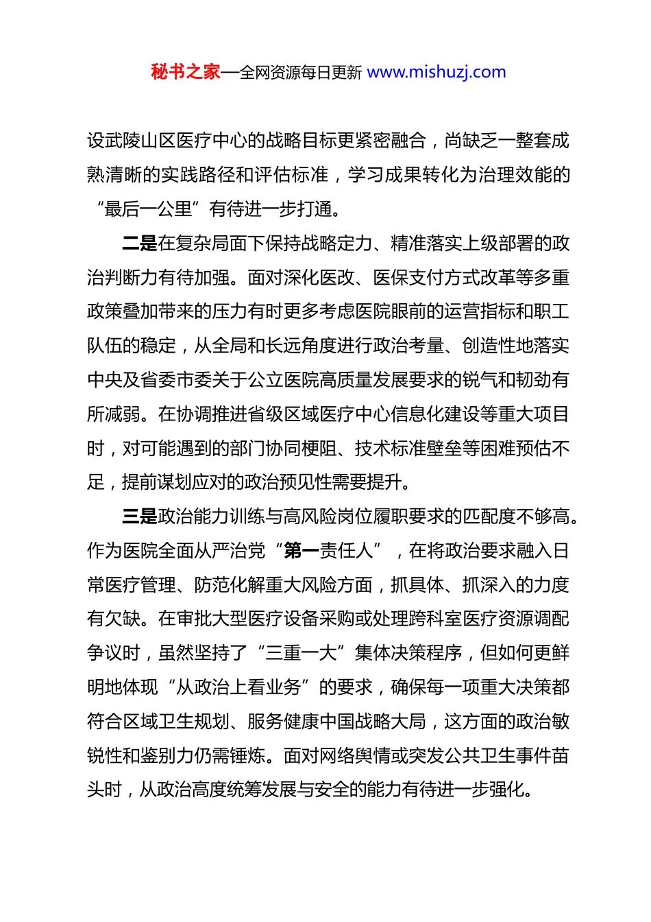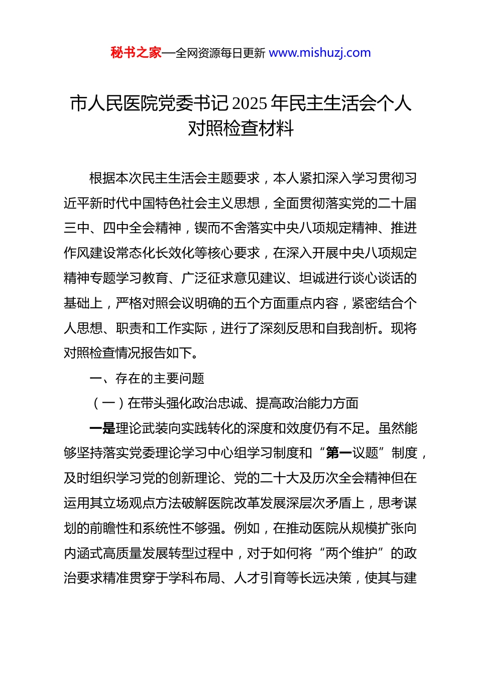 秘书之家—全网资源每日更新 www.mishuzj.com市人民医院党委书记 2025 年民主生活会个人对照检查材料 根据本次民主生活会主题要求,本人紧扣深入学习贯彻习近平新时代中国特色社会主义思想,全面贯彻落实党的二十届三中、四中全会精神,锲而不舍落实中央八项规定精神、推进作风建设常态化长效化等核心要求,在深入开展中央八项规定精神专题学习教育、广泛征求意见建议、坦诚进行谈心谈话的基础上,严格对照会议明确的五个方面重点内容,紧密结合个人思想、职责和工作实际,进行了深刻反思和自我剖析。现将对照检查情况报告如下。一、存在的主要问题(一)在带头强化政治忠诚、提高政治能力方面一是理论武装向实践转化的深度和效度仍有不足。虽然能够坚持落实党委理论学习中心组学习制度和“第一议题”制度,及时组织学习党的创新理论、党的二十大及历次全会精神但在运用其立场观点方法破解医院改革发展深层次矛盾上,思考谋划的前瞻性和系统性不够强。例如,在推动医院从规模扩张向内涵式高质量发展转型过程中,对于如何将“两个维护”的政治要求精准贯穿于学科布局、人才引育等长远决策,使其与建秘书之家—全网资源每日更新 www.mishuzj.com设武陵山区医疗中心的战略目标更紧密融合,尚缺乏一整套成熟清晰的实践路径和评估标准,学习成果转化为治理效能的“最后一公里”有待进一步打通。二是在复杂局面下保持战略定力、精准落实上级部署的政治判断力有待加强。面对深化医改、医保支付方式改革等多重政策叠加带来的压力有时更多考虑医院眼前的运营指标和职工队伍的稳定,从全局和长远角度进行政治考量、创造性地落实中央及省委市委关于公立医院高质量发展要求的锐气和韧劲有所减弱。在协调推进省级区域医疗中心信息化建设等重大项目时,对可能遇到的部门协同梗阻、技术标准壁垒等困难预估不足,提前谋划应对的政治预见性需要提升。三是政治能力训练与高风险岗位履职要求的匹配度不够高。作为医院全面从严治党“第一责任人”,在将政治要求融入日常医疗管理、防范化解重大风险方面,抓具体、抓深入的力度有欠缺。在审批大型医疗设备采购或处理跨科室医疗资源调配争议时,虽然坚持了“三重一大”集体决策程序,但如何更鲜明地体现“从政治上看业务”的要求,确保每一项重大决策都符合区域卫生规划、服务健康中国战略大局,这方面的政治敏锐性和鉴别力仍需锤炼。面对网络舆情或突发公共卫生事件苗头时,从政治高度统筹发展与安全的能力有待进一步强化。秘书之家—全网资源每日更新 www.mishuzj.com(二)在带头固本培元、增强党性方面一是以创新理论凝心铸魂的主动性、系统性有差距。虽然能够带头参加集中学习,但在个人自学上投入的精力不够均衡,满足于完成“规定动作”,对习近平新时代中国特色社会主义思想特别是关于卫生健康工作的重要论述,缺乏“挤”和“钻”的精神,对其蕴含的世界观、方法论掌握不够透彻。在运用党的创新理论改造主观世界、解决“总开关”问题上,与革命先辈和先进典型相比,自我革命的精神和境界存在不足,有时不自觉地用业务工作代替党性锻炼。二是在严肃党内政治生活、锤炼坚强党性上标准不够严格。在执行民主集中制、开展批评与自我批评时,有时存在“好人主义”思想,在党委会上讨论敏感议题或对班子成员提出批评意见时,顾及情面、点到为止的情况偶有发生,未能完全达到“红脸出汗、排毒治病”的效果。对照党章党规党纪进行自我检视的经常性、自觉性不够,对自身存在的一些细小作风问题,警惕性不高,未能做到防微杜渐。三是党性修养与密切联系群众的实践结合不够紧密。虽然深知“人民至上、生命至上”是卫生健康工作的根本遵循,但在实际工作中,坐在办公室听汇报、看材料的时间相对较多,主动深入临床一线、深入患者中间,与普通医护员工和就诊群秘书之家—全网资源每日更新 www.mishuzj.com众面对面交流、心贴心沟通的频率和深度有待加强。在解决“停车难”“排队久”等患者反映强烈的“急难愁盼”问题时,有时依赖于职能部门报告,未能亲自体验流程、查找症结,全心全意为人民服务的宗旨意识在具体行动中的体现不够充分和鲜活。(三)在带...