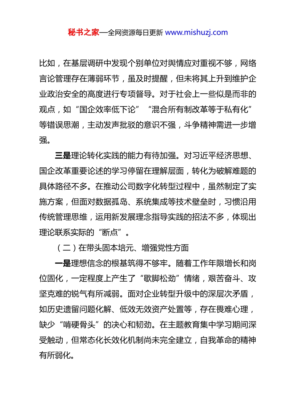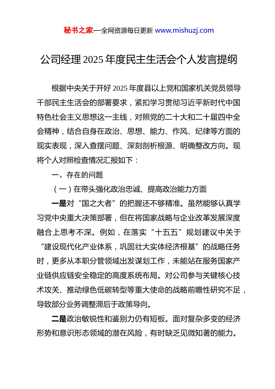秘书之家—全网资源每日更新 www.mishuzj.com公司经理 2025 年度民主生活会个人发言提纲 根据中央关于开好 2025 年度县以上党和国家机关党员领导干部民主生活会的部署要求,紧扣学习贯彻习近平新时代中国特色社会主义思想这一主线,对照党的二十大和二十届四中全会精神,结合自身在政治、思想、能力、作风、纪律等方面的现实表现,深入查摆问题、深刻剖析根源、明确整改方向。现将个人对照检查情况汇报如下:一、存在的问题(一)在带头强化政治忠诚、提高政治能力方面一是对“国之大者”的把握还不够精准。虽然能够认真学习党中央重大决策部署,但在将国家战略与企业改革发展深度融合上思考不深。例如,在落实“十五五”规划建议中关于“建设现代化产业体系,巩固壮大实体经济根基”的战略任务时,更多从本职分管领域出发谋划工作,未能站在服务国家产业链供应链安全稳定的高度系统布局。对公司参与关键核心技术攻关、推动绿色低碳转型等重大使命的战略前瞻性研究不足,导致部分业务调整滞后于政策导向。二是政治敏锐性和鉴别力仍有短板。面对复杂多变的经济形势和意识形态领域的潜在风险,有时缺乏见微知著的能力。秘书之家—全网资源每日更新 www.mishuzj.com比如,在基层调研中发现个别单位对舆情应对重视不够,网络言论管理存在薄弱环节,虽及时提醒,但未将其上升到维护企业政治安全的高度进行专项督导。对于社会上一些似是而非的观点,如“国企效率低下论”“混合所有制改革等于私有化”等错误思潮,主动发声批驳的意识不强,斗争精神需进一步增强。三是理论转化实践的能力有待加强。对习近平经济思想、国企改革重要论述的学习停留在理解层面,转化为破解难题的具体路径不多。在推动公司数字化转型过程中,虽然制定了实施方案,但面对数据孤岛、系统集成等技术壁垒时,习惯沿用传统管理思维,运用新发展理念指导实践的招法不多,体现出理论联系实际的“断点”。(二)在带头固本培元、增强党性方面一是理想信念的根基筑得不够牢。随着工作年限增长和岗位固化,一定程度上产生了“歇脚松劲”情绪,艰苦奋斗、攻坚克难的锐气有所减弱。面对企业转型升级中的深层次矛盾,如历史遗留问题化解、低效无效资产处置等,存在畏难心理,缺少“啃硬骨头”的决心和韧劲。在主题教育集中学习期间深受触动,但常态化长效化机制尚未完全建立,自我革命的精神有所弱化。秘书之家—全网资源每日更新 www.mishuzj.com二是批评和自我批评武器运用不充分。在班子内部开展相互批评时,顾虑较多,怕影响团结、伤了和气,往往点到为止、“辣味”不足。比如在讨论某重点项目投资决策时,明知存在市场风险,但出于支持主要领导工作考虑,未充分表达反对意见,反映出党性原则向人情世故妥协的现象。对分管部门党员干部的日常监督提醒也不够经常,谈心谈话多以工作交流为主,触及思想灵魂少。三是宗旨意识树得不牢固。虽然定期下基层调研,但“走马观花”式走访仍占一定比例,真正沉下去听真话、察实情不够。2025 年共开展调研 18 次,其中三分之一为陪同上级检查或出席活动,自主性专题调研偏少。对一线职工反映强烈的薪酬激励机制不合理、职业发展通道狭窄等问题,协调推动解决的力度不够,距离“把职工冷暖放在心上”还有差距。(三)在带头敬畏人民、敬畏组织、敬畏法纪方面在敬畏人民方面,群众观念有待加强。作为企业领导,服务对象不仅是出资人和股东,更包括广大员工和客户群体。但在实际履职中,对企业经济效益指标关注多,对员工幸福感获得感关注少。例如,公司在 2025 年实现营业收入同比增长7.3%的同时,员工满意度测评仅提升 1.2 个百分点,说明发展成果惠及职工还不够充分。对于客户投诉处理机制运行情况掌秘书之家—全网资源每日更新 www.mishuzj.com握不细,未能有效构建“以客户为中心”的服务体系闭环。在敬畏组织方面,执行民主集中制有偏差。在参与重大事项决策时,能够遵守议事规则,但有时为了提高效率,倾向于先形成个人倾向性意见再征求意见,客观上影响了集体智慧的充分发挥。在干部推荐使用上,更多考虑工作熟悉度和配合默契度,对跨部门交流任职的年轻干部...