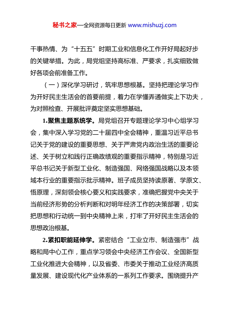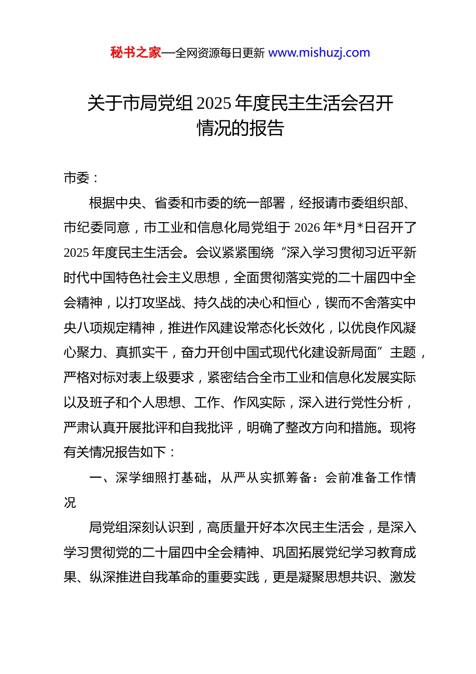 秘书之家—全网资源每日更新 www.mishuzj.com关于市局党组 2025 年度民主生活会召开情况的报告 市委:根据中央、省委和市委的统一部署,经报请市委组织部、市纪委同意,市工业和信息化局党组于 2026 年*月*日召开了2025 年度民主生活会。会议紧紧围绕“深入学习贯彻习近平新时代中国特色社会主义思想,全面贯彻落实党的二十届四中全会精神,以打攻坚战、持久战的决心和恒心,锲而不舍落实中央八项规定精神,推进作风建设常态化长效化,以优良作风凝心聚力、真抓实干,奋力开创中国式现代化建设新局面”主题,严格对标对表上级要求,紧密结合全市工业和信息化发展实际以及班子和个人思想、工作、作风实际,深入进行党性分析,严肃认真开展批评和自我批评,明确了整改方向和措施。现将有关情况报告如下:一、深学细照打基础,从严从实抓筹备:会前准备工作情况局党组深刻认识到,高质量开好本次民主生活会,是深入学习贯彻党的二十届四中全会精神、巩固拓展党纪学习教育成果、纵深推进自我革命的重要实践,更是凝聚思想共识、激发秘书之家—全网资源每日更新 www.mishuzj.com干事热情、为“十五五”时期工业和信息化工作开好局起好步的关键举措。为此,局党组坚持高标准、严要求,扎实细致做好各项会前准备工作。(一)深化学习研讨,筑牢思想根基。坚持把理论学习作为开好民主生活会的首要前提,着力在学懂弄通做实上下功夫,为对照检查、开展批评奠定坚实思想基础。1.聚焦主题系统学。局党组召开专题理论学习中心组学习会,集中深入学习党的二十届四中全会精神,重温习近平总书记关于党的建设的重要思想、关于严肃党内政治生活的重要论述、关于树立和践行正确政绩观的重要指示精神,特别是习近平总书记关于新型工业化、制造强国、网络强国战略以及本领域本行业的重要指示批示精神。班子成员坚持读原著、学原文、悟原理,深刻领会核心要义和实践要求,准确把握党中央关于当前经济形势的分析判断和对明年经济工作的决策部署,切实把思想和行动统一到中央精神上来,打牢了开好民主生活会的思想政治根基。2.紧扣职能延伸学。紧密结合“工业立市、制造强市”战略和局中心工作,重点学习领会中央经济工作会议、全国新型工业化推进大会精神,以及省委、市委关于推动工业经济高质量发展、建设现代化产业体系的一系列工作要求。围绕提升产秘书之家—全网资源每日更新 www.mishuzj.com业链供应链韧性和安全水平、推动制造业智能化改造数字化转型、培育壮大战略性新兴产业和未来产业、促进中小企业专精特新发展等核心职能开展研讨,班子成员结合分管领域谈认识、讲体会、谋思路,努力做到学思用贯通、知信行统一。3.对照镜鉴反思学。组织学习《中国共产党章程》《关于新形势下党内政治生活的若干准则》《中国共产党纪律处分条例》等党内法规,传达学习中央和省委、市委关于违反中央八项规定精神典型问题的通报。通过正反两方面镜鉴,引导班子成员深刻认识全面从严治党、加强作风建设的极端重要性,增强纪律意识、规矩意识,自觉对标对表,检视自身在思想境界、党性修养、作风形象方面存在的差距,为深入查摆问题提供了重要参照。(二)广泛征求意见,找准突出问题。坚持开门纳谏,广开言路,多渠道、多层次征求各方面意见建议,力求把问题找全、找准、找实。1.深入基层一线听。局党组班子成员结合分管工作,带头深入园区、企业、项目现场开展调研走访。聚焦企业在生产经营、要素保障、政策落地、营商环境等方面面临的困难和诉求,与服务对象面对面交流,心贴心沟通。通过实地察看、座谈访谈等形式,直接听取基层党员干部、企业家、技术专家、一线秘书之家—全网资源每日更新 www.mishuzj.com工人代表的意见建议,掌握第一手资料,了解真实情况。2.书面发函广泛求。以局党组名义,向市直相关单位、各县(市、区)工业和信息化主管部门、部分重点工业企业、行业协会及服务对象等,发放征求意见函。重点围绕局党组班子及成员在学习贯彻党的创新理论、履行核心职能、服务发展大局、贯彻中央八项规定精神及其实施细则、廉洁自律等方面存在的问题,以及改进作风、改进工作的建议,进行书面...
