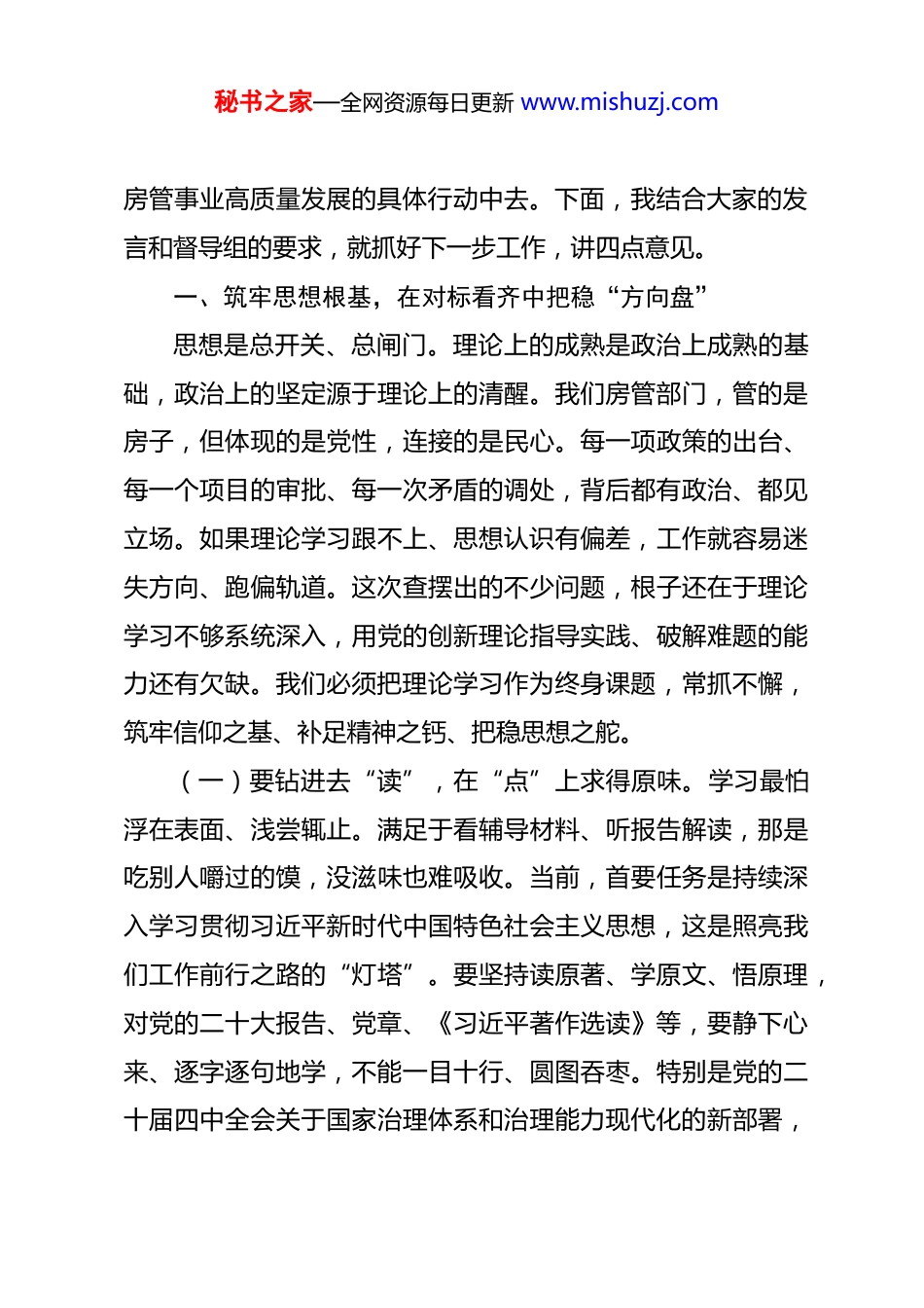 秘书之家—全网资源每日更新 www.mishuzj.com局党组书记、局长在 2025 年度党员领导干部民主生活会上的总结讲话 同志们:刚才,我代表班子作了对照检查,并带头作了个人剖析,各位党组成员也都逐一作了发言,大家敞开心扉、坦诚相见,进行了积极健康的思想斗争。总的看,这次民主生活会,会前准备充分,学习研讨、征求意见、谈心谈话都比较扎实;会上查摆问题实在,相互批评有“辣味”,原因剖析触及思想,整改方向比较明确,体现了对党忠诚、对事业负责的态度,达到了“团结—批评—团结”的目的。特别是督导组*组长、*副组长亲临指导,给予了中肯点评,提出了明确要求,这是对我们班子和个人的关心爱护,更是对我们下一步工作的有力鞭策。我们要认真学习领会,坚决贯彻落实。民主生活会开得好不好,关键看“后半篇文章”做得实不实。查摆问题只是起点,整改落实才是关键,推动发展才是目的。我们不能“会上激动、会后不动”,更不能“问题清单挂在墙上、整改措施停在纸上”。必须以这次民主生活会为新的开端,把会议上激发出来的政治热情、剖析出来的问题短板、凝聚起来的共识合力,全部转化到狠抓落实、攻坚克难、推动*秘书之家—全网资源每日更新 www.mishuzj.com房管事业高质量发展的具体行动中去。下面,我结合大家的发言和督导组的要求,就抓好下一步工作,讲四点意见。一、筑牢思想根基,在对标看齐中把稳“方向盘”思想是总开关、总闸门。理论上的成熟是政治上成熟的基础,政治上的坚定源于理论上的清醒。我们房管部门,管的是房子,但体现的是党性,连接的是民心。每一项政策的出台、每一个项目的审批、每一次矛盾的调处,背后都有政治、都见立场。如果理论学习跟不上、思想认识有偏差,工作就容易迷失方向、跑偏轨道。这次查摆出的不少问题,根子还在于理论学习不够系统深入,用党的创新理论指导实践、破解难题的能力还有欠缺。我们必须把理论学习作为终身课题,常抓不懈,筑牢信仰之基、补足精神之钙、把稳思想之舵。(一)要钻进去“读”,在“点”上求得原味。学习最怕浮在表面、浅尝辄止。满足于看辅导材料、听报告解读,那是吃别人嚼过的馍,没滋味也难吸收。当前,首要任务是持续深入学习贯彻习近平新时代中国特色社会主义思想,这是照亮我们工作前行之路的“灯塔”。要坚持读原著、学原文、悟原理,对党的二十大报告、党章、《习近平著作选读》等,要静下心来、逐字逐句地学,不能一目十行、圆图吞枣。特别是党的二十届四中全会关于国家治理体系和治理能力现代化的新部署,秘书之家—全网资源每日更新 www.mishuzj.com习近平总书记关于城市工作、住房工作的重要论述和考察上海重要讲话精神,与我们房管工作息息相关,更要反复钻研、深刻领会。要像老农锄地一样,一锄头一锄头地深耕,才能触及理论的“根须”,品出思想的“原味”,真正掌握其核心要义和精神实质。(二)要跳出来“悟”,在“线”上贯通逻辑。理论学习不能碎片化、孤立化。习近平新时代中国特色社会主义思想是一个博大精深、逻辑严密的科学体系,各项内容相互关联、有机统一。我们要善于“连线成面”,把学习党的创新理论,同学习马克思主义基本原理贯通起来,同回顾党百年奋斗的光辉历程、特别是新时代的伟大变革贯通起来,同贯彻落实市委、区委全会作出的各项决策部署贯通起来。思考住房保障体系建设,要放到促进共同富裕、健全社会保障的大背景下去考量;谋划城市更新行动,要放在践行“人民城市”理念、推动高质量发展的大格局中去把握;处理房地产领域问题,要站在统筹发展和安全、维护社会稳定的政治高度去研判。只有贯通起来学,才能看清理论演进的历史逻辑、实践发展的现实逻辑,做到知其然更知其所以然,提升我们观大势、谋大局、抓大事的能力。(三)要融进去“用”,在“面”上转化实践。学习的最秘书之家—全网资源每日更新 www.mishuzj.com终目的在于运用,在于解决实际问题。“纸上得来终觉浅,绝知此事要躬行。”我们决不能学归学、做归做,搞成“两张皮”。要坚持学以致用、用以促学、学用相长。局党组理论学习中心组要带好头,今后的学习研讨,要更多地聚焦房管领域的现...