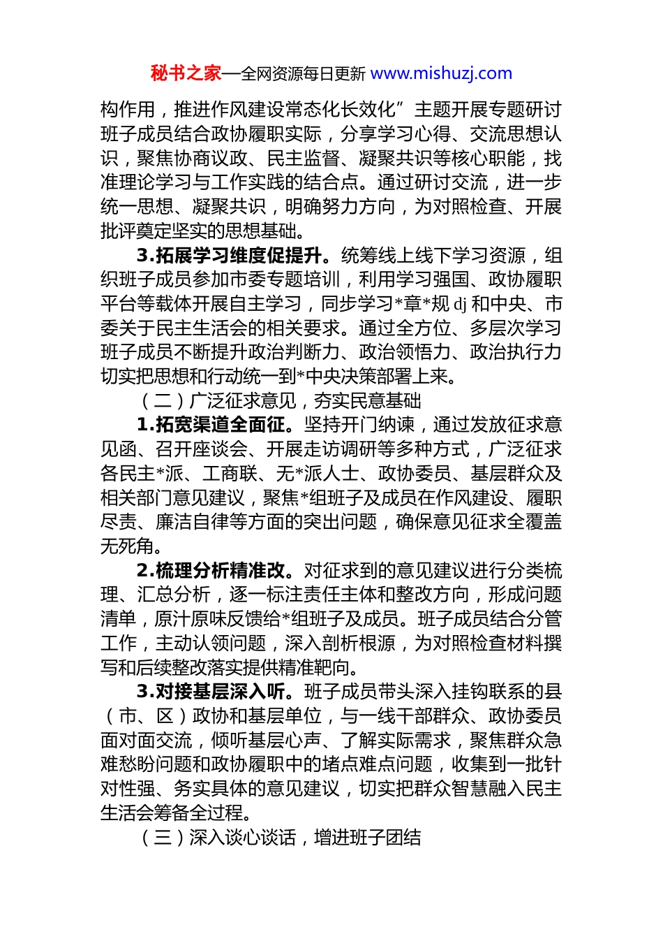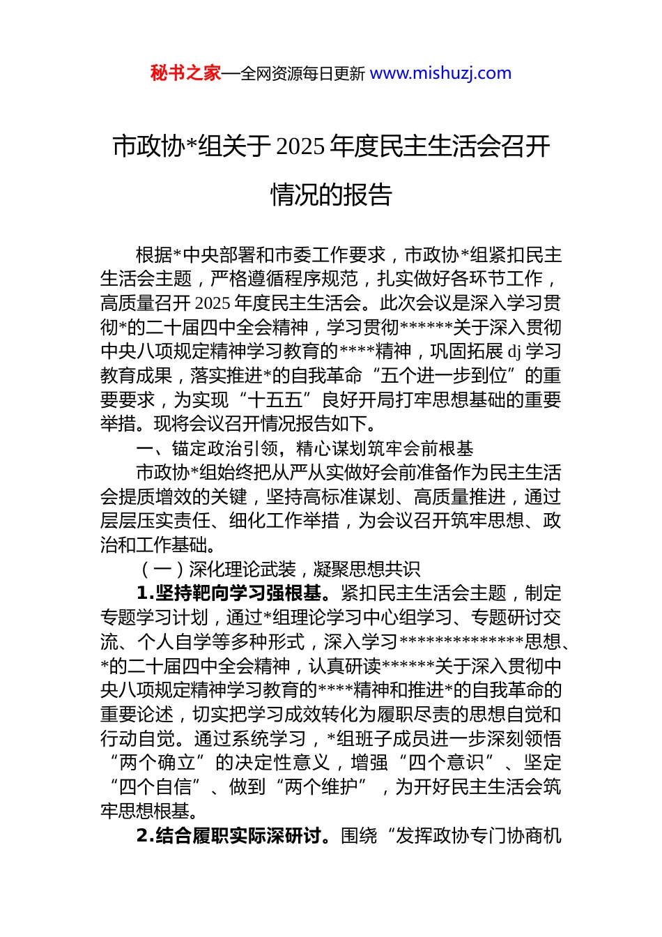 秘书之家—全网资源每日更新 www.mishuzj.com市政协*组关于 2025 年度民主生活会召开情况的报告根据*中央部署和市委工作要求,市政协*组紧扣民主生活会主题,严格遵循程序规范,扎实做好各环节工作,高质量召开 2025 年度民主生活会。此次会议是深入学习贯彻*的二十届四中全会精神,学习贯彻******关于深入贯彻中央八项规定精神学习教育的****精神,巩固拓展 dj 学习教育成果,落实推进*的自我革命“五个进一步到位”的重要要求,为实现“十五五”良好开局打牢思想基础的重要举措。现将会议召开情况报告如下。一、锚定政治引领,精心谋划筑牢会前根基市政协*组始终把从严从实做好会前准备作为民主生活会提质增效的关键,坚持高标准谋划、高质量推进,通过层层压实责任、细化工作举措,为会议召开筑牢思想、政治和工作基础。(一)深化理论武装,凝聚思想共识1.坚持靶向学习强根基。紧扣民主生活会主题,制定专题学习计划,通过*组理论学习中心组学习、专题研讨交流、个人自学等多种形式,深入学习**************思想、*的二十届四中全会精神,认真研读******关于深入贯彻中央八项规定精神学习教育的****精神和推进*的自我革命的重要论述,切实把学习成效转化为履职尽责的思想自觉和行动自觉。通过系统学习,*组班子成员进一步深刻领悟“两个确立”的决定性意义,增强“四个意识”、坚定“四个自信”、做到“两个维护”,为开好民主生活会筑牢思想根基。2.结合履职实际深研讨。围绕“发挥政协专门协商机秘书之家—全网资源每日更新 www.mishuzj.com构作用,推进作风建设常态化长效化”主题开展专题研讨班子成员结合政协履职实际,分享学习心得、交流思想认识,聚焦协商议政、民主监督、凝聚共识等核心职能,找准理论学习与工作实践的结合点。通过研讨交流,进一步统一思想、凝聚共识,明确努力方向,为对照检查、开展批评奠定坚实的思想基础。3.拓展学习维度促提升。统筹线上线下学习资源,组织班子成员参加市委专题培训,利用学习强国、政协履职平台等载体开展自主学习,同步学习*章*规 dj 和中央、市委关于民主生活会的相关要求。通过全方位、多层次学习班子成员不断提升政治判断力、政治领悟力、政治执行力切实把思想和行动统一到*中央决策部署上来。(二)广泛征求意见,夯实民意基础1.拓宽渠道全面征。坚持开门纳谏,通过发放征求意见函、召开座谈会、开展走访调研等多种方式,广泛征求各民主*派、工商联、无*派人士、政协委员、基层群众及相关部门意见建议,聚焦*组班子及成员在作风建设、履职尽责、廉洁自律等方面的突出问题,确保意见征求全覆盖无死角。2.梳理分析精准改。对征求到的意见建议进行分类梳理、汇总分析,逐一标注责任主体和整改方向,形成问题清单,原汁原味反馈给*组班子及成员。班子成员结合分管工作,主动认领问题,深入剖析根源,为对照检查材料撰写和后续整改落实提供精准靶向。3.对接基层深入听。班子成员带头深入挂钩联系的县(市、区)政协和基层单位,与一线干部群众、政协委员面对面交流,倾听基层心声、了解实际需求,聚焦群众急难愁盼问题和政协履职中的堵点难点问题,收集到一批针对性强、务实具体的意见建议,切实把群众智慧融入民主生活会筹备全过程。(三)深入谈心谈话,增进班子团结秘书之家—全网资源每日更新 www.mishuzj.com1.坚持以上率下谈。*组书记带头与班子成员、各专委会主任开展谈心谈话,既谈工作问题也谈思想问题,既谈自身差距也提醒对方不足,做到推心置腹、坦诚相见。通过谈心谈话,进一步沟通思想、交换意见,凝聚班子合力。2.聚焦问题深入谈。班子成员之间相互谈心谈话,围绕民主生活会主题和征求到的意见建议,深入交流对班子建设和个人工作的看法,主动亮明自身存在的问题,诚恳指出对方存在的不足,共同探讨整改措施,为开展批评与自我批评营造良好氛围。3.结合分工针对性谈。班子成员与分管部门负责人、联系界别委员谈心谈话,结合政协履职重点,聚焦作风建设、协商效能等方面,听取意见建议、交流工作思路,切实把谈心谈话过程转化为统一思想、增进共识、推动工作的过程。(四)精准对照检查,严把材料质...