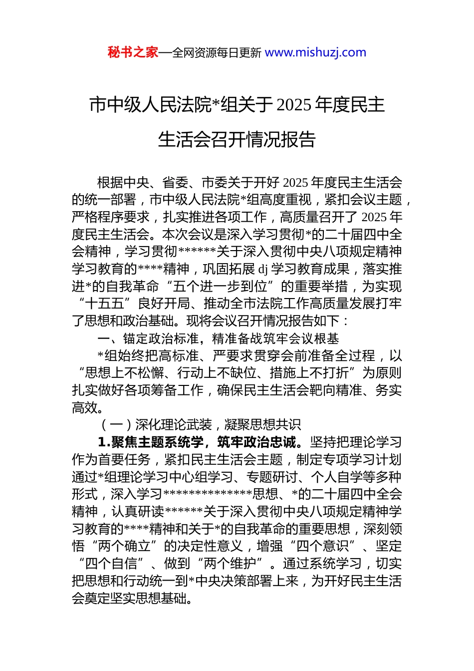 秘书之家—全网资源每日更新 www.mishuzj.com市中级人民法院*组关于 2025 年度民主生活会召开情况报告根据中央、省委、市委关于开好 2025 年度民主生活会的统一部署,市中级人民法院*组高度重视,紧扣会议主题,严格程序要求,扎实推进各项工作,高质量召开了 2025 年度民主生活会。本次会议是深入学习贯彻*的二十届四中全会精神,学习贯彻******关于深入贯彻中央八项规定精神学习教育的****精神,巩固拓展 dj 学习教育成果,落实推进*的自我革命“五个进一步到位”的重要举措,为实现“十五五”良好开局、推动全市法院工作高质量发展打牢了思想和政治基础。现将会议召开情况报告如下:一、锚定政治标准,精准备战筑牢会议根基*组始终把高标准、严要求贯穿会前准备全过程,以“思想上不松懈、行动上不缺位、措施上不打折”为原则扎实做好各项筹备工作,确保民主生活会靶向精准、务实高效。(一)深化理论武装,凝聚思想共识1.聚焦主题系统学,筑牢政治忠诚。坚持把理论学习作为首要任务,紧扣民主生活会主题,制定专项学习计划通过*组理论学习中心组学习、专题研讨、个人自学等多种形式,深入学习**************思想、*的二十届四中全会精神,认真研读******关于深入贯彻中央八项规定精神学习教育的****精神和关于*的自我革命的重要思想,深刻领悟“两个确立”的决定性意义,增强“四个意识”、坚定“四个自信”、做到“两个维护”。通过系统学习,切实把思想和行动统一到*中央决策部署上来,为开好民主生活会奠定坚实思想基础。秘书之家—全网资源每日更新 www.mishuzj.com2.结合实际精准学,提升履职能力。注重学用结合,将理论学习与法院审判执行主责主业深度融合,组织班子成员围绕“推进作风建设常态化长效化”“以司法之力服务中国式现代化”等课题开展研讨交流。结合最高法关于作风建设的工作要求,对照司法审判工作中的短板弱项,深入思考破解思路,切实把学习成果转化为推动工作的实际举措,不断提升运用*的创新理论指导司法实践的能力。3.对照要求深入学,强化纪律意识。专题学习《中国共产 dj 律处分条例》《中央八项规定及其实施细则精神》等*内法规制度,结合典型案例开展警示教育,引导班子成员以反面典型为镜鉴,深刻检视自身在作风建设、廉洁自律等方面存在的问题,进一步强化纪律观念和规矩意识,自觉用 dj*规约束言行,巩固拓展 dj 学习教育成果。(二)广泛征求意见,畅通民意渠道1.多维度征集,确保意见全面。坚持开门纳谏,通过发放征求意见函、召开座谈会、设置意见箱、走访调研等多种方式,面向全市法院系统、人大代表、政协委员、律师代表及案件当事人等不同群体,广泛征求对*组班子及成员的意见建议。重点围绕落实中央八项规定精神、推进作风建设、履行司法职能等方面,全面梳理汇总意见建议,为查摆问题提供精准依据。2.深层次梳理,聚焦问题关键。对征集到的意见建议进行分类梳理、汇总分析,去粗取精、去伪存真,精准提炼出班子及成员在思想作风、工作作风、司法服务、廉洁自律等方面存在的突出问题。建立意见建议台账,明确整改方向,确保征求到的意见真正反映实情、体现民意,为对照检查和批评整改找准靶心。3.点对点反馈,强化问题导向。将梳理后的意见建议逐一反馈给*组班子及成员,引导班子成员主动认领问题、对号入座,结合分管工作深入反思,深刻剖析问题根源。通过意见反馈,进一步增强班子成员的问题意识,为民主秘书之家—全网资源每日更新 www.mishuzj.com生活会上开展严肃批评和自我批评做好铺垫。(三)深入谈心谈话,增进班子团结1.主要领导带头谈,压实政治责任。*组书记与班子成员逐一开展谈心谈话,既谈工作问题,也谈思想问题,既谈自身差距,也提醒对方不足,做到敞开心扉、坦诚相见重点了解班子成员的思想动态、工作情况和整改打算,带头查摆自身存在的问题,主动听取批评意见,为全体班子成员作出表率。2.班子成员相互谈,凝聚工作合力。班子成员之间本着“团结—批评—团结”的原则,开展一对一、面对面谈心谈话,深入交流思想、沟通情况,相互指出存在的问题和不足,共同探讨整改措施。通过谈心谈话,消除隔阂...