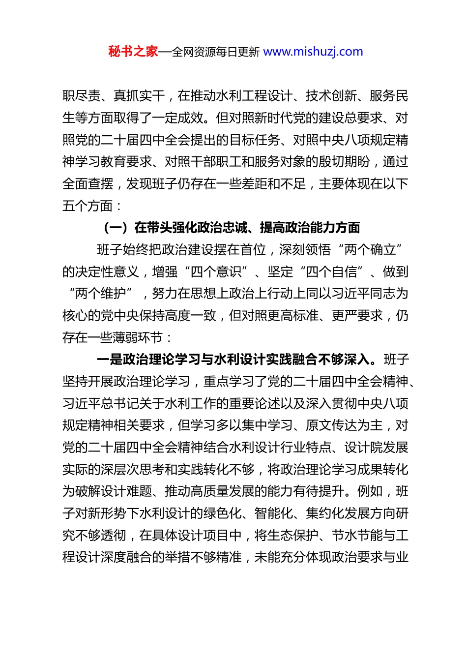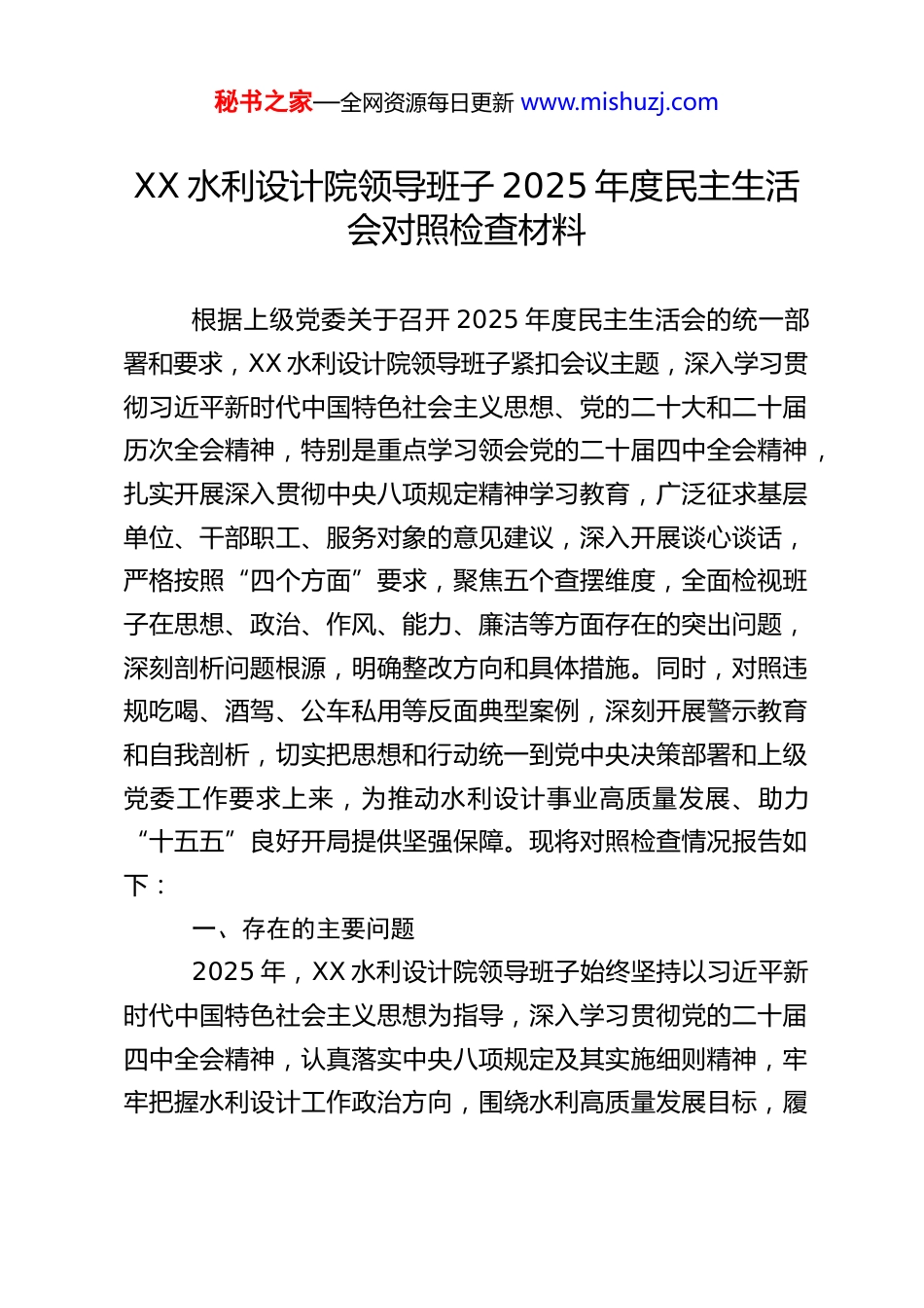 秘书之家—全网资源每日更新 www.mishuzj.comXX 水利设计院领导班子 2025 年度民主生活会对照检查材料根据上级党委关于召开 2025 年度民主生活会的统一部署和要求,XX 水利设计院领导班子紧扣会议主题,深入学习贯彻习近平新时代中国特色社会主义思想、党的二十大和二十届历次全会精神,特别是重点学习领会党的二十届四中全会精神,扎实开展深入贯彻中央八项规定精神学习教育,广泛征求基层单位、干部职工、服务对象的意见建议,深入开展谈心谈话,严格按照“四个方面”要求,聚焦五个查摆维度,全面检视班子在思想、政治、作风、能力、廉洁等方面存在的突出问题,深刻剖析问题根源,明确整改方向和具体措施。同时,对照违规吃喝、酒驾、公车私用等反面典型案例,深刻开展警示教育和自我剖析,切实把思想和行动统一到党中央决策部署和上级党委工作要求上来,为推动水利设计事业高质量发展、助力“十五五”良好开局提供坚强保障。现将对照检查情况报告如下:一、存在的主要问题2025 年,XX 水利设计院领导班子始终坚持以习近平新时代中国特色社会主义思想为指导,深入学习贯彻党的二十届四中全会精神,认真落实中央八项规定及其实施细则精神,牢牢把握水利设计工作政治方向,围绕水利高质量发展目标,履秘书之家—全网资源每日更新 www.mishuzj.com职尽责、真抓实干,在推动水利工程设计、技术创新、服务民生等方面取得了一定成效。但对照新时代党的建设总要求、对照党的二十届四中全会提出的目标任务、对照中央八项规定精神学习教育要求、对照干部职工和服务对象的殷切期盼,通过全面查摆,发现班子仍存在一些差距和不足,主要体现在以下五个方面:(一)在带头强化政治忠诚、提高政治能力方面班子始终把政治建设摆在首位,深刻领悟“两个确立”的决定性意义,增强“四个意识”、坚定“四个自信”、做到“两个维护”,努力在思想上政治上行动上同以习近平同志为核心的党中央保持高度一致,但对照更高标准、更严要求,仍存在一些薄弱环节:一是政治理论学习与水利设计实践融合不够深入。班子坚持开展政治理论学习,重点学习了党的二十届四中全会精神、习近平总书记关于水利工作的重要论述以及深入贯彻中央八项规定精神相关要求,但学习多以集中学习、原文传达为主,对党的二十届四中全会精神结合水利设计行业特点、设计院发展实际的深层次思考和实践转化不够,将政治理论学习成果转化为破解设计难题、推动高质量发展的能力有待提升。例如,班子对新形势下水利设计的绿色化、智能化、集约化发展方向研究不够透彻,在具体设计项目中,将生态保护、节水节能与工程设计深度融合的举措不够精准,未能充分体现政治要求与业秘书之家—全网资源每日更新 www.mishuzj.com务工作的同频共振。二是政治能力建设针对性不够强。班子成员能够自觉严守党的政治纪律和政治规矩,但在面对复杂形势和具体问题时,政治判断力、政治领悟力、政治执行力仍有提升空间。面对水利设计行业市场化竞争加剧、技术创新压力增大、政策法规不断完善的新形势,班子有时过于关注业务指标完成情况,对一些工作的政治内涵把握不够深刻,从政治高度分析问题、解决问题的意识不够强。比如,在应对部分设计项目涉及的政策调整、群众诉求等复杂问题时,有时首先考虑的是技术可行性、经济效益,对其背后蕴含的政治要求、民生意义思考不够全面,未能始终站在践行“两个维护”、落实党中央水利工作部署的高度统筹推进工作,政治站位与工作实践结合不够紧密。三是贯彻落实党中央大政方针和决策部署不够有力。班子能够坚决贯彻落实党中央关于水利工作的决策部署和上级党委工作要求,但在落地见效上存在“温差”“落差”问题。例如,在推进小型水利工程标准化设计、农村供水保障工程设计等民生水利项目时,有时受前期调研不充分、部门协同不畅等因素影响,设计方案优化完善不够及时,项目推进进度未能完全达到预期;在落实上级关于“节水优先、空间均衡、系统治理、两手发力”的治水思路时,对节水型水利工程设计、水资源循环利用等方面的研究不够深入,相关设计标准和技术规范的完善滞后于政策要求,贯彻落实的主动性...