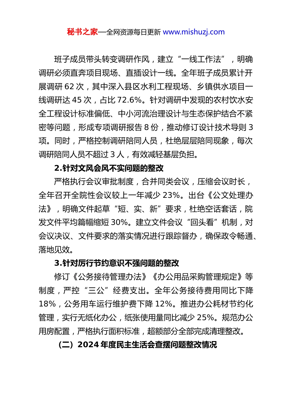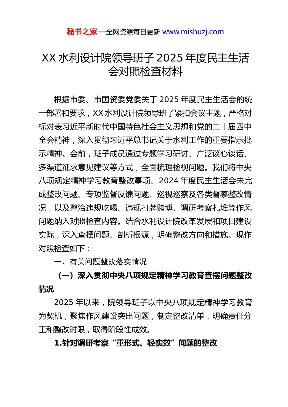 秘书之家—全网资源每日更新 www.mishuzj.comXX 水利设计院领导班子 2025 年度民主生活会对照检查材料根据市委、市国资委党委关于 2025 年度民主生活会的统一部署和要求,XX 水利设计院领导班子紧扣会议主题,严格对标对表习近平新时代中国特色社会主义思想和党的二十届四中全会精神,深入贯彻习近平总书记关于水利工作的重要指示批示精神。会前,班子成员通过专题学习研讨、广泛谈心谈话、多渠道征求意见建议等方式,全面梳理检视问题。我们将中央八项规定精神学习教育整改事项、2024 年度民主生活会未完成整改问题、专项监督反馈问题、巡视巡察及各类督察整改情况,以及整治违规吃喝、违规打牌赌博、调研考察扎堆等作风问题纳入对照检查内容。结合水利设计院改革发展和项目建设实际,深入查摆问题、剖析根源,明确整改方向和措施。现作对照检查如下:一、有关问题整改落实情况(一)深入贯彻中央八项规定精神学习教育查摆问题整改情况2025 年以来,院领导班子以中央八项规定精神学习教育为契机,聚焦作风建设突出问题,制定整改清单,明确责任分工和整改时限,取得阶段性成效。1.针对调研考察“重形式、轻实效”问题的整改秘书之家—全网资源每日更新 www.mishuzj.com班子成员带头转变调研作风,建立“一线工作法”,明确调研必须直奔项目现场、直插设计一线。全年班子成员累计开展调研 62 次,其中深入县区水利工程现场、乡镇供水项目一线调研达 45 次,占比 72.6%。针对调研中发现的农村饮水安全工程设计标准偏低、中小河流治理设计与生态保护结合不紧密等问题,形成专项调研报告 8 份,推动修订设计技术导则 3项。同时,严格控制调研陪同人员,杜绝层层陪同现象,每次调研陪同人员不超过 3 人,有效减轻基层负担。2.针对文风会风不实问题的整改严格执行会议审批制度,合并同类会议,压缩会议时长,全年召开全院性会议较上一年减少 23%。出台《公文处理办法》,明确文件起草“短、实、新”要求,杜绝空话套话,院发文件平均篇幅缩短 30%。建立文件会议“回头看”机制,对会议决议、文件要求的落实情况进行跟踪督办,确保政令畅通、落地见效。3.针对厉行节约意识不强问题的整改修订《公务接待管理办法》《办公用品采购管理规定》等制度,严控“三公”经费支出。全年公务接待费用同比下降18%,公务用车运行维护费下降 12%。推进办公耗材节约化管理,实行无纸化办公,纸张使用量同比减少 25%。规范办公用房配置,严格执行面积标准,超额部分全部完成清理整改。(二)2024 年度民主生活会查摆问题整改情况秘书之家—全网资源每日更新 www.mishuzj.com2024 年度民主生活会后,院领导班子将查摆的 6 个方面15 个具体问题纳入整改台账,实行销号管理,目前已完成整改12 项,剩余 3 项正在持续整改中。1.针对“政治理论学习与水利设计实践结合不紧密”问题的整改制定《领导班子理论学习中心组学习计划》,将习近平总书记关于治水兴水的重要论述作为核心学习内容,全年开展专题学习 12 次、研讨交流 6 次。班子成员带头撰写学习心得,结合分管工作开展“理论+实践”专题授课,累计为干部职工授课 8 场次。推动学习成果转化,将“节水优先、空间均衡、系统治理、两手发力”的治水思路融入设计工作,在 XX 水库扩容工程、XX 流域生态修复项目设计中,创新采用生态护坡、雨洪利用等新技术,实现经济效益与生态效益双赢。2.针对“水利设计创新能力不足”问题的整改成立院技术创新领导小组,设立创新专项基金,每年投入不低于营业收入的 3%用于技术研发。与 XX 大学水利工程学院、省水利科学研究院建立产学研合作机制,共建水利设计创新实验室。鼓励职工参与技术攻关,全年申报实用新型专利 12 项,发明专利 3 项,其中“一种新型河道生态护岸结构”已在 XX中小河流治理项目中推广应用。开展优秀设计成果评选活动,评选出创新设计案例 10 个,在全院范围内推广经验。3.针对“服务基层群众主动性不够”问题的整改秘书之家—全网资源每日更新 www.mishuzj.com建立“我为群众办实事”长效机制,班子成员牵头解决群众反映强烈的水利设计问...