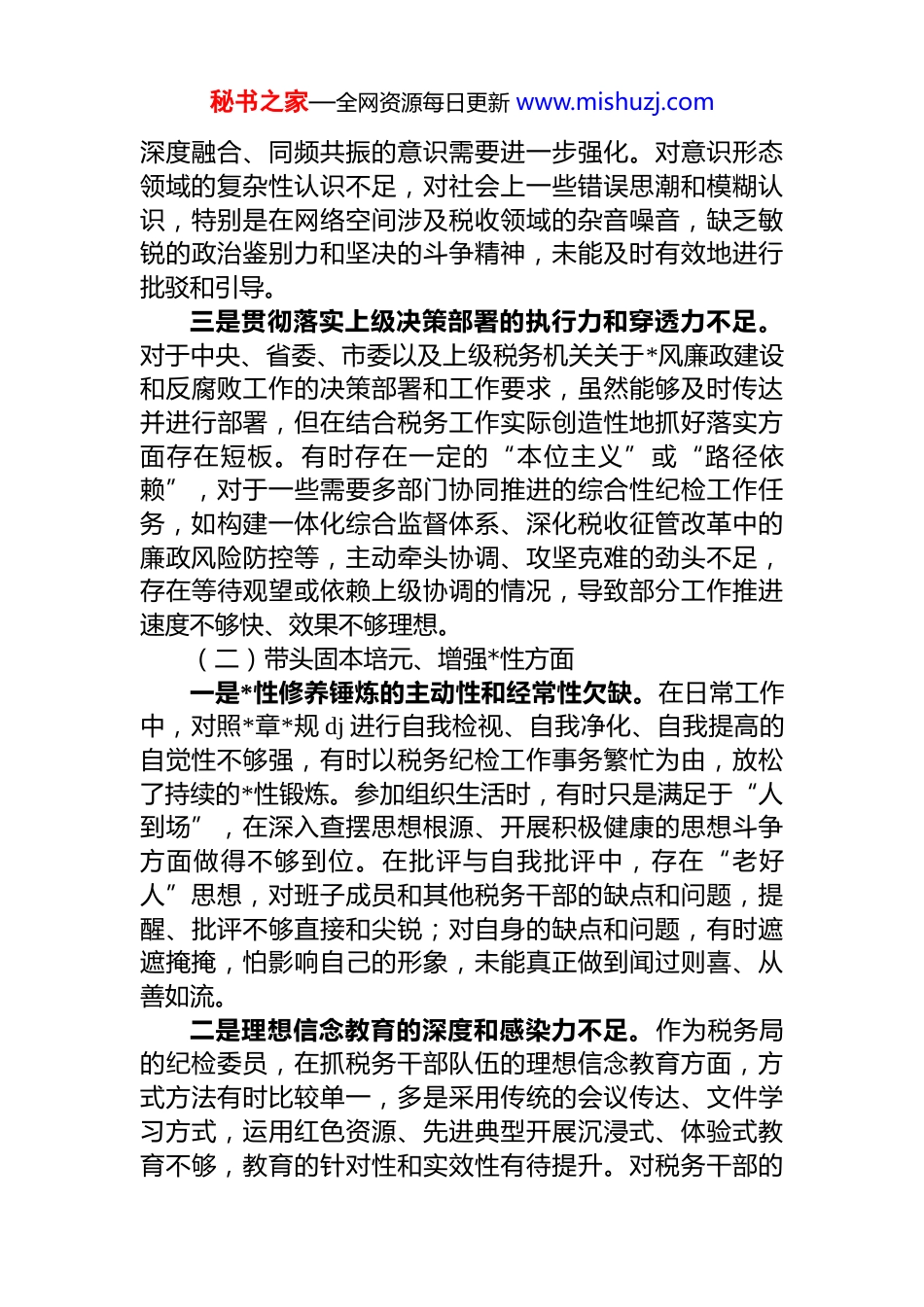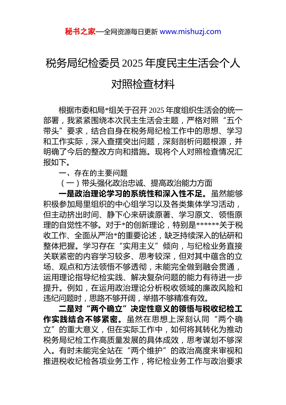秘书之家—全网资源每日更新 www.mishuzj.com税务局纪检委员 2025 年度民主生活会个人对照检查材料根据市委和局*组关于召开 2025 年度组织生活会的统一部署,我紧紧围绕本次民主生活会主题,严格对照“五个带头”要求,结合自身在税务局纪检工作中的思想、学习和工作实际,深入查摆突出问题,深刻剖析问题根源,并明确了今后的整改方向和措施。现将个人对照检查情况汇报如下。一、存在的主要问题(一)带头强化政治忠诚、提高政治能力方面一是政治理论学习的系统性和深入性不足。虽然能够积极参加局里组织的中心组学习以及各类集体学习活动,但主动挤出时间、静下心来研读原著、学习原文、领悟原理的自觉性不够。对于*的创新理论,特别是******关于税收工作、全面从严治*的重要论述,缺乏持续深入的钻研和整体把握。学习存在“实用主义”倾向,与纪检业务直接关联紧密的内容学习较多、思考较深,但对其中蕴含的立场、观点和方法领悟不够透彻,未能完全做到融会贯通,运用理论指导纪检实践、解决复杂问题的能力有待进一步提升。例如,在运用政治理论分析税收领域的廉政风险和违纪问题时,思路不够开阔,举措不够精准有效。二是对“两个确立”决定性意义的领悟与税收纪检工作实践结合不够紧密。虽然在思想上深刻认同“两个确立”的重大意义,但在实际工作中,如何将其转化为推动税务局纪检工作高质量发展的具体成效,思考谋划不够深入。有时未能完全站在“两个维护”的政治高度来审视和推进税收纪检各项业务工作,将纪检业务工作与政治要求秘书之家—全网资源每日更新 www.mishuzj.com深度融合、同频共振的意识需要进一步强化。对意识形态领域的复杂性认识不足,对社会上一些错误思潮和模糊认识,特别是在网络空间涉及税收领域的杂音噪音,缺乏敏锐的政治鉴别力和坚决的斗争精神,未能及时有效地进行批驳和引导。三是贯彻落实上级决策部署的执行力和穿透力不足。对于中央、省委、市委以及上级税务机关关于*风廉政建设和反腐败工作的决策部署和工作要求,虽然能够及时传达并进行部署,但在结合税务工作实际创造性地抓好落实方面存在短板。有时存在一定的“本位主义”或“路径依赖”,对于一些需要多部门协同推进的综合性纪检工作任务,如构建一体化综合监督体系、深化税收征管改革中的廉政风险防控等,主动牵头协调、攻坚克难的劲头不足,存在等待观望或依赖上级协调的情况,导致部分工作推进速度不够快、效果不够理想。(二)带头固本培元、增强*性方面一是*性修养锤炼的主动性和经常性欠缺。在日常工作中,对照*章*规 dj 进行自我检视、自我净化、自我提高的自觉性不够强,有时以税务纪检工作事务繁忙为由,放松了持续的*性锻炼。参加组织生活时,有时只是满足于“人到场”,在深入查摆思想根源、开展积极健康的思想斗争方面做得不够到位。在批评与自我批评中,存在“老好人”思想,对班子成员和其他税务干部的缺点和问题,提醒、批评不够直接和尖锐;对自身的缺点和问题,有时遮遮掩掩,怕影响自己的形象,未能真正做到闻过则喜、从善如流。二是理想信念教育的深度和感染力不足。作为税务局的纪检委员,在抓税务干部队伍的理想信念教育方面,方式方法有时比较单一,多是采用传统的会议传达、文件学习方式,运用红色资源、先进典型开展沉浸式、体验式教育不够,教育的针对性和实效性有待提升。对税务干部的秘书之家—全网资源每日更新 www.mishuzj.com思想动态关注不够深入和及时,特别是对于年轻税务干部的思想引导和人文关怀需要加强,未能做到“一把钥匙开一把锁”,精准地解决他们在理想信念方面存在的问题。三是组织纪律观念的执行刚性不够。虽然能够自觉遵守*的各项纪律,但在严格执行组织程序、自觉接受组织监督方面,有时标准不够高、要求不够严。例如,在干部选拔任用、评先评优等涉及组织纪律的工作中,有时过于强调效率,在广泛征求意见、充分酝酿讨论等环节做得不够扎实细致。对分管领域和下属单位税务干部的日常教育管理监督,存在“重业务、轻 dj”“重使用、轻管理”的现象,对苗头性、倾向性问题抓早抓小、防微杜渐的力度不够。(三)带头敬畏人民、敬畏...