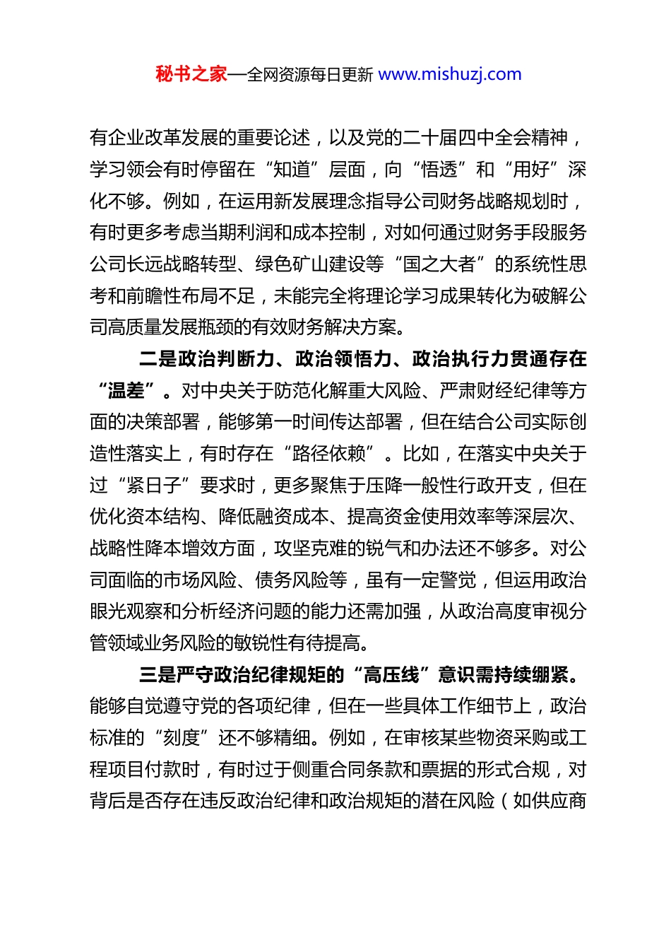 秘书之家—全网资源每日更新 www.mishuzj.comXX 铁矿公司党委委员、副总经理 2025 年度民主生活会对照检查材料根据公司党委关于召开 2025 年度民主生活会的统一部署和要求,本人紧扣会议主题,在深入学习党的二十届四中全会精神、党章党规党纪、中央八项规定精神及实施细则,以及习近平总书记关于全面从严治党、严肃党内政治生活重要论述的基础上,紧密结合分管财务、物资等领域的实际工作,通过群众提、自己找、上级点、互相帮、集体议等多种方式,广泛听取意见建议,并与班子成员、分管部门负责同志、基层党员职工代表开展了深入的谈心谈话。在此基础上,本人严格对照本次民主生活会明确的重点方面,坚持把自己摆进去、把职责摆进去、把工作摆进去,深入查摆自身存在的突出问题,深刻剖析问题产生的根源,明确了今后的努力方向和整改措施。现将对照检查情况报告如下:一、存在的主要问题(一)在带头强化政治忠诚、提高政治能力方面总体能够自觉在思想上政治上行动上同以习近平同志为核心的党中央保持高度一致,坚决维护党中央权威和集中统一领导。但深刻反思,仍存在以下不足:一是政治理论武装的“转化效能”有待提升。对习近平新时代中国特色社会主义思想,特别是其中关于经济工作、国秘书之家—全网资源每日更新 www.mishuzj.com有企业改革发展的重要论述,以及党的二十届四中全会精神,学习领会有时停留在“知道”层面,向“悟透”和“用好”深化不够。例如,在运用新发展理念指导公司财务战略规划时,有时更多考虑当期利润和成本控制,对如何通过财务手段服务公司长远战略转型、绿色矿山建设等“国之大者”的系统性思考和前瞻性布局不足,未能完全将理论学习成果转化为破解公司高质量发展瓶颈的有效财务解决方案。二是政治判断力、政治领悟力、政治执行力贯通存在“温差”。对中央关于防范化解重大风险、严肃财经纪律等方面的决策部署,能够第一时间传达部署,但在结合公司实际创造性落实上,有时存在“路径依赖”。比如,在落实中央关于过“紧日子”要求时,更多聚焦于压降一般性行政开支,但在优化资本结构、降低融资成本、提高资金使用效率等深层次、战略性降本增效方面,攻坚克难的锐气和办法还不够多。对公司面临的市场风险、债务风险等,虽有一定警觉,但运用政治眼光观察和分析经济问题的能力还需加强,从政治高度审视分管领域业务风险的敏锐性有待提高。三是严守政治纪律规矩的“高压线”意识需持续绷紧。能够自觉遵守党的各项纪律,但在一些具体工作细节上,政治标准的“刻度”还不够精细。例如,在审核某些物资采购或工程项目付款时,有时过于侧重合同条款和票据的形式合规,对背后是否存在违反政治纪律和政治规矩的潜在风险(如供应商秘书之家—全网资源每日更新 www.mishuzj.com背景、项目政治社会影响等)的警惕性和审查深度有待加强,未能时时刻刻将政治因素作为决策的首要考量。(二)在带头固本培元、增强党性方面始终注重加强党性锻炼,努力改造主观世界,但对照更高标准,仍有差距:一是理论学习的“深耕细作”有欠缺。存在一定的“实用主义”倾向,与财务、物资业务直接相关的内容学得多、钻得深,但对马克思主义基本原理、共产党人精神谱系等“必修课”的系统性、贯通性学习有所放松。参加中心组学习有时满足于完成“规定动作”,静下心来读原著、悟原理的时间被挤占,运用马克思主义立场观点方法改造世界观、人生观、价值观的主动性、自觉性有待增强,理想信念“总开关”拧得不够紧实。二是党性锤炼的“熔炉”温度不够高。以普通党员身份参加所在支部组织生活时,虽然能按时参加,但带头开展批评与自我批评的“辣味”不足。自我批评有时习惯于从工作层面找原因,从党性高度进行深刻剖析、触及灵魂不够;批评同志时,有时顾虑情面,多用“希望”“建议”等温和词语,点到要害、见筋见骨的勇气有待提升。深入基层与一线党员职工进行思想交流、倾听真实心声的次数和深度还不够。三是宗旨意识融入分管工作的“黏合度”不足。虽然强调财务管理要服务生产、服务职工,但在具体实践中,有时不秘书之家—全网资源每日更新 www.mishuzj.com自觉地偏向...