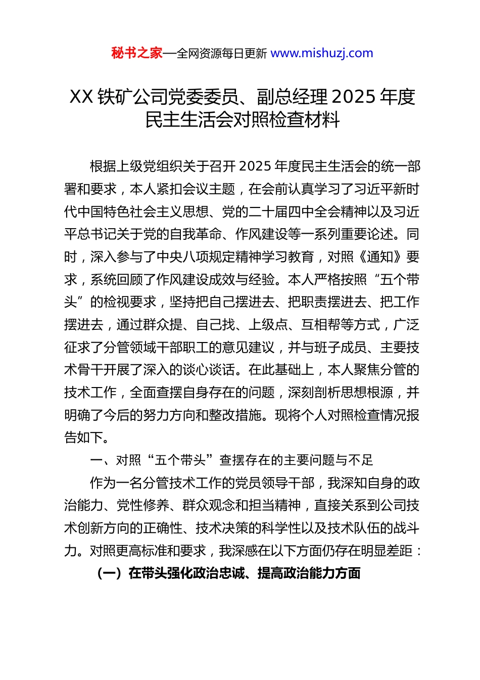 秘书之家—全网资源每日更新 www.mishuzj.comXX 铁矿公司党委委员、副总经理 2025 年度民主生活会对照检查材料根据上级党组织关于召开 2025 年度民主生活会的统一部署和要求,本人紧扣会议主题,在会前认真学习了习近平新时代中国特色社会主义思想、党的二十届四中全会精神以及习近平总书记关于党的自我革命、作风建设等一系列重要论述。同时,深入参与了中央八项规定精神学习教育,对照《通知》要求,系统回顾了作风建设成效与经验。本人严格按照“五个带头”的检视要求,坚持把自己摆进去、把职责摆进去、把工作摆进去,通过群众提、自己找、上级点、互相帮等方式,广泛征求了分管领域干部职工的意见建议,并与班子成员、主要技术骨干开展了深入的谈心谈话。在此基础上,本人聚焦分管的技术工作,全面查摆自身存在的问题,深刻剖析思想根源,并明确了今后的努力方向和整改措施。现将个人对照检查情况报告如下。一、对照“五个带头”查摆存在的主要问题与不足作为一名分管技术工作的党员领导干部,我深知自身的政治能力、党性修养、群众观念和担当精神,直接关系到公司技术创新方向的正确性、技术决策的科学性以及技术队伍的战斗力。对照更高标准和要求,我深感在以下方面仍存在明显差距:(一)在带头强化政治忠诚、提高政治能力方面秘书之家—全网资源每日更新 www.mishuzj.com我能够深刻领悟“两个确立”的决定性意义,自觉增强“四个意识”、坚定“四个自信”、做到“两个维护”,但在将高度的政治自觉转化为推动分管领域高质量发展的具体实践上,还存在穿透力不足、敏锐性不强的问题。一是对党的创新理论,特别是关于科技创新的战略部署,理解转化不够深入。虽然能够及时组织学习党的二十届四中全会关于“加快高水平科技自立自强,引领发展新质生产力”等重大战略决策,但在结合 XX 铁矿作为传统资源型企业的实际,创造性地谋划技术发展路径上,思路有时不够开阔。例如,在推动公司智能化矿山建设过程中,前期更多地关注于引进成套自动化设备、上马监控系统,对于如何将这些技术投入与提升本质安全水平、优化劳动组织、培育企业自主研发能力等更深层次的战略目标进行系统性融合贯通,思考谋划不足。有时仍习惯性将技术问题“技术化”处理,未能时刻从“技术工作首先也是政治工作”的高度,去审视每一项重大技术决策是否完全符合国家关于制造强国、质量强国战略以及绿色低碳发展的宏观导向,导致部分技术项目的政治效益和社会效益挖掘不充分。二是运用政治眼光观察和分析技术风险、产业变革的敏锐性有待加强。面对新一轮科技革命和产业变革深入发展,我能够认识到其重要性,但对其中蕴含的政治意义和战略风险研判不足。例如,在推进关键采矿、选矿设备的进口替代和国产化秘书之家—全网资源每日更新 www.mishuzj.com研发时,初期的工作重心主要放在成本对比、性能参数和技术可行性上,对于这项工作的紧迫性,未能第一时间从维护国家产业链供应链安全、突破“卡脖子”技术瓶颈的政治高度来认识和部署。再如,对行业前沿技术如数字孪生、人工智能在矿业的应用,有时停留在技术跟踪层面,对其可能引发的生产方式深刻变革、带来的新型数据安全风险以及对传统技术队伍的冲击等关联性政治社会影响,缺乏前瞻性的研究和预案。三是在推动上级科技政策具体化、精细化落地方面存在“中梗阻”。在落实国家及行业关于科技创新、绿色矿山建设的政策要求时,有时存在“上下一般粗”或“一刀切”的现象。比如,在设计公司内部科研项目激励和考核机制时,虽然制定了通用办法,但在针对基础研究、应用研究、工艺改进等不同类型创新活动的分类评价和差异化支持上不够精细,未能实现对技术人才和创新团队的“精准滴灌”。这反映出,在将宏观政策要求转化为激发公司内部技术创新活力的具体“施工图”过程中,我的政策执行力、创造性落实能力还有待提升。(二)在带头固本培元、增强党性方面我始终牢记自己的第一身份是共产党员,坚持把政治修养摆在首位,认真学习党章党规党纪,但在党性锻炼的持续性和实践转化的自觉性上,仍有提升空间。一是理论学习与分管工作实践的深度融合有欠缺,...