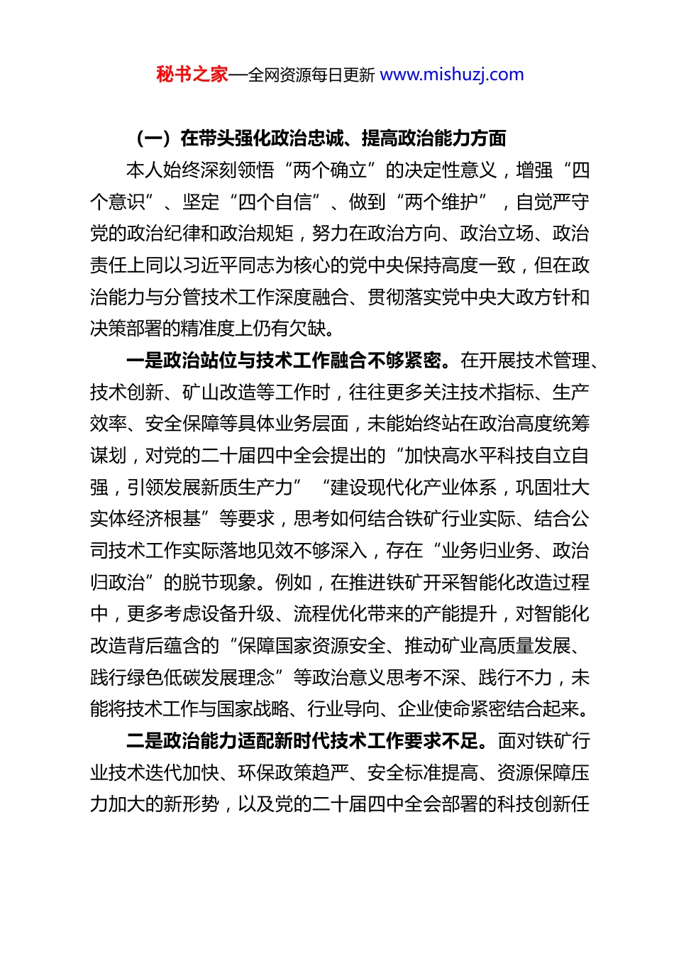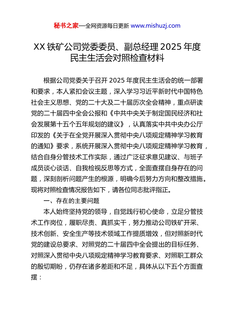 秘书之家—全网资源每日更新 www.mishuzj.comXX 铁矿公司党委委员、副总经理 2025 年度民主生活会对照检查材料根据公司党委关于召开 2025 年度民主生活会的统一部署和要求,本人紧扣会议主题,深入学习习近平新时代中国特色社会主义思想、党的二十大及二十届历次全会精神,重点研读党的二十届四中全会公报和《中共中央关于制定国民经济和社会发展第十五个五年规划的建议》,认真落实中共中央办公厅印发的《关于在全党开展深入贯彻中央八项规定精神学习教育的通知》要求,系统开展深入贯彻中央八项规定精神学习教育,结合自身分管技术工作实际,通过广泛征求意见建议、与班子成员谈心谈话、自我检视反思等方式,全面查摆自身存在的问题,深刻剖析问题产生的根源,明确今后努力方向和整改措施。现将对照检查情况报告如下,请各位同志批评指正。一、存在的主要问题本人始终坚持党的领导,自觉践行初心使命,立足分管技术工作岗位,履职尽责、真抓实干,努力推动公司铁矿开采、技术创新、安全生产等技术领域工作提质增效,但对照新时代党的建设总要求、对照党的二十届四中全会提出的目标任务、对照深入贯彻中央八项规定精神学习教育要求、对照职工群众的殷切期盼,仍存在诸多差距和不足,具体从以下五个方面查摆:秘书之家—全网资源每日更新 www.mishuzj.com(一)在带头强化政治忠诚、提高政治能力方面本人始终深刻领悟“两个确立”的决定性意义,增强“四个意识”、坚定“四个自信”、做到“两个维护”,自觉严守党的政治纪律和政治规矩,努力在政治方向、政治立场、政治责任上同以习近平同志为核心的党中央保持高度一致,但在政治能力与分管技术工作深度融合、贯彻落实党中央大政方针和决策部署的精准度上仍有欠缺。一是政治站位与技术工作融合不够紧密。在开展技术管理、技术创新、矿山改造等工作时,往往更多关注技术指标、生产效率、安全保障等具体业务层面,未能始终站在政治高度统筹谋划,对党的二十届四中全会提出的“加快高水平科技自立自强,引领发展新质生产力”“建设现代化产业体系,巩固壮大实体经济根基”等要求,思考如何结合铁矿行业实际、结合公司技术工作实际落地见效不够深入,存在“业务归业务、政治归政治”的脱节现象。例如,在推进铁矿开采智能化改造过程中,更多考虑设备升级、流程优化带来的产能提升,对智能化改造背后蕴含的“保障国家资源安全、推动矿业高质量发展、践行绿色低碳发展理念”等政治意义思考不深、践行不力,未能将技术工作与国家战略、行业导向、企业使命紧密结合起来。二是政治能力适配新时代技术工作要求不足。面对铁矿行业技术迭代加快、环保政策趋严、安全标准提高、资源保障压力加大的新形势,以及党的二十届四中全会部署的科技创新任秘书之家—全网资源每日更新 www.mishuzj.com务,自身的政治判断力、政治领悟力、政治执行力仍需提升。在分析研判行业技术发展趋势、制定公司技术发展规划时,对党中央关于矿产资源开发、科技创新、生态环保等方面的决策部署理解不够透彻,对政策变化带来的风险挑战预判不够精准,缺乏从政治上分析问题、解决问题的敏锐性和能力。例如,在落实国家关于矿山绿色开采、节能减排的政策要求时,面对部分技术改造项目投入大、周期长、短期效益不明显的情况,存在畏难情绪,未能从“践行生态文明建设、坚守资源安全底线”的政治高度,主动担当作为、攻坚克难,导致部分绿色开采技术推广进度滞后,与党中央关于“推动绿色发展,促进人与自然和谐共生”的决策部署存在差距。三是贯彻落实党中央决策部署不够坚决有力。在推动党中央关于科技创新、资源保障、安全生产等大政方针在公司落地见效时,存在“上热中温下冷”的现象,自身牵头抓总、督促落实的力度不够。虽然能够传达学习相关政策要求,但在具体推进过程中,对技术方案论证、项目实施监管、成果转化应用等环节跟踪问效不够严格,对遇到的技术瓶颈、资金困难、人员不足等问题,主动协调、积极解决的力度不够,导致部分政策部署未能完全落地生根。例如,党的二十届四中全会提出“加强原始创新和关键核心技术攻关,推动科技创新和产业创新深度融...
