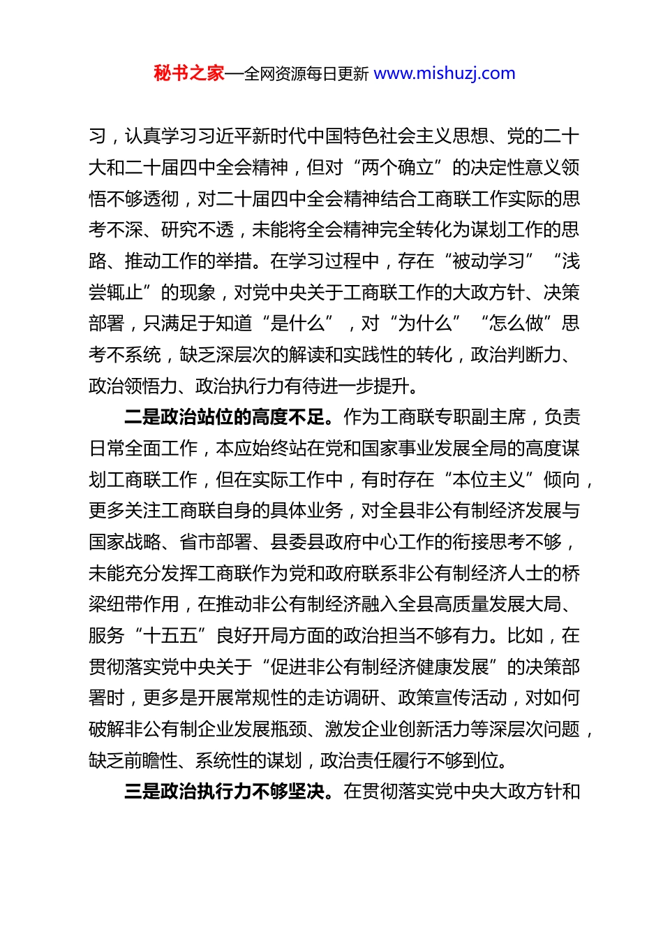 秘书之家—全网资源每日更新 www.mishuzj.comXX 县工商联专职副主席 2025 年度民主生活会对照检查材料根据县委、县纪委关于召开 2025 年度民主生活会的统一部署和要求,本人紧扣会议主题,立足工商联专职副主席岗位职责,深入学习领会习近平新时代中国特色社会主义思想、党的二十大和二十届二中、四中全会精神,认真贯彻落实中央八项规定及其实施细则精神和深入贯彻中央八项规定精神学习教育相关要求,广泛征求基层工商联、会员企业、机关干部及群众代表的意见建议,深入开展谈心谈话,紧密联系自身思想、工作和作风实际,围绕四个大方面、五个具体维度查摆问题、剖析根源,并制定整改措施。现将对照检查情况报告如下,恳请各位领导、同事批评指正。一、存在的主要问题(一)在带头强化政治忠诚、提高政治能力方面对照深刻领悟“两个确立”的决定性意义,增强“四个意识”、坚定“四个自信”、做到“两个维护”,严守党的政治纪律和政治规矩,坚定政治方向、坚守政治立场、履行政治责任,始终同以习近平同志为核心的党中央保持高度一致,保持战略定力,增强必胜信心,坚定不移贯彻落实党中央大政方针和决策部署等要求,存在的主要问题:一是政治领悟的深度不够。虽然能够按时参加各类政治学秘书之家—全网资源每日更新 www.mishuzj.com习,认真学习习近平新时代中国特色社会主义思想、党的二十大和二十届四中全会精神,但对“两个确立”的决定性意义领悟不够透彻,对二十届四中全会精神结合工商联工作实际的思考不深、研究不透,未能将全会精神完全转化为谋划工作的思路、推动工作的举措。在学习过程中,存在“被动学习”“浅尝辄止”的现象,对党中央关于工商联工作的大政方针、决策部署,只满足于知道“是什么”,对“为什么”“怎么做”思考不系统,缺乏深层次的解读和实践性的转化,政治判断力、政治领悟力、政治执行力有待进一步提升。二是政治站位的高度不足。作为工商联专职副主席,负责日常全面工作,本应始终站在党和国家事业发展全局的高度谋划工商联工作,但在实际工作中,有时存在“本位主义”倾向,更多关注工商联自身的具体业务,对全县非公有制经济发展与国家战略、省市部署、县委县政府中心工作的衔接思考不够,未能充分发挥工商联作为党和政府联系非公有制经济人士的桥梁纽带作用,在推动非公有制经济融入全县高质量发展大局、服务“十五五”良好开局方面的政治担当不够有力。比如,在贯彻落实党中央关于“促进非公有制经济健康发展”的决策部署时,更多是开展常规性的走访调研、政策宣传活动,对如何破解非公有制企业发展瓶颈、激发企业创新活力等深层次问题,缺乏前瞻性、系统性的谋划,政治责任履行不够到位。三是政治执行力不够坚决。在贯彻落实党中央大政方针和秘书之家—全网资源每日更新 www.mishuzj.com上级决策部署时,有时存在“打折扣、搞变通”的现象,缺乏“钉钉子”精神,对一些难度较大、涉及多方协调的工作,存在畏难情绪,推进力度不够、落实不够彻底。比如,在落实上级关于“加强非公有制经济人士思想政治引领”的要求时,虽然制定了相关工作计划,但在具体推进过程中,由于缺乏有效的工作举措和督促检查机制,部分活动流于形式,未能真正实现思想政治引领的常态化、制度化,导致部分非公有制经济人士对党的政策理解不够深入,政治认同、思想认同、情感认同有待进一步提升。同时,在严守党的政治纪律和政治规矩方面,有时存在“重业务、轻纪律”的倾向,对机关干部的政治纪律教育不够经常,监督管理不够严格。(二)在带头固本培元、增强党性方面对照坚持把政治修养摆在党性修养的首位,自觉以习近平新时代中国特色社会主义思想凝心铸魂,坚守共产党人精神追求,解决好世界观、人生观、价值观总开关问题,认真学习党章党规党纪,始终用党性原则正心明道、修身律己,坚定理想信念、筑牢对党忠诚、厚植为民情怀、纯正道德品质、保持清正廉洁等要求,存在的主要问题:一是理想信念根基不够牢固。虽然始终坚持学习党的创新理论,但在面对复杂的社会环境和繁重的工作任务时,有时会出现思想松懈、信念动摇的情况,对共产党人的精神追求理解...