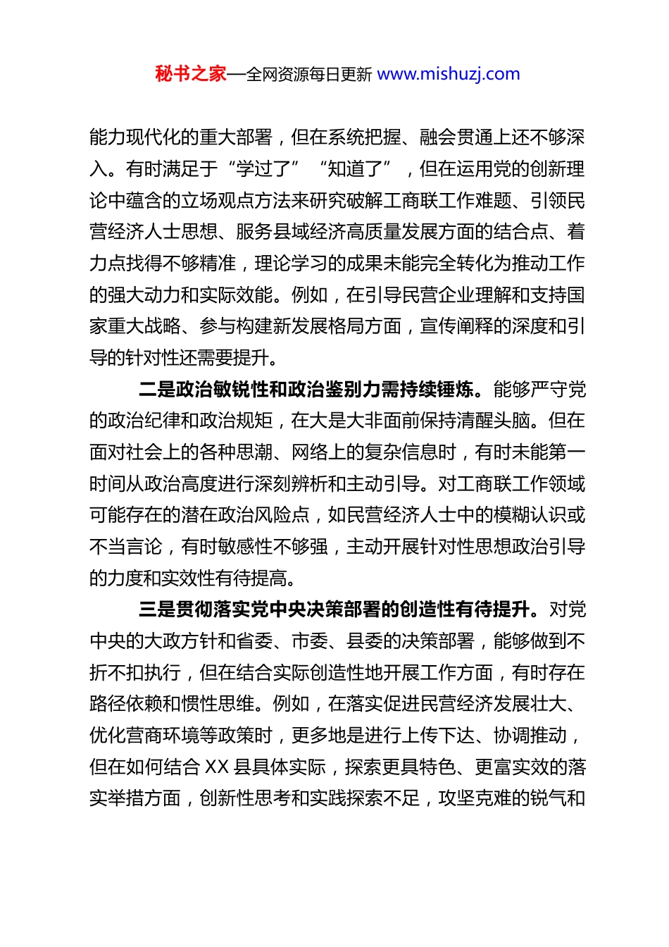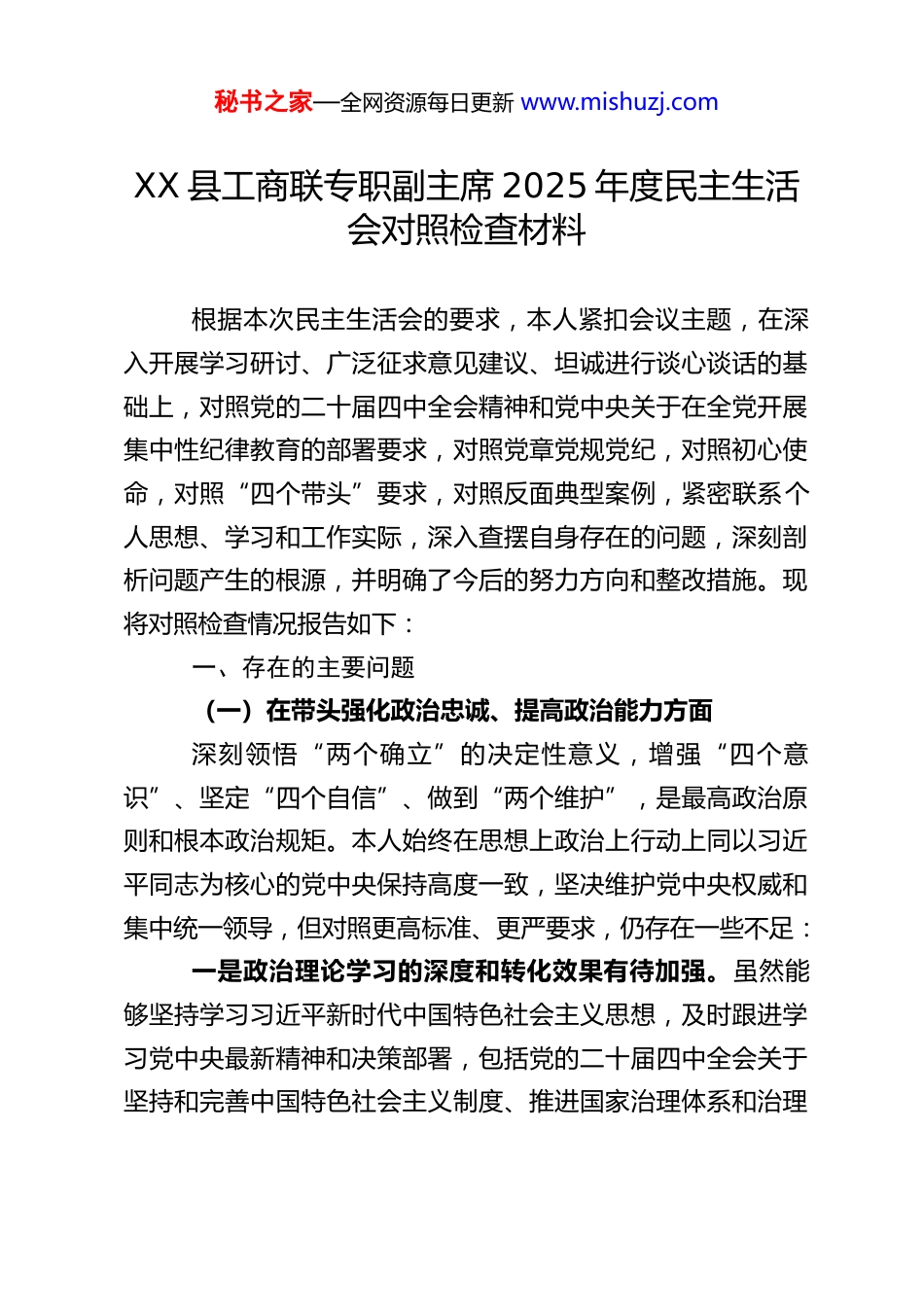 秘书之家—全网资源每日更新 www.mishuzj.comXX 县工商联专职副主席 2025 年度民主生活会对照检查材料根据本次民主生活会的要求,本人紧扣会议主题,在深入开展学习研讨、广泛征求意见建议、坦诚进行谈心谈话的基础上,对照党的二十届四中全会精神和党中央关于在全党开展集中性纪律教育的部署要求,对照党章党规党纪,对照初心使命,对照“四个带头”要求,对照反面典型案例,紧密联系个人思想、学习和工作实际,深入查摆自身存在的问题,深刻剖析问题产生的根源,并明确了今后的努力方向和整改措施。现将对照检查情况报告如下:一、存在的主要问题(一)在带头强化政治忠诚、提高政治能力方面深刻领悟“两个确立”的决定性意义,增强“四个意识”、坚定“四个自信”、做到“两个维护”,是最高政治原则和根本政治规矩。本人始终在思想上政治上行动上同以习近平同志为核心的党中央保持高度一致,坚决维护党中央权威和集中统一领导,但对照更高标准、更严要求,仍存在一些不足:一是政治理论学习的深度和转化效果有待加强。虽然能够坚持学习习近平新时代中国特色社会主义思想,及时跟进学习党中央最新精神和决策部署,包括党的二十届四中全会关于坚持和完善中国特色社会主义制度、推进国家治理体系和治理秘书之家—全网资源每日更新 www.mishuzj.com能力现代化的重大部署,但在系统把握、融会贯通上还不够深入。有时满足于“学过了”“知道了”,但在运用党的创新理论中蕴含的立场观点方法来研究破解工商联工作难题、引领民营经济人士思想、服务县域经济高质量发展方面的结合点、着力点找得不够精准,理论学习的成果未能完全转化为推动工作的强大动力和实际效能。例如,在引导民营企业理解和支持国家重大战略、参与构建新发展格局方面,宣传阐释的深度和引导的针对性还需要提升。二是政治敏锐性和政治鉴别力需持续锤炼。能够严守党的政治纪律和政治规矩,在大是大非面前保持清醒头脑。但在面对社会上的各种思潮、网络上的复杂信息时,有时未能第一时间从政治高度进行深刻辨析和主动引导。对工商联工作领域可能存在的潜在政治风险点,如民营经济人士中的模糊认识或不当言论,有时敏感性不够强,主动开展针对性思想政治引导的力度和实效性有待提高。三是贯彻落实党中央决策部署的创造性有待提升。对党中央的大政方针和省委、市委、县委的决策部署,能够做到不折不扣执行,但在结合实际创造性地开展工作方面,有时存在路径依赖和惯性思维。例如,在落实促进民营经济发展壮大、优化营商环境等政策时,更多地是进行上传下达、协调推动,但在如何结合 XX 县具体实际,探索更具特色、更富实效的落实举措方面,创新性思考和实践探索不足,攻坚克难的锐气和秘书之家—全网资源每日更新 www.mishuzj.com“钉钉子”精神尚需加强。四是保持战略定力与应对风险挑战的结合需进一步深化。对当前国内外复杂严峻形势和经济下行压力有基本认识,但对其长期性、艰巨性的估计有时不够充分,引导民营企业家稳定预期、坚定信心的方式方法可以更多样、更有效。在应对外部环境变化带来的挑战时,战略上的坚定性与策略上的灵活性结合不够,前瞻性谋划和系统性应对能力有待提升。(二)在带头固本培元、增强党性方面始终牢记共产党人的初心使命,注重加强党性锻炼和道德修养,但对照“坚守共产党人精神追求”、“解决好世界观、人生观、价值观总开关问题”的高标准,仍有差距:一是党性修养的自觉性、主动性需进一步增强。能够参加组织生活,遵守党章党规,但有时将党性锻炼融入日常、抓在经常的主动性不够强。对照党员标准和先进典型,进行自我革命、自我净化、自我完善的锐度有所减弱。在运用批评与自我批评武器时,有时顾及情面,对自身深层次问题的剖析不够彻底,对同志存在的问题提醒不够直接。二是理想信念的根基扎得不够牢固。总体上理想信念是坚定的,但在面对繁重工作任务和复杂矛盾时,偶尔会产生畏难情绪或松劲心态,这从本质上反映出理想信念的锤炼还需要持续深化。对共产主义远大理想和中国特色社会主义共同理想的理解,有时停留在宏观认知层面,与个人岗位职责、具体实秘书之家—全网资...