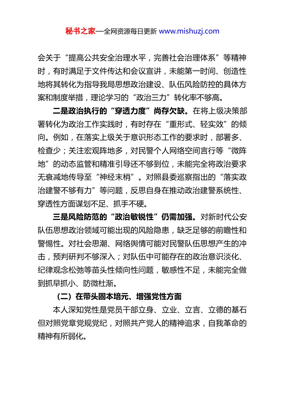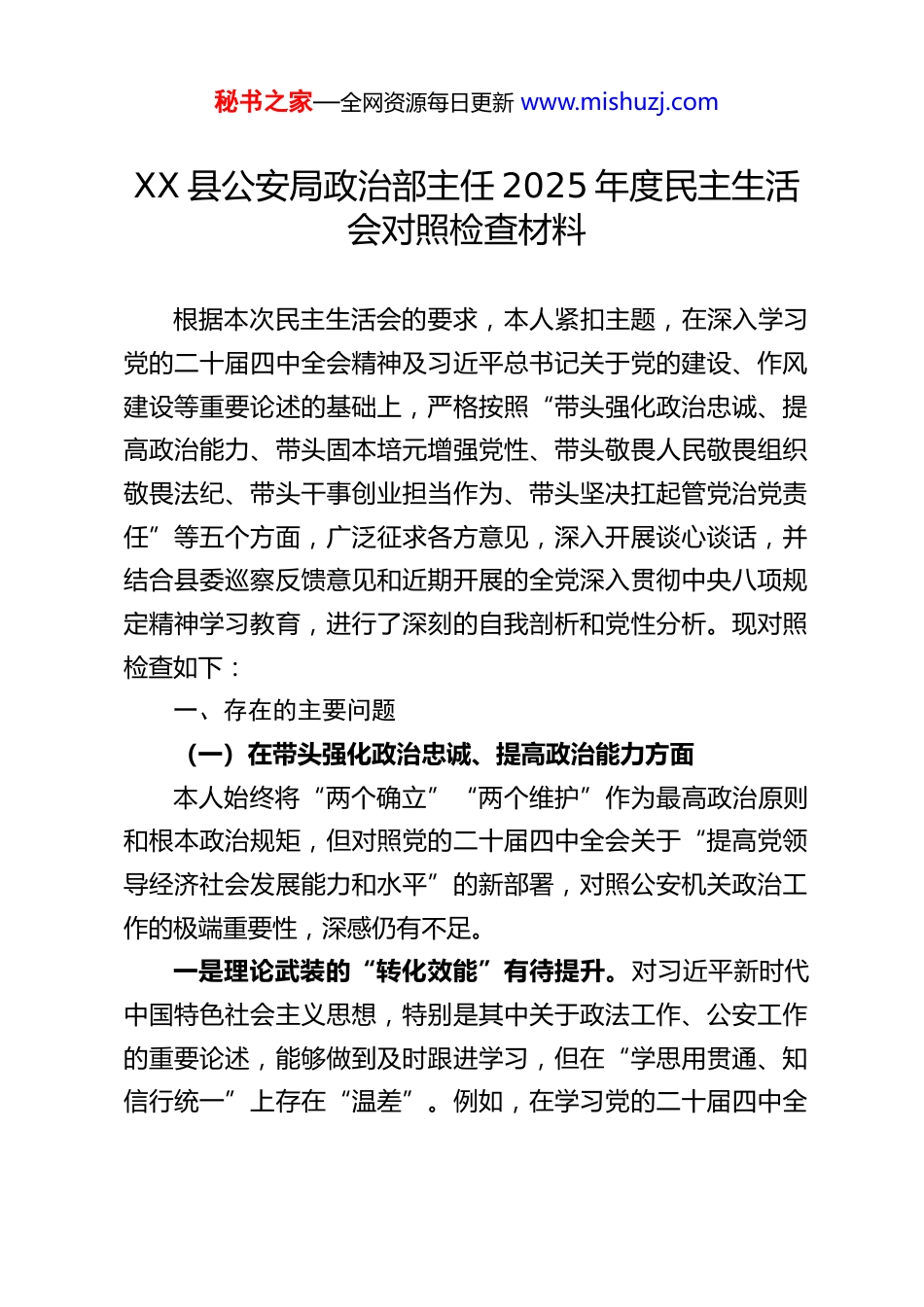 秘书之家—全网资源每日更新 www.mishuzj.comXX 县公安局政治部主任 2025 年度民主生活会对照检查材料根据本次民主生活会的要求,本人紧扣主题,在深入学习党的二十届四中全会精神及习近平总书记关于党的建设、作风建设等重要论述的基础上,严格按照“带头强化政治忠诚、提高政治能力、带头固本培元增强党性、带头敬畏人民敬畏组织敬畏法纪、带头干事创业担当作为、带头坚决扛起管党治党责任”等五个方面,广泛征求各方意见,深入开展谈心谈话,并结合县委巡察反馈意见和近期开展的全党深入贯彻中央八项规定精神学习教育,进行了深刻的自我剖析和党性分析。现对照检查如下:一、存在的主要问题(一)在带头强化政治忠诚、提高政治能力方面本人始终将“两个确立”“两个维护”作为最高政治原则和根本政治规矩,但对照党的二十届四中全会关于“提高党领导经济社会发展能力和水平”的新部署,对照公安机关政治工作的极端重要性,深感仍有不足。一是理论武装的“转化效能”有待提升。对习近平新时代中国特色社会主义思想,特别是其中关于政法工作、公安工作的重要论述,能够做到及时跟进学习,但在“学思用贯通、知信行统一”上存在“温差”。例如,在学习党的二十届四中全秘书之家—全网资源每日更新 www.mishuzj.com会关于“提高公共安全治理水平,完善社会治理体系”等精神时,有时满足于文件传达和会议宣讲,未能第一时间、创造性地将其转化为指导我局思想政治建设、队伍风险防控的具体方案和制度举措,理论学习的“政治三力”转化率不够高。二是政治执行的“穿透力度”尚存欠缺。在将上级决策部署转化为政治工作实践时,有时存在“重形式、轻实效”的倾向。例如,在落实上级关于意识形态工作的要求时,部署多、检查少;关注宏观阵地多,对民警个人网络空间言行等“微阵地”的动态监管和精准引导还不够到位,未能完全将政治要求无衰减地传导至“神经末梢”。对照县委巡察指出的“落实政治建警不够有力”等问题,反思自身在推动政治建警系统性、穿透性方面谋划不足、抓手不硬。三是风险防范的“政治敏锐性”仍需加强。对新时代公安队伍思想政治领域可能出现的风险隐患,缺乏足够的前瞻性和警惕性。对社会思潮、网络舆情可能对民警队伍思想产生的冲击,预判研判不够深入;对队伍中可能存在的政治意识淡化、纪律观念松弛等苗头性倾向性问题,敏感性不足,未能完全做到抓早抓小、防微杜渐。(二)在带头固本培元、增强党性方面本人深知党性是党员干部立身、立业、立言、立德的基石但对照党章党规党纪,对照共产党人的精神追求,自我革命的精神有所弱化。秘书之家—全网资源每日更新 www.mishuzj.com一是党性锤炼的“日常化”融入不足。有时将参加组织生活视为“政治任务”,存在“事务化”“程序化”倾向。在支部组织生活会上,自我批评有时避重就轻、隔靴搔痒,怕“揭短亮丑”;相互批评也多是“和风细雨”,“辣味”不足,未能真正达到“红脸出汗、排毒治病”的效果。将党性分析与具体业务工作深度融合不够,未能时刻以党性原则检视政治工作中的每一个决策、每一次用人。二是宗旨意识的“实践性”体现不深。虽然常讲“以人民为中心”,但在政治工作中,有时更注重“对上负责”,对“如何通过政治工作让民警更好地为人民服务”这一根本命题思考不深、举措不实。深入基层所队与一线民警面对面谈心,倾听他们对政治工作的真实需求和意见建议不够经常,导致有些工作安排与基层实际脱节,未能完全做到“从民警中来、到民警中去”。三是道德品德的“示范性”标准不高。在自觉用高尚道德情操滋养党性、做到“修身律己”方面,标准有时不够严格。满足于不触红线、守住底线,但在自觉抵制歪风邪气、弘扬新风正气方面,主动性和表率作用发挥不够充分。对社会上一些不良风气和潜规则,有时警惕性不足,未能做到时时自省、处处警惕。(三)在带头敬畏人民、敬畏组织、敬畏法纪方面本人深知“三个敬畏”是履职用权的基本遵循,但对照秘书之家—全网资源每日更新 www.mishuzj.com“四下基层”要求和全面从严管党治警标准,仍有差距。一是践行群众路线存在“形式化”倾向。落实“四下基层”制...