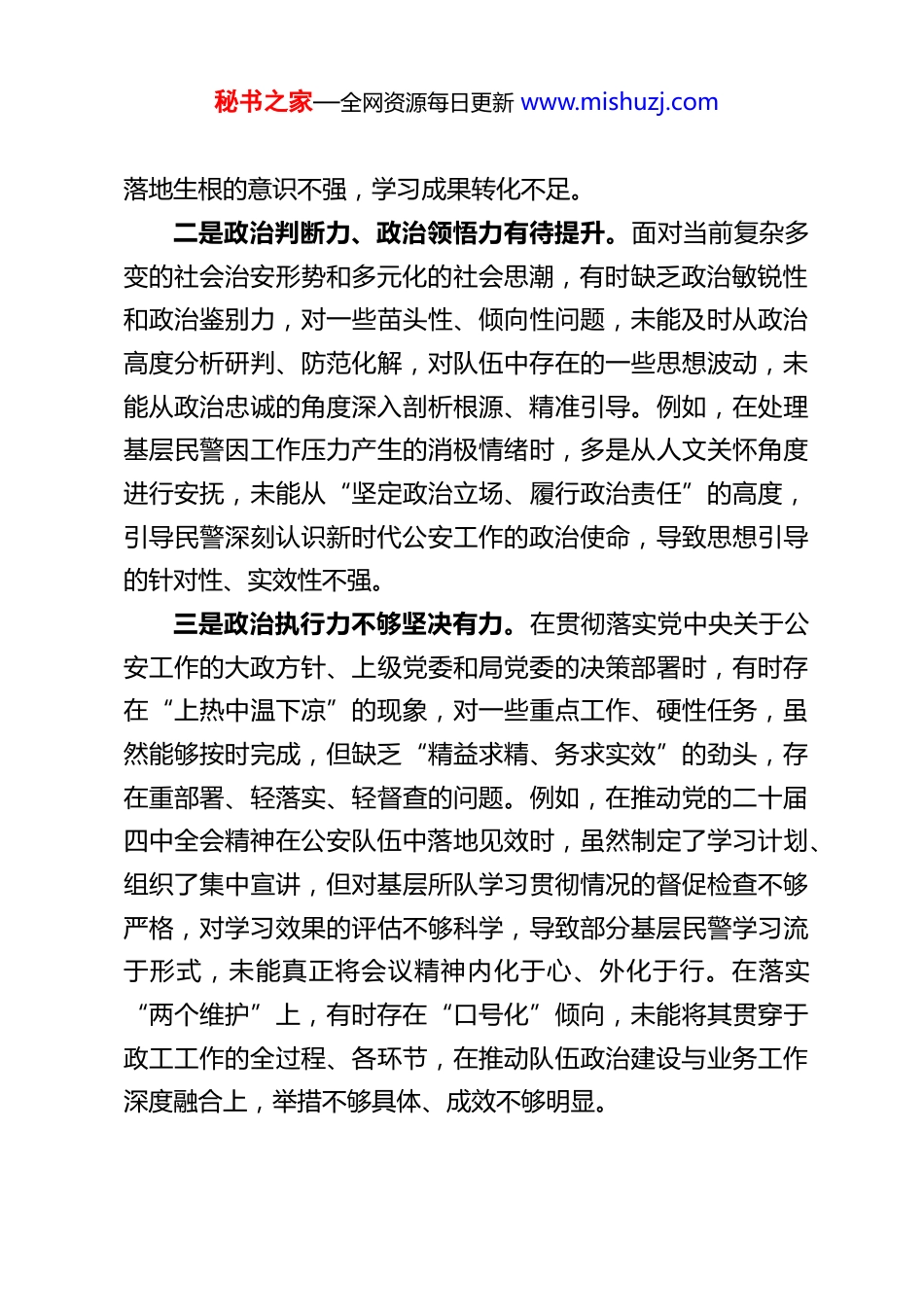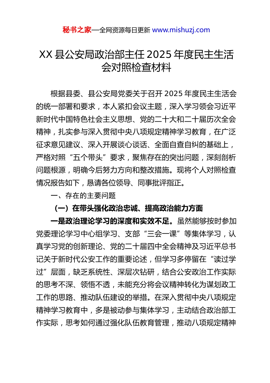 秘书之家—全网资源每日更新 www.mishuzj.comXX 县公安局政治部主任 2025 年度民主生活会对照检查材料根据县委、县公安局党委关于召开 2025 年度民主生活会的统一部署和要求,本人紧扣会议主题,深入学习领会习近平新时代中国特色社会主义思想、党的二十大和二十届历次全会精神,扎实参与深入贯彻中央八项规定精神学习教育,在广泛征求意见建议、深入开展谈心谈话、全面自查自纠的基础上,严格对照“五个带头”要求,聚焦存在的突出问题,深刻剖析问题根源,明确今后努力方向和整改措施。现将个人对照检查情况报告如下,恳请各位领导、同事批评指正。一、存在的主要问题(一)在带头强化政治忠诚、提高政治能力方面一是政治理论学习的深度和实效不足。虽然能够按时参加党委理论学习中心组学习、支部“三会一课”等集体学习,认真学习党的创新理论、党的二十届四中全会精神及习近平总书记关于新时代公安工作的重要论述,但学习多停留在“读过学过”层面,缺乏系统性、深层次钻研,结合公安政治工作实际的思考不深、领悟不透,未能充分将会议精神转化为谋划政工工作的思路、推动队伍建设的举措。在深入贯彻中央八项规定精神学习教育中,多是被动参与集体学习,主动结合政治部工作实际,思考如何通过强化队伍教育管理,推动八项规定精神秘书之家—全网资源每日更新 www.mishuzj.com落地生根的意识不强,学习成果转化不足。二是政治判断力、政治领悟力有待提升。面对当前复杂多变的社会治安形势和多元化的社会思潮,有时缺乏政治敏锐性和政治鉴别力,对一些苗头性、倾向性问题,未能及时从政治高度分析研判、防范化解,对队伍中存在的一些思想波动,未能从政治忠诚的角度深入剖析根源、精准引导。例如,在处理基层民警因工作压力产生的消极情绪时,多是从人文关怀角度进行安抚,未能从“坚定政治立场、履行政治责任”的高度,引导民警深刻认识新时代公安工作的政治使命,导致思想引导的针对性、实效性不强。三是政治执行力不够坚决有力。在贯彻落实党中央关于公安工作的大政方针、上级党委和局党委的决策部署时,有时存在“上热中温下凉”的现象,对一些重点工作、硬性任务,虽然能够按时完成,但缺乏“精益求精、务求实效”的劲头,存在重部署、轻落实、轻督查的问题。例如,在推动党的二十届四中全会精神在公安队伍中落地见效时,虽然制定了学习计划、组织了集中宣讲,但对基层所队学习贯彻情况的督促检查不够严格,对学习效果的评估不够科学,导致部分基层民警学习流于形式,未能真正将会议精神内化于心、外化于行。在落实“两个维护”上,有时存在“口号化”倾向,未能将其贯穿于政工工作的全过程、各环节,在推动队伍政治建设与业务工作深度融合上,举措不够具体、成效不够明显。秘书之家—全网资源每日更新 www.mishuzj.com(二)在带头固本培元、增强党性方面一是理想信念根基不够牢固。虽然能够坚定共产主义理想信念,坚守共产党人的精神家园,但面对工作中的困难和挑战,有时会出现思想波动,缺乏“逢山开路、遇水架桥”的坚定信念和顽强意志,对新时代公安政治工作的长期性、艰巨性认识不足,在推动队伍思想建设、培育公安英模精神等工作中,缺乏持之以恒的韧劲。在深入贯彻中央八项规定精神学习教育中,虽然能够认识到作风建设的重要性,但有时存在“松懈麻痹”思想,认为自身能够严守纪律规矩,对党性修养的重要性认识不够深刻,未能始终以高标准、严要求锤炼党性。二是党章党规党纪学习不够扎实。对党章、《中国共产党纪律处分条例》等党内法规的学习,多是集中学习时通读一遍,缺乏系统性、常态化学习,对一些具体条款的理解不够透彻,未能真正将党章党规党纪作为修身律己、正心明道的根本遵循。在日常工作中,有时存在“重业务、轻党建”的倾向,对政治部牵头的党建工作,缺乏主动谋划、精心组织的意识,在推动基层党支部标准化、规范化建设上,举措不够具体、成效不够明显,未能充分发挥党建引领作用。三是为民情怀不够深厚。虽然能够牢记“以人民为中心”的发展思想,努力推动公安队伍践行群众路线,但在实际工作中,深入基层、深入群众不够经常,对基层民警...