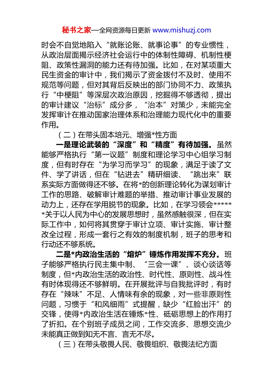 秘书之家—全网资源每日更新 www.mishuzj.com县审计局领导班子 2025 年度民主生活会对照检查材料根据县委、县纪委监委和县委组织部关于开好 2025 年度民主生活会的统一部署,xx 县审计局领导班子紧扣会议主题,在深入开展学习研讨、广泛征求意见建议、坦诚进行谈心谈话的基础上,对照“带头强化政治忠诚、提高政治能力”“带头固本培元、增强*性”“带头敬畏人民、敬畏组织、敬畏法纪”“带头干事创业、担当作为”“带头坚决扛起管*治*责任”等五个方面,深入查摆突出问题,深刻剖析问题根源,明确了努力方向和整改措施。现将对照检查情况报告如下:一、存在的主要问题(一)在带头强化政治忠诚、提高政治能力方面一是“政治三力”的实践转化尚有温差。班子在带领全局干部深刻领会“国之大者”、心怀“县之大计”上,政治判断力、政治领悟力、政治执行力的贯通运用还不够圆融如意。比如,在将中央宏观政策、省市县发展战略转化为具体审计项目和监督重点时,有时存在一定的“时差”和“温差”。对于县域经济社会发展中的一些新业态新模式,如何从政治高度审视其潜在风险、从经济监督角度保障其健康发展,前瞻性研究和谋划还不够深入,导致部分审计项目的政治站位和宏观视野有待进一步提升 。2025 年,我们在谋划大数据审计时,更多地关注了技术应用层面,但在如何通过数据审计服务于县域治理能力现代化这一政治目标上,思考的深度和广度还显不足。二是运用政治眼光分析经济问题的能力需持续增强。班子成员虽然具备较强的专业能力,但在审计实践中,有秘书之家—全网资源每日更新 www.mishuzj.com时会不自觉地陷入“就账论账、就事论事”的专业惯性,从政治层面揭示经济社会运行中的体制性障碍、机制性梗阻、政策性漏洞的能力还有待加强。比如,在对某项重大民生资金的审计中,我们揭示了资金拨付不及时、使用不规范等问题,但对其背后反映出的部门协同不力、政策执行“中梗阻”等深层次政治原因,挖掘得不够透彻,提出的审计建议“治标”成分多,“治本”对策少,未能完全发挥审计在推动国家治理体系和治理能力现代化中的重要作用。(二)在带头固本培元、增强*性方面一是理论武装的“深度”和“精度”有待加强。虽然能够严格执行“第一议题”制度和理论学习中心组学习制度,但有时存在“为学习而学习”的现象,满足于读了文件、学了讲话,但在“钻进去”精研细读、“跳出来”联系实际方面做得还不够。在将*的创新理论转化为谋划审计工作的思路、破解审计难题的举措、推动审计事业发展的动力上,还存在学用脱节的现象。比如,在学习领会******关于以人民为中心的发展思想时,虽然感触很深,但在实际工作中,如何将其贯穿于审计立项、审计实施、审计整改全过程,形成一套行之有效的制度机制,班子的思考和行动还不够系统。二是*内政治生活的“熔炉”锤炼作用发挥不充分。班子能够严格执行民主集中制、“三会一课”、谈心谈话等制度,但*内政治生活的政治性、时代性、原则性、战斗性有时体现得还不够鲜明。在开展批评与自我批评时,有时存在“辣味”不足、人情味有余的现象,对一些非原则性问题,习惯于“和风细雨”式提醒,缺少“红脸出汗”的交锋,使得*内政治生活在锤炼*性、砥砺思想上的作用打了折扣。在个别班子成员之间,工作交流多、思想交流少未能真正做到知无不言、言无不尽。(三)在带头敬畏人民、敬畏组织、敬畏法纪方面秘书之家—全网资源每日更新 www.mishuzj.com一是“审计为民”的价值导向树得不够牢固。虽然在工作中始终强调民生优先,加大了对教育、医疗、社保等重点民生领域的审计力度,但在思想深处,有时仍将完成上级交办的硬任务、大项目作为工作重心,对群众通过信访、网络等渠道反映的“微腐败”“小问题”,主动发现跟进监督的敏感性和力度还不够。比如,在审计项目计划安排上,对重大政策落实、重大项目投资等关注较多,而对群众身边的“小微权力”运行、小型民生工程建设等领域的审计覆盖面还有待拓宽,未能完全做到审计监督“无死角”,让群众在每一个审计项目中都能感受到公平正义。二是纪律规矩的“高压线”意识需时刻绷紧。班子成员能够带头...