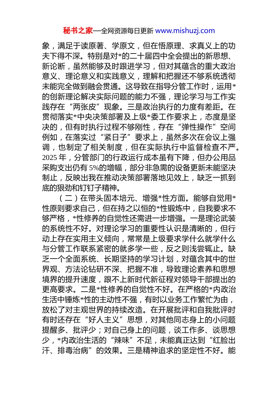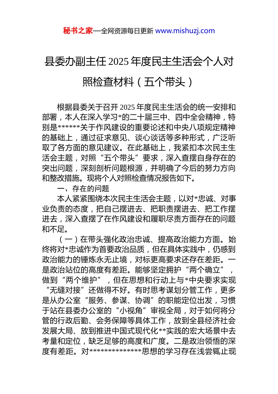 秘书之家—全网资源每日更新 www.mishuzj.com县委办副主任 2025 年度民主生活会个人对照检查材料(五个带头)根据县委关于召开 2025 年度民主生活会的统一安排和部署,本人在深入学习*的二十届三中、四中全会精神,特别是******关于作风建设的重要论述和中央八项规定精神的基础上,通过征求意见、谈心谈话等多种形式,广泛听取了各方面的意见建议。在此基础上,我紧扣本次民主生活会主题,对照“五个带头”要求,深入查摆自身存在的突出问题,深刻剖析问题根源,并明确了今后的努力方向和整改措施。现将个人对照检查情况报告如下。一、存在的问题本人紧紧围绕本次民主生活会主题,以对*忠诚、对事业负责的态度,把自己摆进去、把职责摆进去、把工作摆进去,深入查摆了在作风建设和履职尽责方面存在的问题和不足。(一)在带头强化政治忠诚、提高政治能力方面。始终将对*忠诚作为首要政治品质,但在具体实践中,仍感到政治能力的锤炼永无止境,对标更高要求还存在差距。一是政治站位的高度有差距。能够坚定拥护“两个确立”,做到“两个维护”,但在思想和行动上与*中央要求实现“无缝对接”还做得不好。有时思考谋划分管工作,更多是从办公室“服务、参谋、协调”的职能定位出发,习惯于站在县委办公室的“小视角”审视全局,对于如何将分管的行政后勤、会务保障等具体工作,放到全县经济社会发展大局、放到推进中国式现代化**实践的宏大场景中去考量和定位,缺乏足够的高度和广度。二是政治领悟的深度有差距。对**************思想的学习存在浅尝辄止现秘书之家—全网资源每日更新 www.mishuzj.com象,满足于读原著、学原文,但在悟原理、求真义上的功夫下得不深。特别是对*的二十届四中全会提出的新思想、新论断,虽然能够及时跟进学习,但对其蕴含的重大政治意义、理论意义和实践意义,理解和把握还不够系统透彻未能完全做到融会贯通。这导致在指导分管工作时,运用*的创新理论解决实际问题的能力不强,理论学习与工作实践存在“两张皮”现象。三是政治执行的力度有差距。在贯彻落实*中央决策部署及上级*委工作要求上,态度是坚决的,但有时执行过程不够刚性,存在“弹性操作”空间例如,在落实过“紧日子”要求上,虽然多次在会议上强调,也制定了相关制度,但在实际执行中监督检查不严。2025 年,分管部门的行政运行成本虽有下降,但办公用品采购支出仍有 5%的增幅,部分非急需的设备更新未能坚决制止,反映出我在推动决策部署落地见效上,缺乏一抓到底的狠劲和钉钉子精神。(二)在带头固本培元、增强*性方面。能够自觉用*性原则要求自己,但在持之以恒的*性锻炼中,自我要求不够严格,*性修养的自觉性还需进一步增强。一是理论武装的系统性不好。对理论学习的重要性认识是清晰的,但行动上存在实用主义倾向,常常是上级要求学什么就学什么与分管工作联系紧密的就多学一些,反之则浅尝辄止。缺乏一个全面系统、长期坚持的学习计划,对蕴含其中的世界观、方法论钻研不深、把握不准,导致理论素养和思想境界的提升速度,跟不上新时代新征程对领导干部提出的更高要求。二是*性修养的自觉性不好。在严格的*内政治生活中锤炼*性的主动性不强,有时以业务工作繁忙为由,放松了对主观世界的持续改造。在开展批评和自我批评时有时还存在“好人主义”思想,对其他同志身上的小问题提醒多、批评少;对自己身上的问题,谈工作多、谈思想少,*内政治生活的“辣味”不足,未能真正达到“红脸出汗、排毒治病”的效果。三是精神追求的坚定性不好。能秘书之家—全网资源每日更新 www.mishuzj.com够坚守共产*人的精神家园,但在面对社会上一些错误思潮和不良风气时,虽能做到不认同、不附和,但缺乏旗帜鲜明进行斗争的勇气。在日常工作中,艰苦奋斗、勤俭节约的意识有所淡化,对于分管的后勤保障工作,有时考虑“保障有力”多于“厉行节约”,在审批一些招待、会务费用时,对一些超出标准的项目,有时未能坚决予以核减。(三)在带头敬畏人民、敬畏组织、敬畏法纪方面。始终对人民、组织和法纪怀有敬畏之心,但在具体言行中敬畏的意识还没有完全融入血脉、化为行动自觉。一是践行群众...