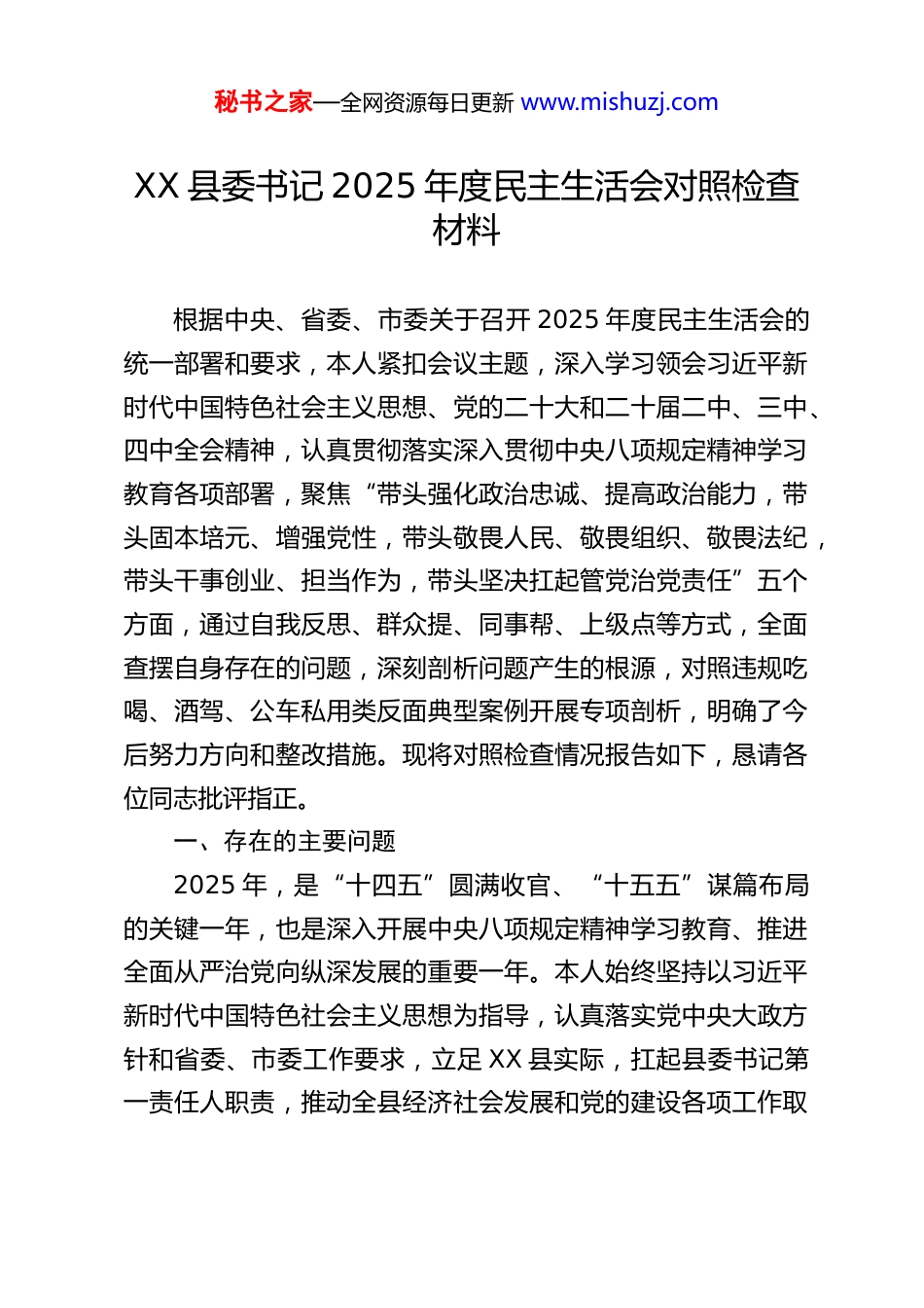 秘书之家—全网资源每日更新 www.mishuzj.comXX 县委书记 2025 年度民主生活会对照检查材料根据中央、省委、市委关于召开 2025 年度民主生活会的统一部署和要求,本人紧扣会议主题,深入学习领会习近平新时代中国特色社会主义思想、党的二十大和二十届二中、三中、四中全会精神,认真贯彻落实深入贯彻中央八项规定精神学习教育各项部署,聚焦“带头强化政治忠诚、提高政治能力,带头固本培元、增强党性,带头敬畏人民、敬畏组织、敬畏法纪,带头干事创业、担当作为,带头坚决扛起管党治党责任”五个方面,通过自我反思、群众提、同事帮、上级点等方式,全面查摆自身存在的问题,深刻剖析问题产生的根源,对照违规吃喝、酒驾、公车私用类反面典型案例开展专项剖析,明确了今后努力方向和整改措施。现将对照检查情况报告如下,恳请各位同志批评指正。一、存在的主要问题2025 年,是“十四五”圆满收官、“十五五”谋篇布局的关键一年,也是深入开展中央八项规定精神学习教育、推进全面从严治党向纵深发展的重要一年。本人始终坚持以习近平新时代中国特色社会主义思想为指导,认真落实党中央大政方针和省委、市委工作要求,立足 XX 县实际,扛起县委书记第一责任人职责,推动全县经济社会发展和党的建设各项工作取秘书之家—全网资源每日更新 www.mishuzj.com得一定成效。但对照新时代党的建设总要求、对照党的二十届四中全会提出的目标任务、对照深入贯彻中央八项规定精神学习教育的具体要求、对照人民群众的殷切期盼,经认真查摆,自身仍存在诸多差距和不足,主要体现在以下五个方面:(一)在带头强化政治忠诚、提高政治能力方面始终把政治建设摆在首位,深刻领悟“两个确立”的决定性意义,增强“四个意识”、坚定“四个自信”、做到“两个维护”,自觉在思想上政治上行动上同以习近平同志为核心的党中央保持高度一致,坚决贯彻落实党中央大政方针和决策部署。但对照更高标准、更严要求,仍存在一些薄弱环节:一是政治领悟的深度不够。对习近平新时代中国特色社会主义思想和党的二十届四中全会精神的学习,多是按照上级部署完成规定动作,主动钻研、系统把握不够,对全会提出的“坚持和完善党的领导制度体系、推进国家治理体系和治理能力现代化”等重大部署,理解不够透彻、把握不够精准,未能完全结合 XX 县实际,将其转化为破解发展难题、推动高质量发展的具体思路和举措。在深入贯彻中央八项规定精神学习教育中,虽然参与了集中学习、专题研讨,但对学习教育的重大意义、核心要求领悟不够深刻,未能从党的自我革命、跳出治乱兴衰历史周期率的高度,深刻认识作风建设的长期性、艰巨性。二是政治能力的提升滞后。面对复杂多变的国内外形势和秘书之家—全网资源每日更新 www.mishuzj.com县域发展中的各类风险挑战,政治判断力、政治领悟力、政治执行力仍有不足。在统筹发展和安全、处理复杂矛盾纠纷时,有时缺乏战略定力和长远眼光,未能始终站在政治高度分析问题、谋划工作,导致一些工作推进成效不够理想。比如,在落实党中央关于防范化解重大风险的决策部署时,对县域内金融、安全生产、信访维稳等领域的风险隐患排查不够全面,防范措施不够精准,存在一定的政治风险隐患。三是政策落实的力度不均。在贯彻落实党中央大政方针和省委、市委决策部署时,有时存在“上热中温下冷”的现象,对一些重点工作部署,虽然召开会议、印发文件,但在后续跟踪问效、督促检查上不够严格,导致部分工作落实不到位、成效不明显。尤其是在结合县域实际创造性落实上级部署方面,思路不够开阔、举措不够有力,存在照搬照抄、简单套用的情况,未能充分发挥县域优势,推动上级部署落地生根、开花结果。(二)在带头固本培元、增强党性方面坚持把政治修养摆在党性修养的首位,自觉以习近平新时代中国特色社会主义思想凝心铸魂,认真学习党章党规党纪,坚守共产党人精神追求,努力解决好世界观、人生观、价值观这个总开关问题,坚定理想信念、筑牢对党忠诚、厚植为民情怀。但对照党性修养的高标准、严要求,仍存在一些差距:一是理论学习的实效性不强。虽然坚持常态化学习习近平秘书之家...