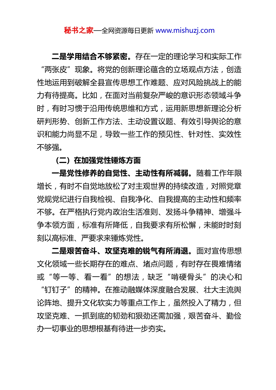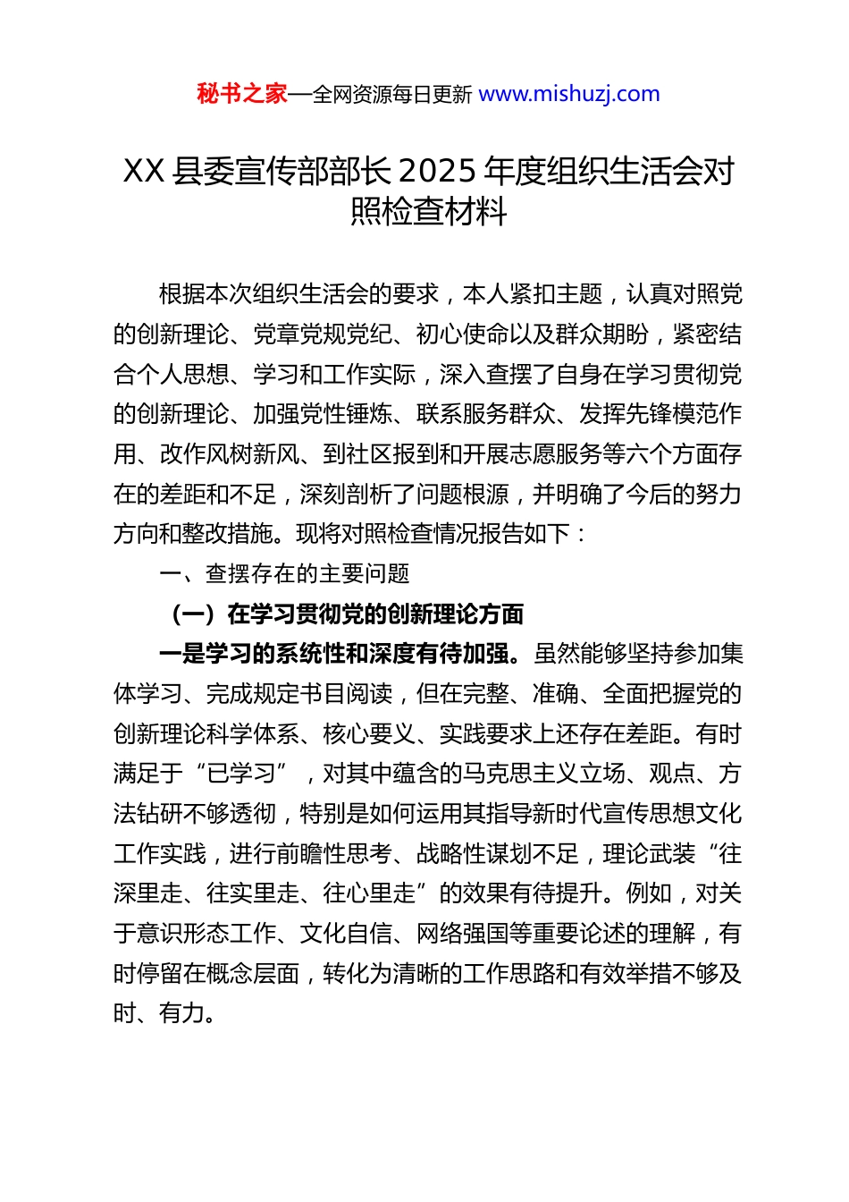 秘书之家—全网资源每日更新 www.mishuzj.comXX 县委宣传部部长 2025 年度组织生活会对照检查材料根据本次组织生活会的要求,本人紧扣主题,认真对照党的创新理论、党章党规党纪、初心使命以及群众期盼,紧密结合个人思想、学习和工作实际,深入查摆了自身在学习贯彻党的创新理论、加强党性锤炼、联系服务群众、发挥先锋模范作用、改作风树新风、到社区报到和开展志愿服务等六个方面存在的差距和不足,深刻剖析了问题根源,并明确了今后的努力方向和整改措施。现将对照检查情况报告如下:一、查摆存在的主要问题(一)在学习贯彻党的创新理论方面一是学习的系统性和深度有待加强。虽然能够坚持参加集体学习、完成规定书目阅读,但在完整、准确、全面把握党的创新理论科学体系、核心要义、实践要求上还存在差距。有时满足于“已学习”,对其中蕴含的马克思主义立场、观点、方法钻研不够透彻,特别是如何运用其指导新时代宣传思想文化工作实践,进行前瞻性思考、战略性谋划不足,理论武装“往深里走、往实里走、往心里走”的效果有待提升。例如,对关于意识形态工作、文化自信、网络强国等重要论述的理解,有时停留在概念层面,转化为清晰的工作思路和有效举措不够及时、有力。秘书之家—全网资源每日更新 www.mishuzj.com二是学用结合不够紧密。存在一定的理论学习和实际工作“两张皮”现象。将党的创新理论蕴含的立场观点方法,创造性地运用到破解全县宣传思想工作难题、应对风险挑战上的能力有待提高。比如,在面对当前复杂严峻的意识形态领域斗争时,有时习惯于沿用传统思维和方式,运用新思想新理论分析研判形势、创新工作方法、主动设置议题、有效引导舆论的意识和能力尚显不足,导致一些工作的预见性、针对性、实效性不够强。(二)在加强党性锤炼方面一是党性修养的自觉性、主动性有所减弱。随着工作年限增长,有时不自觉地放松了对主观世界的持续改造,对照党章党规党纪进行自我检视、自我净化、自我提高的主动性和频率不够。在严格执行党内政治生活准则、发扬斗争精神、增强斗争本领方面,标准有所降低,自我要求有所松懈,未能时时刻刻以高标准、严要求来锤炼党性。二是艰苦奋斗、攻坚克难的锐气有所消退。面对宣传思想文化领域一些长期存在的难点、堵点问题,有时存在畏难情绪或“等一等、看一看”的想法,缺乏“啃硬骨头”的决心和“钉钉子”的精神。在推动融媒体深度融合发展、壮大主流舆论阵地、提升文化软实力等重点工作上,虽然投入了精力,但攻坚克难、一抓到底的韧劲和狠劲还需加强,艰苦奋斗、勤俭办一切事业的思想根基有待进一步夯实。秘书之家—全网资源每日更新 www.mishuzj.com(三)在联系服务群众方面一是深入基层调研不够扎实。存在“事务主义”倾向,坐在办公室听汇报、看材料的时间相对较多,真正“扑下身子、沉到一线”,与基层群众面对面交流、心贴心沟通做得不够。调研有时存在“走马观花”、预设路线的情况,对群众在精神文化需求、精神文明建设、基层宣传阵地建设等方面的所思所想所盼,掌握得不够全面、精准、鲜活,导致制定政策、策划活动、提供服务时,与群众的实际需求有时存在偏差。二是解决群众急难愁盼问题的力度有待加大。虽然能够关注并推动解决一些群众反映的文化生活单一、网络谣言侵扰等问题,但主动发现问题、系统解决问题的意识和能力还需提升。对于群众反映的一些涉及深层次体制机制或需要多方协调的难题,有时跟进协调不够紧,推动解决的成效不够显著,距离“群众满意”的标准还有差距。在利用宣传资源服务群众、赋能基层治理方面,思路和举措还可以更开阔、更有效。(四)在发挥先锋模范作用方面(包括在网络空间发挥作用情况)一是立足岗位创先争优的标准不够高。对照先进典型,有时觉得自己工作按部就班完成了,但在精益求精、追求卓越方面还有不足。在理论宣讲创新、文明实践活动品牌打造、对外宣传影响力提升等方面,主动对标一流、争创一流的劲头有所不足,满足于“过得去”,未能时时处处起到“走在前、作表秘书之家—全网资源每日更新 www.mishuzj.com率”的标杆作用。二是在网络空间发挥引领作用不够充分。作为宣...