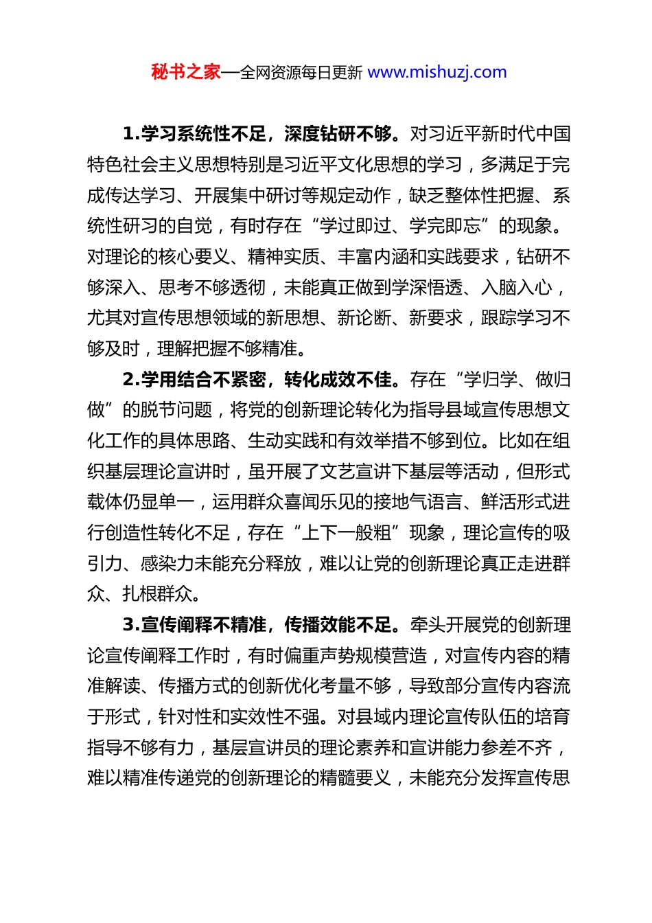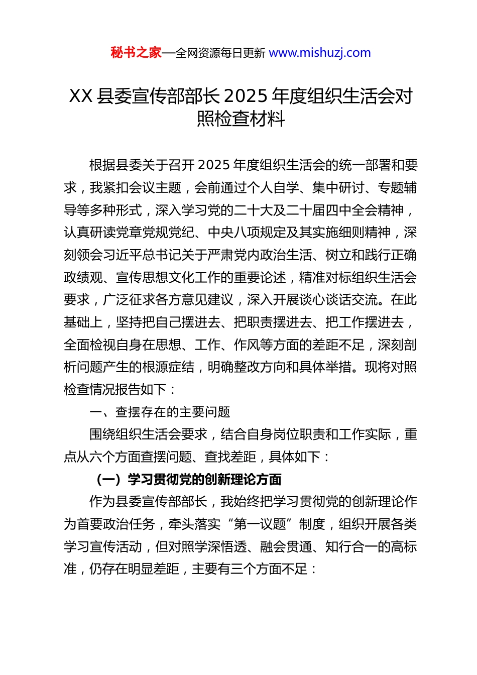 秘书之家—全网资源每日更新 www.mishuzj.comXX 县委宣传部部长 2025 年度组织生活会对照检查材料根据县委关于召开 2025 年度组织生活会的统一部署和要求,我紧扣会议主题,会前通过个人自学、集中研讨、专题辅导等多种形式,深入学习党的二十大及二十届四中全会精神,认真研读党章党规党纪、中央八项规定及其实施细则精神,深刻领会习近平总书记关于严肃党内政治生活、树立和践行正确政绩观、宣传思想文化工作的重要论述,精准对标组织生活会要求,广泛征求各方意见建议,深入开展谈心谈话交流。在此基础上,坚持把自己摆进去、把职责摆进去、把工作摆进去,全面检视自身在思想、工作、作风等方面的差距不足,深刻剖析问题产生的根源症结,明确整改方向和具体举措。现将对照检查情况报告如下:一、查摆存在的主要问题围绕组织生活会要求,结合自身岗位职责和工作实际,重点从六个方面查摆问题、查找差距,具体如下:(一)学习贯彻党的创新理论方面作为县委宣传部部长,我始终把学习贯彻党的创新理论作为首要政治任务,牵头落实“第一议题”制度,组织开展各类学习宣传活动,但对照学深悟透、融会贯通、知行合一的高标准,仍存在明显差距,主要有三个方面不足:秘书之家—全网资源每日更新 www.mishuzj.com1.学习系统性不足,深度钻研不够。对习近平新时代中国特色社会主义思想特别是习近平文化思想的学习,多满足于完成传达学习、开展集中研讨等规定动作,缺乏整体性把握、系统性研习的自觉,有时存在“学过即过、学完即忘”的现象。对理论的核心要义、精神实质、丰富内涵和实践要求,钻研不够深入、思考不够透彻,未能真正做到学深悟透、入脑入心,尤其对宣传思想领域的新思想、新论断、新要求,跟踪学习不够及时,理解把握不够精准。2.学用结合不紧密,转化成效不佳。存在“学归学、做归做”的脱节问题,将党的创新理论转化为指导县域宣传思想文化工作的具体思路、生动实践和有效举措不够到位。比如在组织基层理论宣讲时,虽开展了文艺宣讲下基层等活动,但形式载体仍显单一,运用群众喜闻乐见的接地气语言、鲜活形式进行创造性转化不足,存在“上下一般粗”现象,理论宣传的吸引力、感染力未能充分释放,难以让党的创新理论真正走进群众、扎根群众。3.宣传阐释不精准,传播效能不足。牵头开展党的创新理论宣传阐释工作时,有时偏重声势规模营造,对宣传内容的精准解读、传播方式的创新优化考量不够,导致部分宣传内容流于形式,针对性和实效性不强。对县域内理论宣传队伍的培育指导不够有力,基层宣讲员的理论素养和宣讲能力参差不齐,难以精准传递党的创新理论的精髓要义,未能充分发挥宣传思秘书之家—全网资源每日更新 www.mishuzj.com想工作统一思想、凝聚合力的核心作用。(二)加强党性锤炼方面始终以习近平新时代中国特色社会主义思想武装头脑,坚守共产党人精神追求,自觉加强党性修养,但对照党性锤炼高标准、严要求,仍存在短板弱项,集中体现为三个方面问题:1.党性锻炼主动性不足,存在被动应付倾向。随着事务性工作日益繁重,不自觉放松了持续性党性修养,静下心来对照党章党规反躬自省、洗涤灵魂的时间被挤压。以普通党员身份参加所在支部组织生活时,有时抱有“例行公事”心态,运用批评和自我批评武器不够充分,辣味不足,未能真正达到“红脸出汗、净化思想、锤炼党性”的预期效果,自我净化、自我完善、自我革新、自我提高的主动性不够强。2.纪律规矩认知有偏差,细节把控不够严格。坚决拥护执行中央八项规定精神,但在细节小事上自我要求不够严格,存在认知偏差。如下基层调研时,虽严格遵守接待规定,但对“零接待”的极端严格标准理解不够深刻,潜意识里存在“不超标即可”的松懈思想;在宣传经费、项目资金使用管理上,虽能把控大方向,但对资金使用绩效的精细化评估、全过程监管投入精力不足,存在“重投入、轻问效”的潜在风险。3.艰苦奋斗精神弱化,进取意识不够强烈。思想上受“条件改善”认知影响,在非原则性工作上不自觉放松标准。工作中更倾向于策划见效快、易出彩的“显绩”活动,对农村精神秘书之家—全网资源每日更新 www.mishuzj.c...