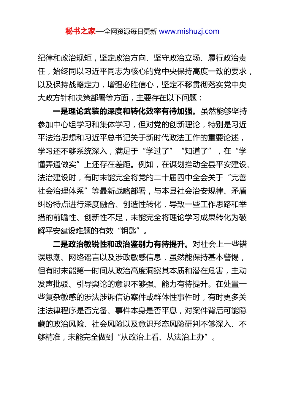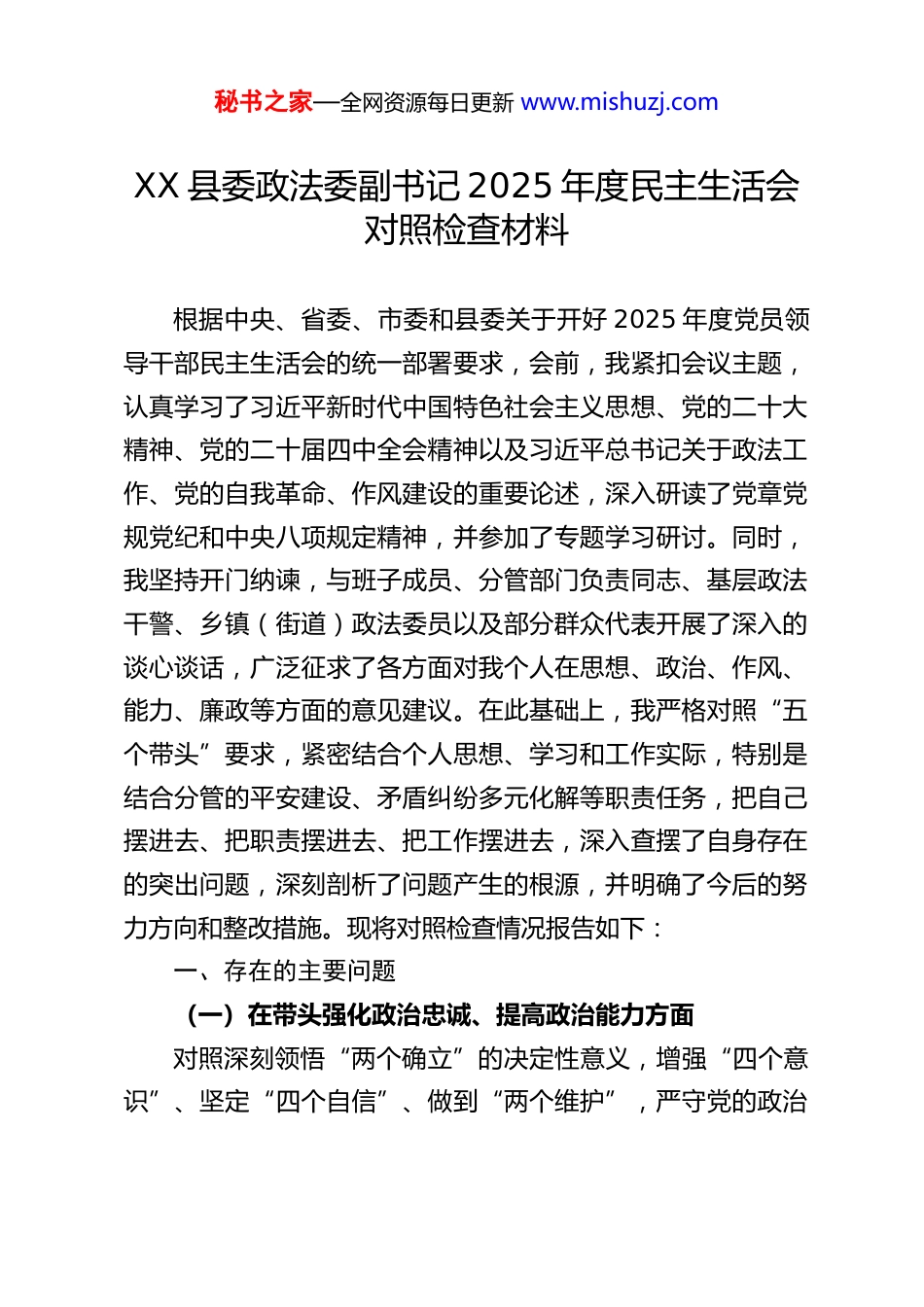 秘书之家—全网资源每日更新 www.mishuzj.comXX 县委政法委副书记 2025 年度民主生活会对照检查材料根据中央、省委、市委和县委关于开好 2025 年度党员领导干部民主生活会的统一部署要求,会前,我紧扣会议主题,认真学习了习近平新时代中国特色社会主义思想、党的二十大精神、党的二十届四中全会精神以及习近平总书记关于政法工作、党的自我革命、作风建设的重要论述,深入研读了党章党规党纪和中央八项规定精神,并参加了专题学习研讨。同时,我坚持开门纳谏,与班子成员、分管部门负责同志、基层政法干警、乡镇(街道)政法委员以及部分群众代表开展了深入的谈心谈话,广泛征求了各方面对我个人在思想、政治、作风、能力、廉政等方面的意见建议。在此基础上,我严格对照“五个带头”要求,紧密结合个人思想、学习和工作实际,特别是结合分管的平安建设、矛盾纠纷多元化解等职责任务,把自己摆进去、把职责摆进去、把工作摆进去,深入查摆了自身存在的突出问题,深刻剖析了问题产生的根源,并明确了今后的努力方向和整改措施。现将对照检查情况报告如下:一、存在的主要问题(一)在带头强化政治忠诚、提高政治能力方面对照深刻领悟“两个确立”的决定性意义,增强“四个意识”、坚定“四个自信”、做到“两个维护”,严守党的政治秘书之家—全网资源每日更新 www.mishuzj.com纪律和政治规矩,坚定政治方向、坚守政治立场、履行政治责任,始终同以习近平同志为核心的党中央保持高度一致的要求,以及保持战略定力,增强必胜信心,坚定不移贯彻落实党中央大政方针和决策部署等方面,主要存在以下问题:一是理论武装的深度和转化效率有待加强。虽然能够坚持参加中心组学习和集体学习,但对党的创新理论,特别是习近平法治思想和习近平总书记关于新时代政法工作的重要论述,学习还不够系统深入,满足于“学过了”“知道了”,在“学懂弄通做实”上还存在差距。例如,在谋划推动全县平安建设、法治建设时,有时未能完全将党的二十届四中全会关于“完善社会治理体系”等最新战略部署,与本县社会治安规律、矛盾纠纷特点进行深度融合、创造性转化,导致一些工作思路和举措的前瞻性、创新性不足,未能完全将理论学习成果转化为破解平安建设难题的有效“钥匙”。二是政治敏锐性和政治鉴别力有待提升。对社会上一些错误思潮、网络谣言以及涉政敏感信息,虽然能保持基本警惕,但有时未能第一时间从政治高度洞察其本质和潜在危害,主动发声批驳、引导舆论的意识不够强、能力有待提升。在处置一些复杂敏感的涉法涉诉信访案件或群体性事件时,有时更多关注法律程序是否完备、事件本身是否平息,对案件背后可能隐藏的政治风险、社会风险以及意识形态风险研判不够深入、不够精准,未能完全做到“从政治上看、从法治上办”。秘书之家—全网资源每日更新 www.mishuzj.com三是贯彻落实上级决策部署的“最后一公里”有时存在温差。对中央、省委、市委和县委关于政法工作的决策部署,能够做到坚决拥护、迅速传达,但在结合我县实际创造性落实上,有时存在“等上级文件、靠领导指示、要兄弟县区经验”的思维惯性,主动谋划、先行先试的勇气和锐气不足。例如,在推进矛盾纠纷多元化解“一站式”平台提档升级工作中,对于如何整合司法、行政、信访、调解等各类资源,真正形成“一盘棋”格局,思考谋划不够深入,破解部门壁垒、数据孤岛等难题的硬招实招不多,导致平台的整体效能未能完全释放,与“将矛盾化解在基层、化解在萌芽状态”的目标要求尚有差距。(二)在带头固本培元、增强党性方面对照坚持把政治修养摆在党性修养的首位,自觉以习近平新时代中国特色社会主义思想凝心铸魂,坚守共产党人精神追求,解决好世界观、人生观、价值观总开关问题。认真学习党章党规党纪,始终用党性原则正心明道、修身律己,坚定理想信念、筑牢对党忠诚、厚植为民情怀、纯正道德品质、保持清正廉洁等方面,主要存在以下问题:一是党性锻炼的主动性和自觉性有待增强。参加委机关党支部组织生活有时以工作忙为由不够积极主动,以普通党员身份接受监督、开展批评与自我批评的意识不够强。在民主生活会、组织生活...