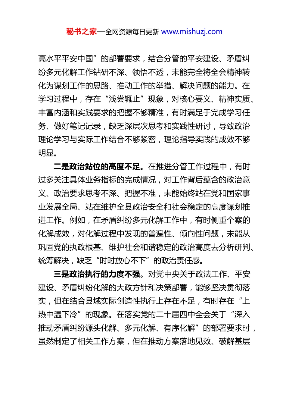 秘书之家—全网资源每日更新 www.mishuzj.comXX 县委政法委副书记 2025 年度民主生活会对照检查材料根据县委关于召开 2025 年度民主生活会的统一部署和要求,本人紧扣会议主题,围绕“学思想、强党性、重实践、建新功”总要求,深入学习领会习近平新时代中国特色社会主义思想、党的二十大和二十届二中、三中、四中全会精神,认真贯彻落实习近平法治思想、总体国家安全观,结合深入贯彻中央八项规定精神学习教育部署,立足县委政法委副书记岗位职责,重点分管平安建设、矛盾纠纷多元化解等工作,通过自我反思、群众提、同事帮、上级点等方式,全面查摆自身存在的问题,深刻剖析问题产生的根源,明确今后努力方向和整改措施。现将对照检查情况报告如下,恳请各位领导和同事批评指正。一、存在的主要问题围绕民主生活会要求,结合自身分管工作实际,从五个方面深入查摆,主要存在以下问题,做到不回避、不遮掩、不敷衍,实事求是检视自身不足。(一)在带头强化政治忠诚、提高政治能力方面一是政治领悟的深度不够。对习近平新时代中国特色社会主义思想、党的二十届四中全会精神的学习不够系统深入,尤其是对全会提出的“推进国家安全体系和能力现代化,建设更秘书之家—全网资源每日更新 www.mishuzj.com高水平平安中国”的部署要求,结合分管的平安建设、矛盾纠纷多元化解工作钻研不深、领悟不透,未能完全将全会精神转化为谋划工作的思路、推动工作的举措、解决问题的能力。在学习过程中,存在“浅尝辄止”现象,对核心要义、精神实质、丰富内涵和实践要求的把握不够精准,有时满足于完成学习任务、做好笔记记录,缺乏深层次思考和实践性研讨,导致政治理论学习与实际工作结合不够紧密,理论指导实践的成效不够明显。二是政治站位的高度不足。在推进分管工作过程中,有时过多关注具体业务指标的完成情况,对工作背后蕴含的政治意义、政治要求思考不深、把握不准,未能始终站在党和国家事业发展全局、站在维护全县政治安全和社会稳定的高度谋划推进工作。例如,在矛盾纠纷多元化解工作中,有时侧重个案的化解成效,对化解过程中发现的普遍性、倾向性问题,未能从巩固党的执政根基、维护社会和谐稳定的政治高度去分析研判、统筹解决,缺乏“时时放心不下”的政治责任感。三是政治执行的力度不强。对党中央关于政法工作、平安建设、矛盾纠纷化解的大政方针和决策部署,能够坚决贯彻落实,但在结合县域实际创造性执行上存在不足,有时存在“上热中温下冷”的现象。在落实党的二十届四中全会关于“深入推动矛盾纠纷源头化解、多元化解、有序化解”的部署要求时,虽然制定了相关工作方案,但在推动方案落地见效、破解基层秘书之家—全网资源每日更新 www.mishuzj.com化解难题上力度不够,部分基层单位存在落实不到位、执行打折扣的情况,未能充分发挥矛盾纠纷多元化解的整体效能。同时,在贯彻落实上级决策部署过程中,缺乏钉钉子精神,有时存在重部署、轻落实,重形式、轻实效的问题。四是政治敏锐性不够强。面对县域内复杂的社会环境和意识形态领域形势,对一些苗头性、倾向性问题察觉不够及时、预判不够准确,缺乏前瞻性和主动性。在分管平安建设工作中,对一些可能引发社会不稳定的隐患问题,未能及时发现、提前介入、有效处置,有时存在被动应对的情况。例如,在处理涉众型矛盾纠纷时,对舆情风险的预判不足,未能及时做好舆情引导和管控工作,存在一定的政治风险隐患,反映出自身政治洞察力和风险防范能力仍有差距。(二)在带头固本培元、增强党性方面本人始终坚持把政治修养摆在党性修养的首位,自觉以习近平新时代中国特色社会主义思想凝心铸魂,坚守共产党人精神追求,努力解决好世界观、人生观、价值观这个总开关问题,认真学习党章党规党纪,始终用党性原则正心明道、修身律己,但对照党性修养的高标准、严要求,仍存在一些薄弱环节。一是理论武装不够扎实。对习近平新时代中国特色社会主义思想的学习缺乏系统性和持续性,存在“学用脱节”的问题。学习计划的针对性不强,多以集中学习、传达文件为主,结合分管工作实际开展的专题研讨、实地调研较少,导致对党的创秘...
