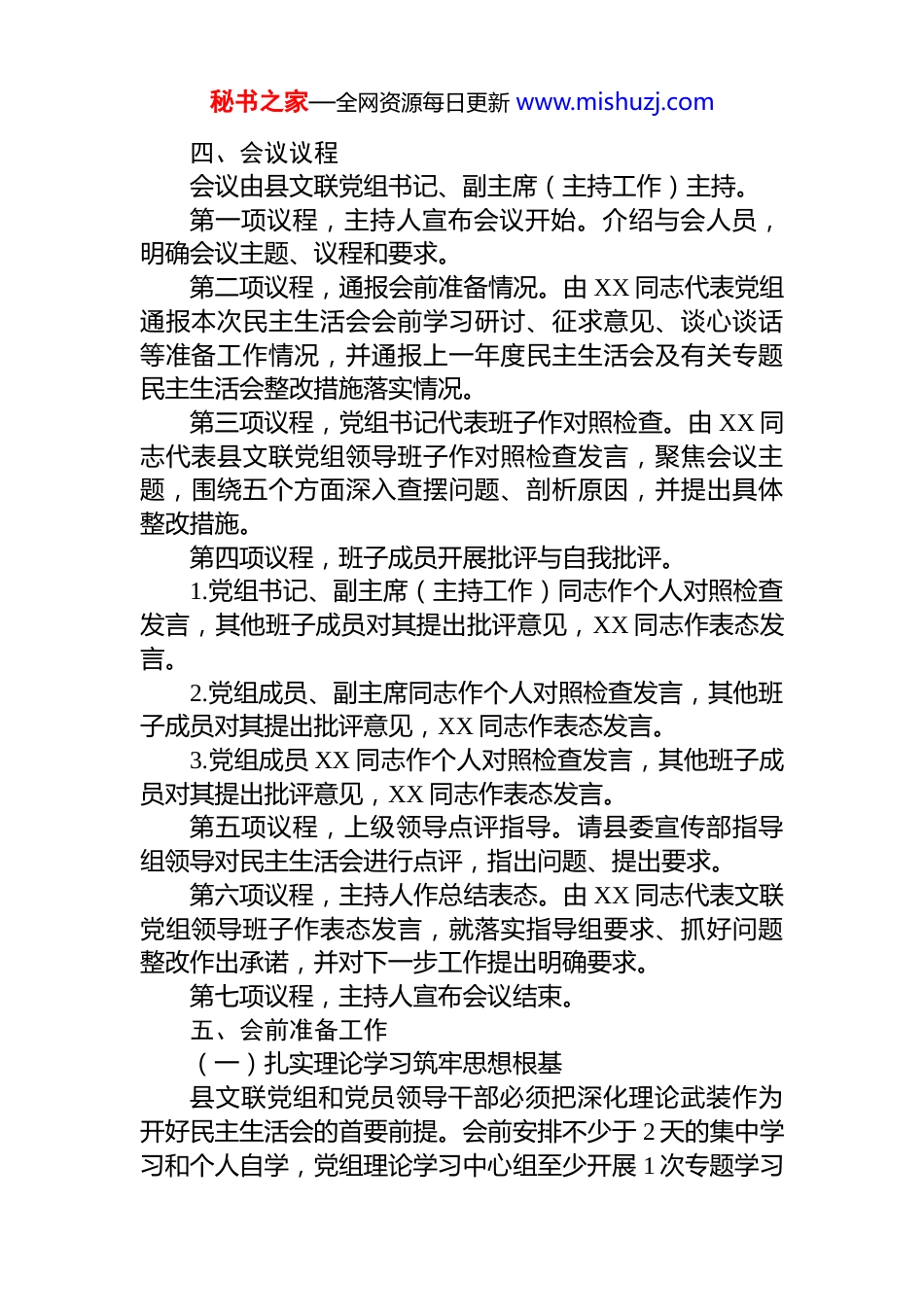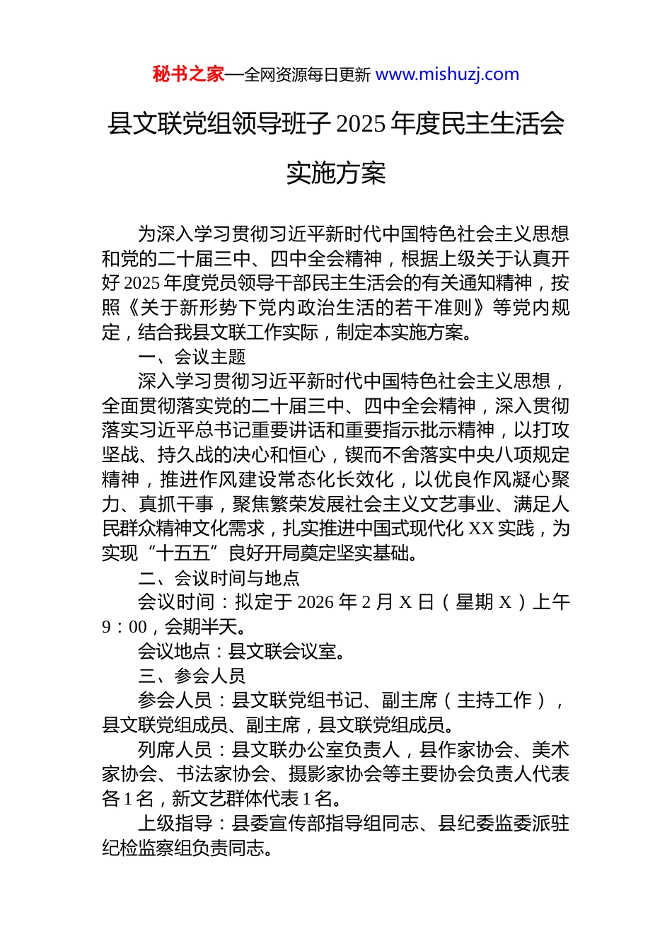 秘书之家—全网资源每日更新 www.mishuzj.com县文联党组领导班子 2025 年度民主生活会实施方案为深入学习贯彻习近平新时代中国特色社会主义思想和党的二十届三中、四中全会精神,根据上级关于认真开好 2025 年度党员领导干部民主生活会的有关通知精神,按照《关于新形势下党内政治生活的若干准则》等党内规定,结合我县文联工作实际,制定本实施方案。一、会议主题深入学习贯彻习近平新时代中国特色社会主义思想,全面贯彻落实党的二十届三中、四中全会精神,深入贯彻落实习近平总书记重要讲话和重要指示批示精神,以打攻坚战、持久战的决心和恒心,锲而不舍落实中央八项规定精神,推进作风建设常态化长效化,以优良作风凝心聚力、真抓干事,聚焦繁荣发展社会主义文艺事业、满足人民群众精神文化需求,扎实推进中国式现代化 XX 实践,为实现“十五五”良好开局奠定坚实基础。二、会议时间与地点会议时间:拟定于 2026 年 2 月 X 日(星期 X)上午9:00,会期半天。会议地点:县文联会议室。三、参会人员参会人员:县文联党组书记、副主席(主持工作),县文联党组成员、副主席,县文联党组成员。列席人员:县文联办公室负责人,县作家协会、美术家协会、书法家协会、摄影家协会等主要协会负责人代表各 1 名,新文艺群体代表 1 名。上级指导:县委宣传部指导组同志、县纪委监委派驻纪检监察组负责同志。秘书之家—全网资源每日更新 www.mishuzj.com四、会议议程会议由县文联党组书记、副主席(主持工作)主持。第一项议程,主持人宣布会议开始。介绍与会人员,明确会议主题、议程和要求。第二项议程,通报会前准备情况。由 XX 同志代表党组通报本次民主生活会会前学习研讨、征求意见、谈心谈话等准备工作情况,并通报上一年度民主生活会及有关专题民主生活会整改措施落实情况。第三项议程,党组书记代表班子作对照检查。由 XX 同志代表县文联党组领导班子作对照检查发言,聚焦会议主题,围绕五个方面深入查摆问题、剖析原因,并提出具体整改措施。第四项议程,班子成员开展批评与自我批评。1.党组书记、副主席(主持工作)同志作个人对照检查发言,其他班子成员对其提出批评意见,XX 同志作表态发言。2.党组成员、副主席同志作个人对照检查发言,其他班子成员对其提出批评意见,XX 同志作表态发言。3.党组成员 XX 同志作个人对照检查发言,其他班子成员对其提出批评意见,XX 同志作表态发言。第五项议程,上级领导点评指导。请县委宣传部指导组领导对民主生活会进行点评,指出问题、提出要求。第六项议程,主持人作总结表态。由 XX 同志代表文联党组领导班子作表态发言,就落实指导组要求、抓好问题整改作出承诺,并对下一步工作提出明确要求。第七项议程,主持人宣布会议结束。五、会前准备工作(一)扎实理论学习筑牢思想根基县文联党组和党员领导干部必须把深化理论武装作为开好民主生活会的首要前提。会前安排不少于 2 天的集中学习和个人自学,党组理论学习中心组至少开展 1 次专题学习秘书之家—全网资源每日更新 www.mishuzj.com研讨。学习内容包括但不限于:习近平新时代中国特色社会主义思想,党的二十届三中、四中全会精神,习近平总书记关于党的建设的重要思想,关于严肃党内政治生活、加强作风建设的重要论述,特别是习近平总书记在中国文联十一大、中国作协十大开幕式上的重要讲话精神和关于文艺工作的系列重要指示批示。同时,深入学习党章、《关于新形势下党内政治生活的若干准则》、《中国共产党纪律处分条例》以及中央八项规定及其实施细则精神。通过学习,切实把思想和行动统一到党中央决策部署和上级党委工作要求上来,为开好民主生活会打下坚实的思想理论基础。(二)广泛征求意见开门听取建议坚持开门纳谏,通过发放征求意见函、召开座谈会、个别访谈等多种形式,广泛征求机关干部职工、各文艺家协会、基层文艺工作者、新文艺群体代表以及服务对象等方面的意见建议。座谈会范围要覆盖老、中、青三代文艺家代表,确保意见的广泛性和代表性。对征求到的意见建议,由文联办公室进行梳理汇总,形成问题清单,原汁原味地向党组...