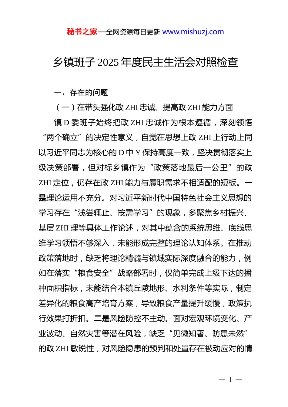 秘书之家—全网资源每日更新 www.mishuzj.com乡镇班子 2025 年度民主生活会对照检查一、存在的问题(一)在带头强化政 ZHI 忠诚、提高政 ZHI 能力方面镇 D 委班子始终把政 ZHI 忠诚作为根本遵循,深刻领悟“两个确立”的决定性意义,自觉在思想上政 ZHI 上行动上同以习近平同志为核心的 D 中 Y 保持高度一致,坚决贯彻落实上级决策部署,但对标乡镇作为“政策落地最后一公里”的政ZHI 定位,仍存在政 ZHI 能力与履职需求不相适配的短板。一是理论运用不充分。对习近平新时代中国特色社会主义思想的学习存在“浅尝辄止、按需学习”的现象,多聚焦乡村振兴、基层 ZHI 理等具体工作论述,对其中蕴含的系统思维、底线思维学习领悟不够深入,未能形成完整的理论认知体系。在推动政策落地时,缺乏将理论精髓与镇域实际深度融合的能力,例如在落实“粮食安全”战略部署时,仅简单完成上级下达的播种面积指标,未能结合本镇丘陵地形、水利条件等实际,制定差异化的粮食高产培育方案,导致粮食产量提升缓慢,政策执行效果打折扣。二是风险防控不主动。面对宏观环境变化、产业波动、自然灾害等潜在风险,缺乏“见微知著、防患未然”的政 ZHI 敏锐性,对风险隐患的预判和处置存在被动应对的情— 1 —秘书之家—全网资源每日更新 www.mishuzj.com况。如 2025 年汛期来临前,对辖区内老旧堤坝、低洼村庄的风险排查不够全面,未提前制定针对性的防汛预案,导致汛期出现局部内涝,影响了群众生命财产安全;在推动特色农产品产销时,未能及时预判市场价格波动风险,未建立产销对接长效机制,导致部分农户出现农产品滞销问题。三是政策落地不扎实。在推动上级决策部署向下传导过程中,存在“上热中温下冷”的现象,对村(社区)政策执行的督导检查不够精准有力,导致部分政策在基层“变形走样”。例如在落实农村人居环境整 ZHI 提升政策时,部分村存在“重表面清洁、轻长效管护”的问题,镇 D 委班子未能及时发现并纠正,导致整 ZHI 成效难以持续;在推进惠民资金发放工作中,对资金发放的全程监管不够严格,出现个别村延迟发放、漏发的情况,损害了群众利益。四是发展谋划不系统。在谋划镇域发展时,有时存在“重短期成效、轻长远布局”“重局部利益、轻全局协调”的倾向,对镇域产业发展、基础设施建设、公共服务供给等工作统筹不够全面。如在推进工业园区建设时,过度关注项目引进数量,对园区配套的污水处理、交通物流等基础设施规划滞后,影响了企业落地后的生产经营;在统筹城乡发展时,重点聚焦镇区建设,对偏远村庄的道路硬化、饮水安全等民生工程投入不足,城乡发展差距未能有效缩小。— 2 —秘书之家—全网资源每日更新 www.mishuzj.com(二)在带头固本培元、增强 D 性方面镇 D 委班子始终坚持以 D 性修养锤炼队伍,努力发挥领导核心作用,但自觉锤炼 D 性的主动性、持续性仍需加强,D 性修养与基层 D 组织“战斗堡垒”的定位要求存在差距。一是组织生活不够严肃。存在“重业务、轻 D 建”的倾向,将镇域经济发展成效等同于 D 性修养提升,对 D 内政 ZHI 生活的重要性认识不够深刻。在召开 D 委民主生活会时,班子成员之间的批评与自我批评存在“辣味”不足的问题,多以工作建议代替问题指出,对自身问题的剖析多停留在表面,未能真正达到“红脸出汗、排毒 ZHI 病”的效果;在指导村(社区)D 组织开展“三会一课”时,存在“重次数统计、轻质量提升”的现象,对组织生活的内容、形式指导不够精准,导致部分村(社区)组织生活流于形式,难以发挥教育 D 员、凝聚群众的作用。二是攻坚破难不够坚决。面对镇域发展中的深层次矛盾和历史遗留问题,虽然有攻坚的决心,但有时存在“畏难情绪、求稳心态”,缺乏“逢山开路、遇水架桥”的闯劲和“一抓到底、久久为功”的韧劲。例如在推进农村土地流转工作中,因涉及农户利益协调,部分村存在抵触情绪,镇 D 委班子未能主动牵头制定突破性的解决方案,而是过度依赖村“两委”干部协调,导致土地流转工作推进缓慢,影响了规模化农业发展;在解决— 3 —秘书之家—全网资源每...