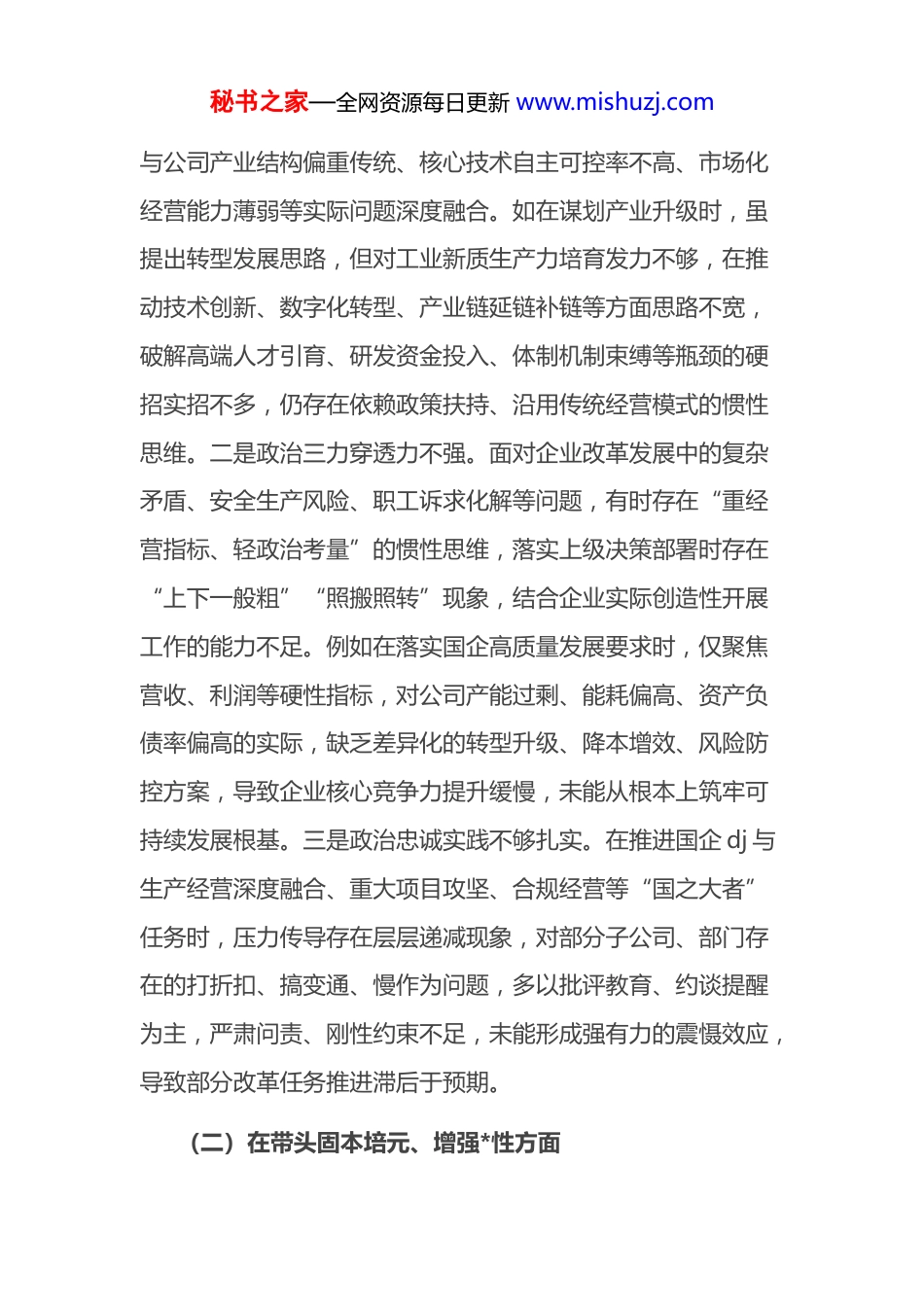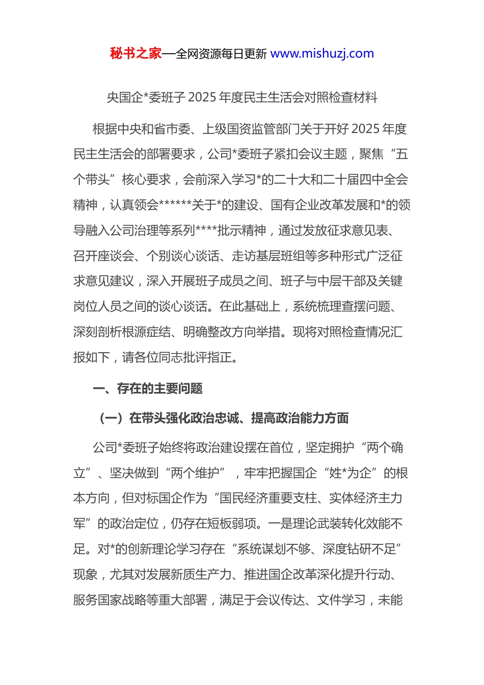 秘书之家—全网资源每日更新 www.mishuzj.com央国企*委班子 2025 年度民主生活会对照检查材料根据中央和省市委、上级国资监管部门关于开好 2025 年度民主生活会的部署要求,公司*委班子紧扣会议主题,聚焦“五个带头”核心要求,会前深入学习*的二十大和二十届四中全会精神,认真领会******关于*的建设、国有企业改革发展和*的领导融入公司治理等系列****批示精神,通过发放征求意见表、召开座谈会、个别谈心谈话、走访基层班组等多种形式广泛征求意见建议,深入开展班子成员之间、班子与中层干部及关键岗位人员之间的谈心谈话。在此基础上,系统梳理查摆问题、深刻剖析根源症结、明确整改方向举措。现将对照检查情况汇报如下,请各位同志批评指正。一、存在的主要问题(一)在带头强化政治忠诚、提高政治能力方面公司*委班子始终将政治建设摆在首位,坚定拥护“两个确立”、坚决做到“两个维护”,牢牢把握国企“姓*为企”的根本方向,但对标国企作为“国民经济重要支柱、实体经济主力军”的政治定位,仍存在短板弱项。一是理论武装转化效能不足。对*的创新理论学习存在“系统谋划不够、深度钻研不足”现象,尤其对发展新质生产力、推进国企改革深化提升行动、服务国家战略等重大部署,满足于会议传达、文件学习,未能秘书之家—全网资源每日更新 www.mishuzj.com与公司产业结构偏重传统、核心技术自主可控率不高、市场化经营能力薄弱等实际问题深度融合。如在谋划产业升级时,虽提出转型发展思路,但对工业新质生产力培育发力不够,在推动技术创新、数字化转型、产业链延链补链等方面思路不宽,破解高端人才引育、研发资金投入、体制机制束缚等瓶颈的硬招实招不多,仍存在依赖政策扶持、沿用传统经营模式的惯性思维。二是政治三力穿透力不强。面对企业改革发展中的复杂矛盾、安全生产风险、职工诉求化解等问题,有时存在“重经营指标、轻政治考量”的惯性思维,落实上级决策部署时存在“上下一般粗”“照搬照转”现象,结合企业实际创造性开展工作的能力不足。例如在落实国企高质量发展要求时,仅聚焦营收、利润等硬性指标,对公司产能过剩、能耗偏高、资产负债率偏高的实际,缺乏差异化的转型升级、降本增效、风险防控方案,导致企业核心竞争力提升缓慢,未能从根本上筑牢可持续发展根基。三是政治忠诚实践不够扎实。在推进国企 dj 与生产经营深度融合、重大项目攻坚、合规经营等“国之大者”任务时,压力传导存在层层递减现象,对部分子公司、部门存在的打折扣、搞变通、慢作为问题,多以批评教育、约谈提醒为主,严肃问责、刚性约束不足,未能形成强有力的震慑效应,导致部分改革任务推进滞后于预期。(二)在带头固本培元、增强*性方面秘书之家—全网资源每日更新 www.mishuzj.com公司*委班子成员能够按要求参加*的组织生活,自觉加强*性修养,但*性锻炼的经常性、严肃性、深刻性仍需加强。一是理想信念“钙质”补充不足。部分同志随着任职年限增长,逐渐产生“松劲歇脚”“求稳守成”思想,艰苦奋斗、攻坚克难的精气神有所弱化,认为自身*性修养已达标准,放松了持续的自我革命和思想淬炼。对社会上关于国企改革的错误言论、模糊认识以及行业内的不良风气,虽能做到不信不传,但主动发声亮剑、坚决斗争的锐气不足,存在“多一事不如少一事”的避事心态,未能充分发挥*委班子的引领示范作用。二是*内政治生活“熔炉”作用发挥不充分。民主生活会、组织生活会虽能按时召开,但有时存在“辣味”不足、“人情味”过浓的问题,自我批评多聚焦工作层面,对思想灵魂深处的问题触及较少、剖析不深;相互批评存在“老好人”思想,怕伤和气、怕影响团结,多以工作建议代替批评意见,点到为止、隔靴搔痒,未能真正达到红脸出汗、排毒治病的效果,*内政治生活的政治性、时代性、原则性、战斗性有待提升。三是宗旨意识根脉扎得不深。虽然坚持开展基层调研,但有时存在“身入”而“心未至”的情况,听部门汇报、看亮点工作多,深入生产一线、车间班组与职工坐一条板凳拉家常、听真话、察实情少。对职工反映强烈的薪酬福利优化、技能提升培训、困难职工帮扶等问题,存在畏难情绪和...