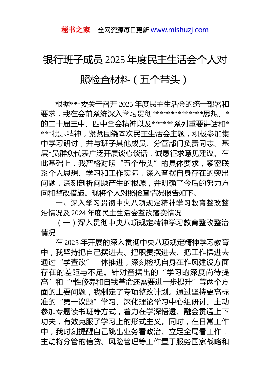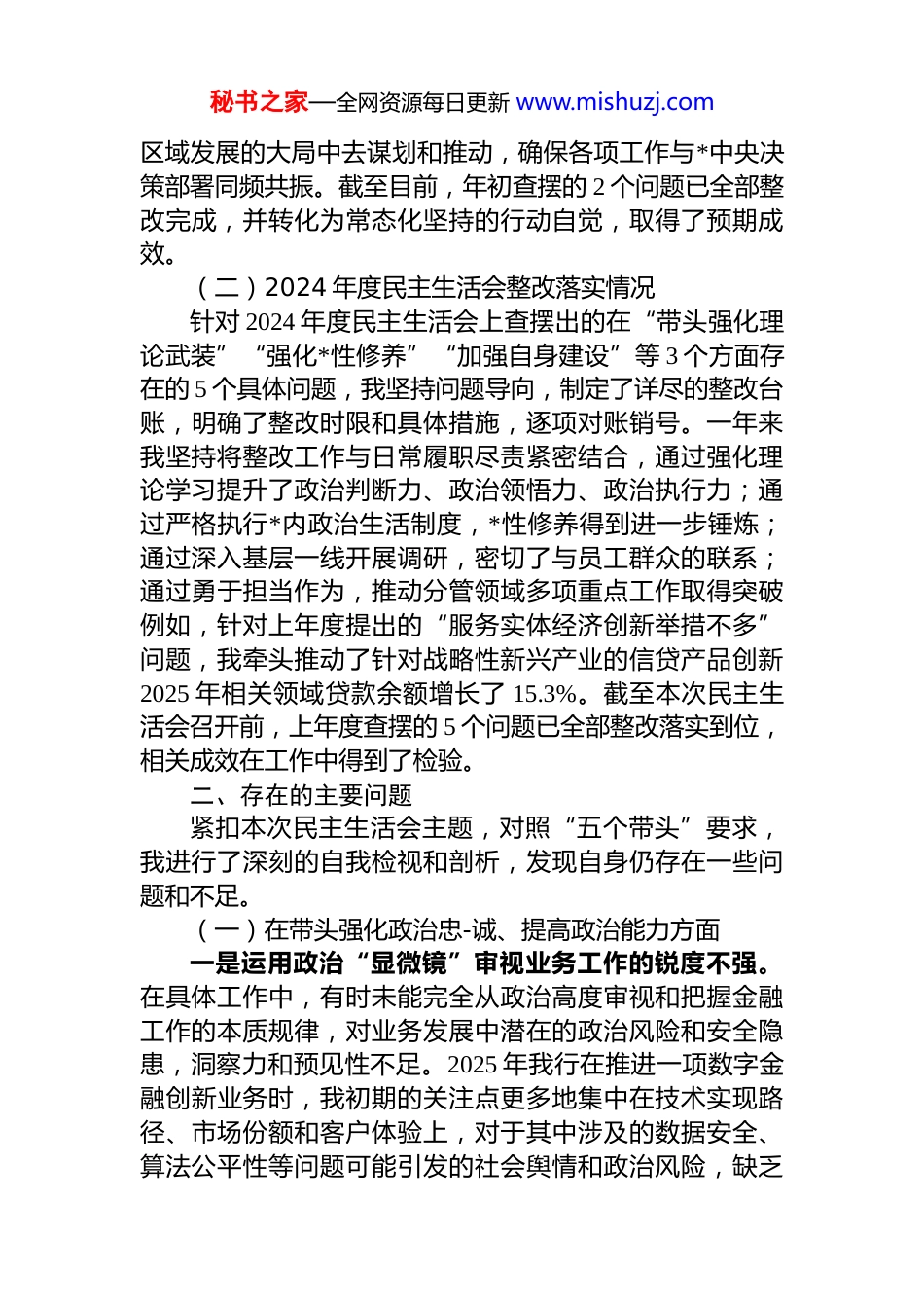 秘书之家—全网资源每日更新 www.mishuzj.com银行班子成员 2025 年度民主生活会个人对照检查材料(五个带头)根据***委关于召开 2025 年度民主生活会的统一部署和要求,我在会前系统深入学习贯彻**************思想、*的二十届三中、四中全会精神以及******系列重要讲话和****批示精神,紧紧围绕本次民主生活会主题,积极参加集中学习研讨,并与班子其他成员、分管部门负责同志、基层*员群众代表广泛开展谈心谈话,诚恳征求意见建议。在此基础上,我严格对照“五个带头”的具体要求,紧密联系个人思想、学习和工作实际,深入查摆自身存在的突出问题,深刻剖析问题产生的根源,并明确了今后的努力方向和整改措施。现将个人对照检查情况报告如下。一、深入学习贯彻中央八项规定精神学习教育整改整治情况及 2024 年度民主生活会整改落实情况(一)深入贯彻中央八项规定精神学习教育整改整治情况在 2025 年开展的深入贯彻中央八项规定精神学习教育中,我坚持把自己摆进去、把职责摆进去、把工作摆进去通过“学查改”一体推进,深刻检视自身在作风建设方面存在的差距与不足。针对查摆出的“学习的深度尚待提高”和“*性修养和自我革命还需要进一步提升”等两个方面的主要问题,我制定了专项整改计划。通过坚持更高标准的“第一议题”学习、深化理论学习中心组研讨、主动参加专题读书班等方式,着力在学深悟透、融会贯通上下功夫,有效克服了学习上的形式主义。同时,在日常工作中,我时刻提醒自己跳出业务看政治、立足全局看工作,主动将分管的信贷、风险管理等工作置于服务国家战略和秘书之家—全网资源每日更新 www.mishuzj.com区域发展的大局中去谋划和推动,确保各项工作与*中央决策部署同频共振。截至目前,年初查摆的 2 个问题已全部整改完成,并转化为常态化坚持的行动自觉,取得了预期成效。(二)2024 年度民主生活会整改落实情况针对 2024 年度民主生活会上查摆出的在“带头强化理论武装”“强化*性修养”“加强自身建设”等 3 个方面存在的 5 个具体问题,我坚持问题导向,制定了详尽的整改台账,明确了整改时限和具体措施,逐项对账销号。一年来我坚持将整改工作与日常履职尽责紧密结合,通过强化理论学习提升了政治判断力、政治领悟力、政治执行力;通过严格执行*内政治生活制度,*性修养得到进一步锤炼;通过深入基层一线开展调研,密切了与员工群众的联系;通过勇于担当作为,推动分管领域多项重点工作取得突破例如,针对上年度提出的“服务实体经济创新举措不多”问题,我牵头推动了针对战略性新兴产业的信贷产品创新2025 年相关领域贷款余额增长了 15.3%。截至本次民主生活会召开前,上年度查摆的 5 个问题已全部整改落实到位,相关成效在工作中得到了检验。二、存在的主要问题紧扣本次民主生活会主题,对照“五个带头”要求,我进行了深刻的自我检视和剖析,发现自身仍存在一些问题和不足。(一)在带头强化政治忠-诚、提高政治能力方面一是运用政治“显微镜”审视业务工作的锐度不强。在具体工作中,有时未能完全从政治高度审视和把握金融工作的本质规律,对业务发展中潜在的政治风险和安全隐患,洞察力和预见性不足。2025 年我行在推进一项数字金融创新业务时,我初期的关注点更多地集中在技术实现路径、市场份额和客户体验上,对于其中涉及的数据安全、算法公平性等问题可能引发的社会舆情和政治风险,缺乏秘书之家—全网资源每日更新 www.mishuzj.com系统性的前瞻研判和压力测试,反映出将政治要求融入业务全过程的意识和能力存在差距。二是担当政策“转换器”推动决策部署的效率不高。对于中央的大政方针和上级*委的决策部署,虽然能够做到坚决拥护、认真学习,但在将其迅速、精准地转化为本行业务发展的具体策略和行动方案上,反应速度和创新力度不够。例如,2025 年初中央经济工作会议强调要加大对“专精特新”企业的金融支持力度后,我行制定专项信贷产品的内部流程走了近两个月,从政策学习到产品落地存在一定时滞,错失了服务部分优质科创企业的最佳时间窗口,体现出在抓落实的“最后一公里”上,主动性和创造性发挥不充分。三是...