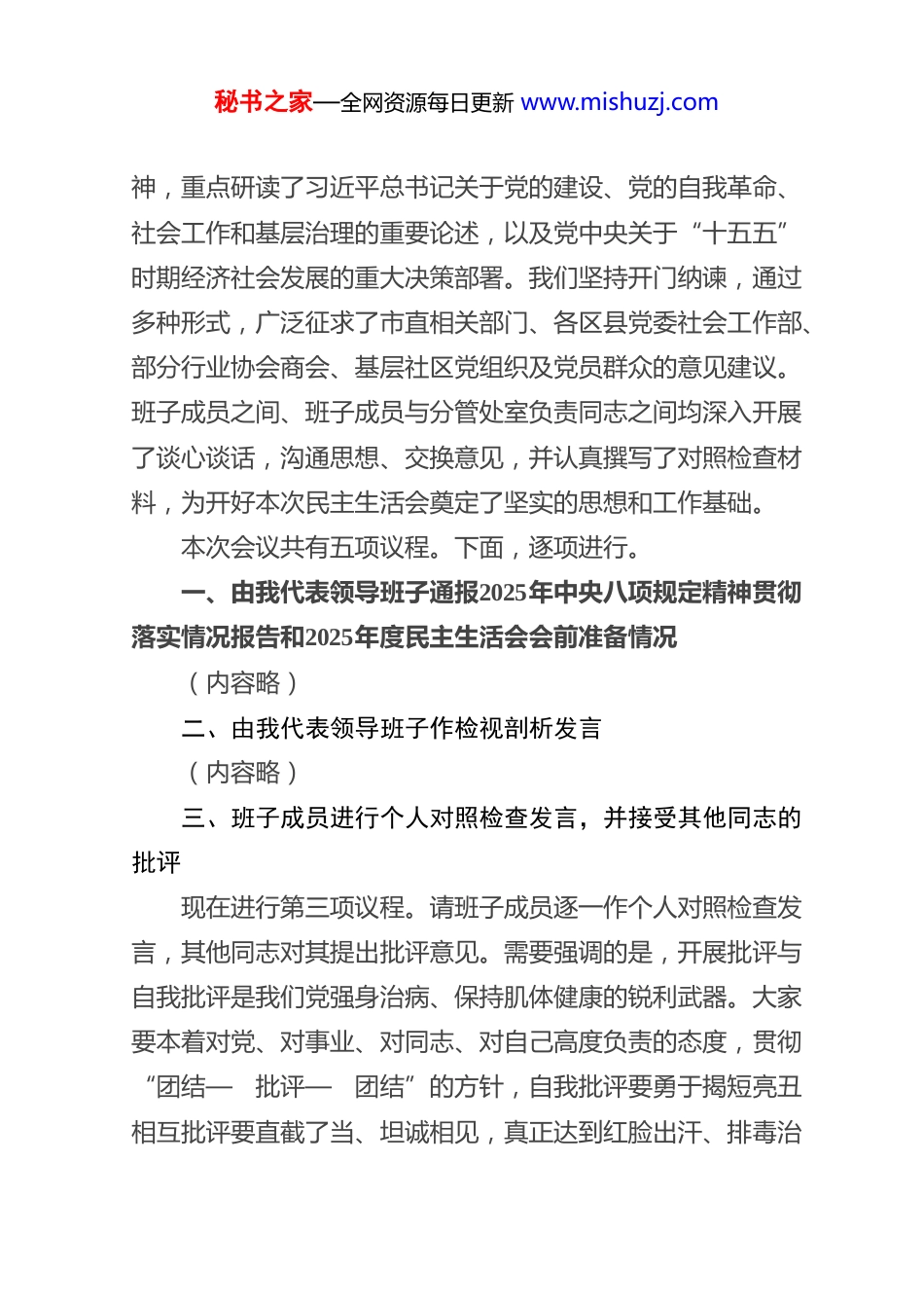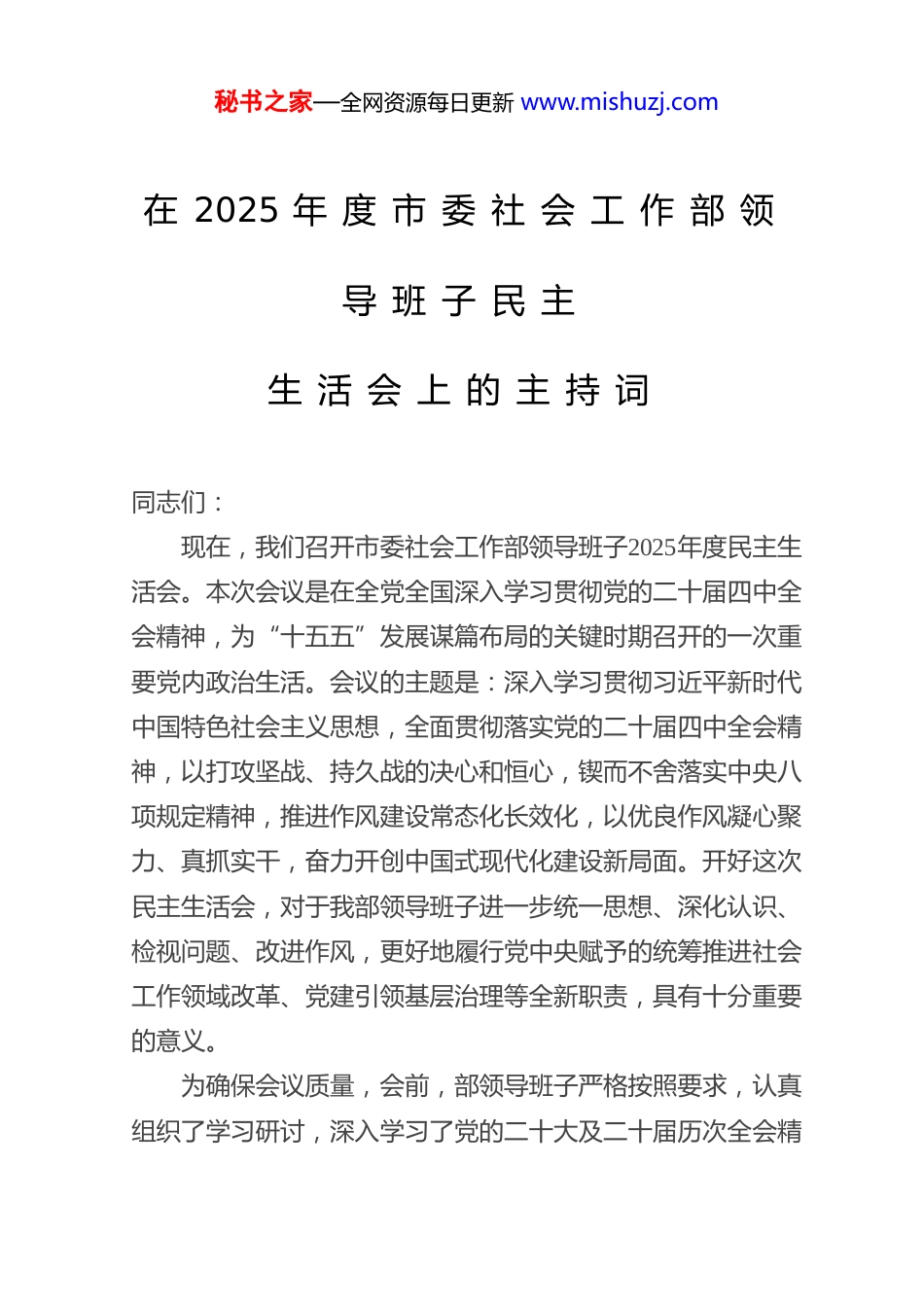 秘书之家—全网资源每日更新 www.mishuzj.com在 2025 年 度 市 委 社 会 工 作 部 领导 班 子 民 主生 活 会 上 的 主 持 词同志们:现在,我们召开市委社会工作部领导班子2025年度民主生活会。本次会议是在全党全国深入学习贯彻党的二十届四中全会精神,为“十五五”发展谋篇布局的关键时期召开的一次重要党内政治生活。会议的主题是:深入学习贯彻习近平新时代中国特色社会主义思想,全面贯彻落实党的二十届四中全会精神,以打攻坚战、持久战的决心和恒心,锲而不舍落实中央八项规定精神,推进作风建设常态化长效化,以优良作风凝心聚力、真抓实干,奋力开创中国式现代化建设新局面。开好这次民主生活会,对于我部领导班子进一步统一思想、深化认识、检视问题、改进作风,更好地履行党中央赋予的统筹推进社会工作领域改革、党建引领基层治理等全新职责,具有十分重要的意义。为确保会议质量,会前,部领导班子严格按照要求,认真组织了学习研讨,深入学习了党的二十大及二十届历次全会精秘书之家—全网资源每日更新 www.mishuzj.com神,重点研读了习近平总书记关于党的建设、党的自我革命、社会工作和基层治理的重要论述,以及党中央关于“十五五”时期经济社会发展的重大决策部署。我们坚持开门纳谏,通过多种形式,广泛征求了市直相关部门、各区县党委社会工作部、部分行业协会商会、基层社区党组织及党员群众的意见建议。班子成员之间、班子成员与分管处室负责同志之间均深入开展了谈心谈话,沟通思想、交换意见,并认真撰写了对照检查材料,为开好本次民主生活会奠定了坚实的思想和工作基础。本次会议共有五项议程。下面,逐项进行。一、由我代表领导班子通报2025年中央八项规定精神贯彻落实情况报告和2025年度民主生活会会前准备情况(内容略)二、由我代表领导班子作检视剖析发言(内容略)三、班子成员进行个人对照检查发言,并接受其他同志的批评现在进行第三项议程。请班子成员逐一作个人对照检查发言,其他同志对其提出批评意见。需要强调的是,开展批评与自我批评是我们党强身治病、保持肌体健康的锐利武器。大家要本着对党、对事业、对同志、对自己高度负责的态度,贯彻“团结—批评—团结”的方针,自我批评要勇于揭短亮丑相互批评要直截了当、坦诚相见,真正达到红脸出汗、排毒治秘书之家—全网资源每日更新 www.mishuzj.com病、增进团结、共同提高的目的。首先,由我开始作个人对照检查发言,请大家批评。(班子成员依次进行,内容略)四、请**同志(督导组组长)进行点评讲话刚才,领导班子和各位成员分别作了对照检查,并开展了严肃认真的相互批评。下面,让我们以热烈的掌声,欢迎市委督导组组长**同志作点评讲话,给予指导。(督导组组长点评,内容略)感谢**组长客观中肯、精准深刻的点评,既充分肯定了我们此次民主生活会的成效,也明确指出了存在的问题和不足,并对下一步整改落实工作提出了具体要求和殷切期望。督导组的指导意见具有很强的针对性、指导性,我们完全赞同、诚恳接受,并将不折不扣地落实到后续整改和各项工作中去。下面,我代表部领导班子,就抓好整改落实、巩固会议成果,作如下表态:(一)铸牢政治忠诚,在深化理论武装上持续用力、作表率。我们将坚持把党的政治建设摆在首位,持续深入学习党的创新理论,特别是习近平总书记关于社会工作、基层治理和党的自我革命的重要思想,深刻领悟“坚持和加强党的全面领导是推进中国式现代化的根本保证”这一核心要义。紧密围绕党的二十届四中全会对“十五五”时期经济社会发展作出的战略部署,不断提高政治判断力、政治领悟力、政治执行力。我们秘书之家—全网资源每日更新 www.mishuzj.com将自觉将社会工作置于全市乃至全国发展大局中谋划推进,确保党中央关于信访工作法治化、党建引领基层治理、行业协会商会改革发展等各项决策部署在社工领域落地生根。班子成员将带头深刻领悟“两个确立”的决定性意义,坚决做到“两个维护”,以理论上的清醒确保政治上的坚定,锻造绝对忠诚的政治品格。(二)扛牢主体责任,在推进自我革命上动真碰硬、求实效。作风建设永远...
