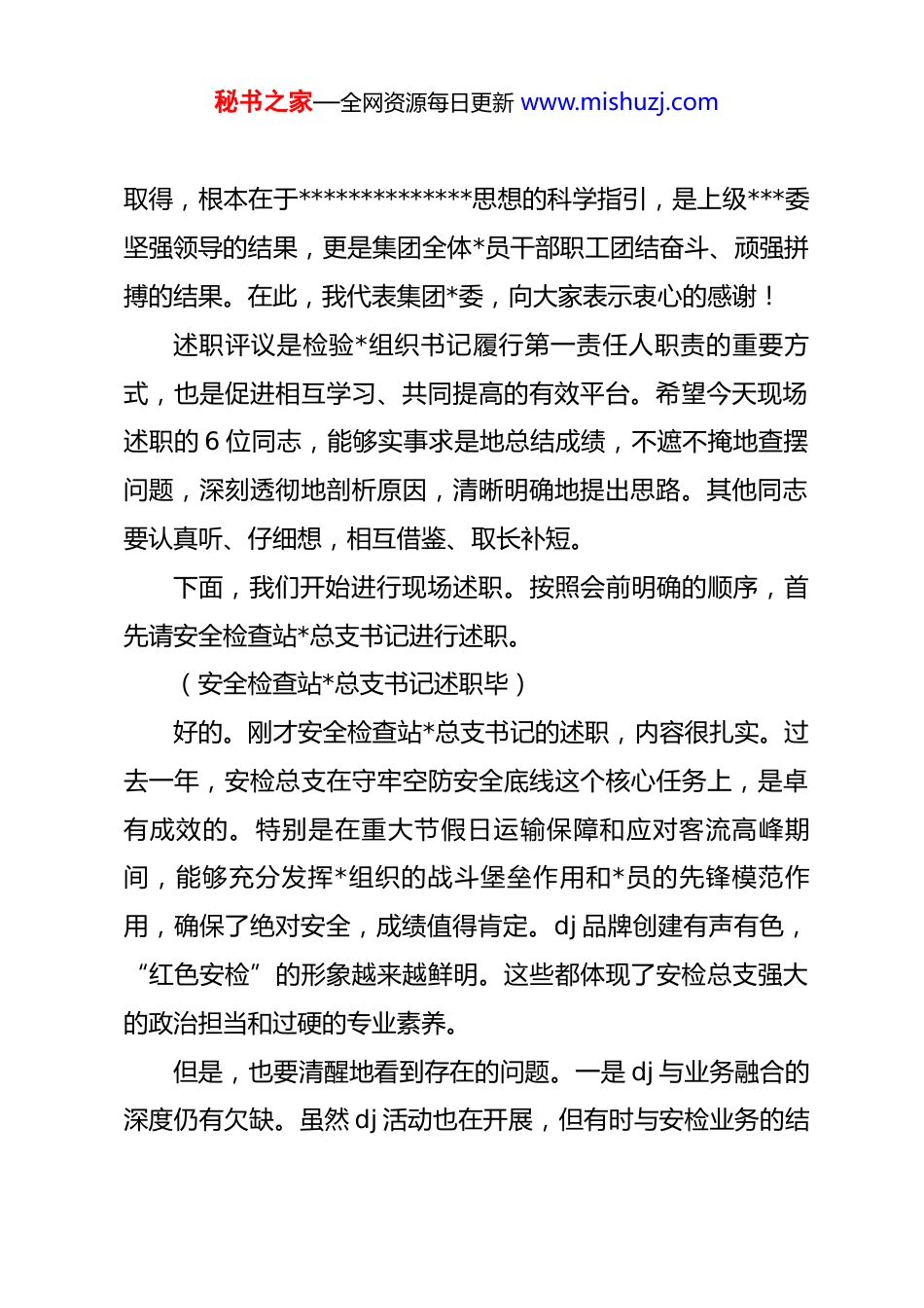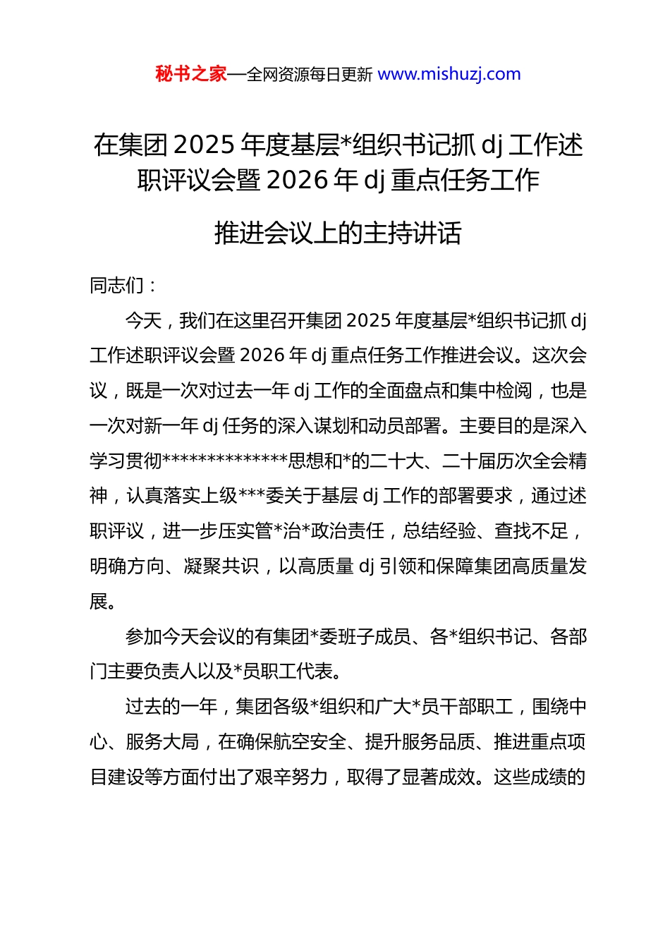 秘书之家—全网资源每日更新 www.mishuzj.com在集团 2025 年度基层*组织书记抓 dj 工作述职评议会暨 2026 年 dj 重点任务工作推进会议上的主持讲话同志们:今天,我们在这里召开集团 2025 年度基层*组织书记抓 dj工作述职评议会暨 2026 年 dj 重点任务工作推进会议。这次会议,既是一次对过去一年 dj 工作的全面盘点和集中检阅,也是一次对新一年 dj 任务的深入谋划和动员部署。主要目的是深入学习贯彻**************思想和*的二十大、二十届历次全会精神,认真落实上级***委关于基层 dj 工作的部署要求,通过述职评议,进一步压实管*治*政治责任,总结经验、查找不足,明确方向、凝聚共识,以高质量 dj 引领和保障集团高质量发展。参加今天会议的有集团*委班子成员、各*组织书记、各部门主要负责人以及*员职工代表。过去的一年,集团各级*组织和广大*员干部职工,围绕中心、服务大局,在确保航空安全、提升服务品质、推进重点项目建设等方面付出了艰辛努力,取得了显著成效。这些成绩的秘书之家—全网资源每日更新 www.mishuzj.com取得,根本在于**************思想的科学指引,是上级***委坚强领导的结果,更是集团全体*员干部职工团结奋斗、顽强拼搏的结果。在此,我代表集团*委,向大家表示衷心的感谢!述职评议是检验*组织书记履行第一责任人职责的重要方式,也是促进相互学习、共同提高的有效平台。希望今天现场述职的 6 位同志,能够实事求是地总结成绩,不遮不掩地查摆问题,深刻透彻地剖析原因,清晰明确地提出思路。其他同志要认真听、仔细想,相互借鉴、取长补短。下面,我们开始进行现场述职。按照会前明确的顺序,首先请安全检查站*总支书记进行述职。(安全检查站*总支书记述职毕)好的。刚才安全检查站*总支书记的述职,内容很扎实。过去一年,安检总支在守牢空防安全底线这个核心任务上,是卓有成效的。特别是在重大节假日运输保障和应对客流高峰期间,能够充分发挥*组织的战斗堡垒作用和*员的先锋模范作用,确保了绝对安全,成绩值得肯定。dj 品牌创建有声有色,“红色安检”的形象越来越鲜明。这些都体现了安检总支强大的政治担当和过硬的专业素养。但是,也要清醒地看到存在的问题。一是 dj 与业务融合的深度仍有欠缺。虽然 dj 活动也在开展,但有时与安检业务的结秘书之家—全网资源每日更新 www.mishuzj.com合点找得不够准,存在“就 dj 抓 dj”的现象,如何将政治理论学习的成果,转化为识别风险隐患的敏锐性和处置特殊情况的果断性,转化的路径还不够清晰。二是*员教育管理的精细化程度有待提升。安检队伍年轻员工多,思想活跃,但针对性的思想政治工作做得还不够深入,教育方式有时略显单一,对青年*员的思想动态、工作压力、成长诉求的掌握和引导还需加强。对此,我提三点意见。第一,深化“dj+安全”模式的内涵。要将政治理论学习与民航安全规章、典型不安全事件案例分析紧密结合起来,组织*员骨干开展“政治理论如何指导安全实践”的专题研讨,让*员真正理解“安全工作是最大的政治”。第二,创新*员教育管理方式。针对年轻*员特点,多采用情景模拟、案例复盘、技能比武等实践性强的教育形式,将*性锻炼融入日常业务训练。同时,要建立健全谈心谈话长效机制,动态掌握思想状况,帮助解决实际困难,增强队伍的凝聚力和向心力。第三,擦亮 dj 品牌。要持续丰富“红色安检”的内涵,不仅要在急难险重任务中体现,更要在一丝不苟的日常检查、热情周到的旅客服务中彰显,让每一名*员都成为安全链条上最可靠的一环。下面,请地面服务部*总支书记述职。(地面服务部*总支书记述职毕)秘书之家—全网资源每日更新 www.mishuzj.com地面服务部是*服务的“第一窗口”,代表着集团的形象。从刚才的述职中可以看出,2025 年,地服总支在提升服务品质、优化旅客体验方面下了很大功夫,也取得了很好的效果。旅客满意度稳步提升,多项服务指标位居区域前列,特别是在“*员先锋岗”的带动下,涌现出了一批服务标兵和先进典型,有效展示了地服队伍的良好风貌。将 dj 工作融入服务流程再造,思路清晰,措施具体,值得表扬。同时...