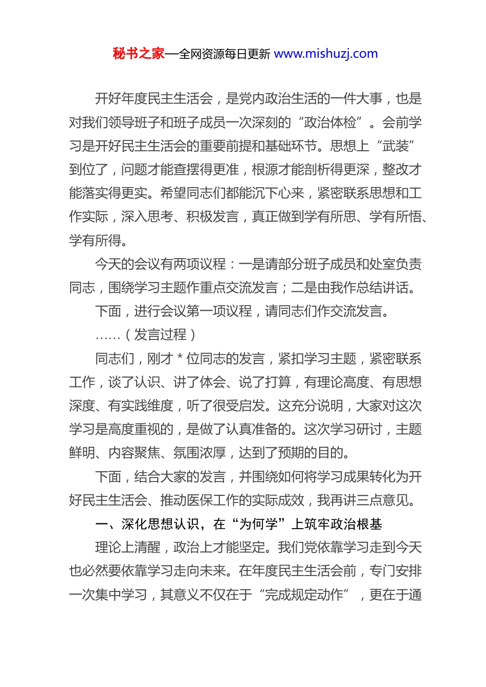 秘书之家—全网资源每日更新 www.mishuzj.com在 局 党 组 理 论 学 习 中 心 组 集 体学 习 暨 2025 年 度 民 主 生 活 会 会前 学 习 研 讨 会 上 的 主 持 词 及 总结 讲 话同志们:现在开会。根据年度工作安排和市委有关要求,今天我们召开局党组理论学习中心组2026年第一次集体学习(扩大)会议,同时,这也是我们为高质量开好2025年度民主生活会,专门组织的一次会前集中学习研讨。主要任务是,坚持不懈用习近平新时代中国特色社会主义思想凝心铸魂,深入学习领会党的二十大和二十届历次全会精神,聚焦党中央关于医疗保障工作的重大决策部署,通过深入学习研讨,进一步统一思想、深化认识、凝聚共识,为开好一次高标准、高质量的民主生活会打下坚实的思想基础。参加今天会议的有局党组班子全体成员、各处室主要负责同志。秘书之家—全网资源每日更新 www.mishuzj.com开好年度民主生活会,是党内政治生活的一件大事,也是对我们领导班子和班子成员一次深刻的“政治体检”。会前学习是开好民主生活会的重要前提和基础环节。思想上“武装”到位了,问题才能查摆得更准,根源才能剖析得更深,整改才能落实得更实。希望同志们都能沉下心来,紧密联系思想和工作实际,深入思考、积极发言,真正做到学有所思、学有所悟、学有所得。今天的会议有两项议程:一是请部分班子成员和处室负责同志,围绕学习主题作重点交流发言;二是由我作总结讲话。下面,进行会议第一项议程,请同志们作交流发言。……(发言过程)同志们,刚才*位同志的发言,紧扣学习主题,紧密联系工作,谈了认识、讲了体会、说了打算,有理论高度、有思想深度、有实践维度,听了很受启发。这充分说明,大家对这次学习是高度重视的,是做了认真准备的。这次学习研讨,主题鲜明、内容聚焦、氛围浓厚,达到了预期的目的。下面,结合大家的发言,并围绕如何将学习成果转化为开好民主生活会、推动医保工作的实际成效,我再讲三点意见。一、深化思想认识,在“为何学”上筑牢政治根基理论上清醒,政治上才能坚定。我们党依靠学习走到今天也必然要依靠学习走向未来。在年度民主生活会前,专门安排一次集中学习,其意义不仅在于“完成规定动作”,更在于通秘书之家—全网资源每日更新 www.mishuzj.com过理论大学习、思想大武装,实现一次精神上的“集中补钙”和政治上的“精准对表”。(一)这是旗帜鲜明讲政治的“必修课”。医疗保障工作是政治性极强的业务工作,业务性极强的政治工作。我们管理的是人民群众的“看病钱”“救命钱”,我们执行的每一项政策,都直接关系到群众的切身利益,关系到党和政府的形象。因此,我们必须时常叩问自己:是否深刻领悟“两个确立”的决定性意义?是否在医保工作的具体实践中做到了“两个维护”?通过学习,就是要不断提高我们的政治判断力、政治领悟力、政治执行力,确保医保事业发展的正确政治方向,确保党中央的各项决策部署在医保领域不折不扣落到实处。(二)这是践行人民至上理念的“加油站”。习近平总书记强调,“人民对美好生活的向往,就是我们的奋斗目标。”医疗保障作为减轻群众就医负担、增进民生福祉、维护社会和谐稳定的重大制度安排,本身就是一项民心工程。群众的期盼就是我们工作的出发点和落脚点。通过学习,就是要让我们重温初心使命,始终把自己摆在人民公仆的位置上,思考我们的工作距离群众的期待还有多大差距?药品集采的降价红利是否真正惠及了患者?异地就医结算的流程是否还能再便捷一些?只有思想上离人民更近,行动上才能服务得更实。(三)这是开好民主生活会的“思想阀”。民主生活会的质量,很大程度上取决于会前的思想准备。如果思想认识不到秘书之家—全网资源每日更新 www.mishuzj.com位,学习领会不深刻,那么查摆问题就可能“隔靴搔痒”,批评和自我批评就可能“蜻蜓点水”,整改落实就可能“流于形式”。这次学习,就是要把思想的“阀门”拧紧,把认识的“螺丝”上紧,引导大家自觉把问题摆进去、把职责摆进去、把工作摆进去,为后续精准“画像”、深刻“体检”扫清思想障碍。二、聚焦核心要义,在“学什...
