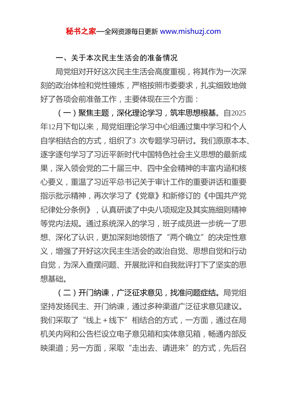 秘书之家—全网资源每日更新 www.mishuzj.com在 市 局 2025 年 度 民 主 生 活 会 上的 主 持 词同志们:根据市委的统一部署和要求,今天,我们召开市审计局党组2025年度民主生活会。这次民主生活会,是在全党全国深入学习贯彻党的二十届三中、四中全会精神,奋力开启“十五五”规划新征程的关键节点上,召开的一次十分重要的会议。会议的主要任务是,紧紧围绕会议主题,结合审计工作实际和班子成员思想状况,深入进行党性分析,严肃认真开展批评和自我批评,明确整改方向和措施,进一步增强党组班子的凝聚力、战斗力和向心力,为推动新时代**审计事业高质量发展提供坚强的政治保证和组织保证。市委对这次民主生活会高度重视,市委第五督导组的同志亲临会场进行指导。在此,我代表市审计局党组,对督导组各位同志的到来表示热烈的欢迎和衷心的感谢!下面,我首先代表局党组,将本次民主生活会的准备情况和征求意见情况向大家作一通报。秘书之家—全网资源每日更新 www.mishuzj.com一、关于本次民主生活会的准备情况局党组对开好这次民主生活会高度重视,将其作为一次深刻的政治体检和党性锤炼,严格按照市委要求,扎实细致地做好了各项会前准备工作,主要体现在三个方面:(一)聚焦主题,深化理论学习,筑牢思想根基。自2025年12月下旬以来,局党组理论学习中心组通过集中学习和个人自学相结合的方式,组织了3 次专题学习研讨。我们原原本本、逐字逐句学习了习近平新时代中国特色社会主义思想的最新成果,深入领会党的二十届三中、四中全会精神的丰富内涵和核心要义,重温了习近平总书记关于审计工作的重要讲话和重要指示批示精神,再次学习了《党章》和新修订的《中国共产党纪律处分条例》,认真研读了中央八项规定及其实施细则精神等党内法规。通过系统深入的学习,班子成员进一步统一了思想、深化了认识,更加深刻地领悟了“两个确立”的决定性意义,增强了开好这次民主生活会的政治自觉、思想自觉和行动自觉,为深入查摆问题、开展批评和自我批评打下了坚实的思想基础。(二)开门纳谏,广泛征求意见,找准问题症结。局党组坚持发扬民主、开门纳谏,通过多种渠道广泛征求意见建议。我们采取了“线上+线下”相结合的方式,一方面,通过在局机关内网和公告栏设立电子意见箱和实体意见箱,畅通内部反映渠道;另一方面,采取“走出去、请进来”的方式,先后召秘书之家—全网资源每日更新 www.mishuzj.com开了科室负责人、青年干部、退休老同志等多个层面的座谈会,并向30余家被审计单位和相关协作部门发函征求意见。班子成员也结合分管工作,深入基层一线和项目现场,与干部群众面对面交流,听取最真实的声音。此次征求意见活动,共收到各类原汁原味的意见建议116 条。经过认真梳理归纳,我们将其合并为5 大类38条具体意见。这些意见建议,既有对局党组工作的肯定,更有对我们存在问题的中肯批评和对未来发展的殷切期望,为我们精准画像、深入剖析提供了重要依据。(三)深入交心,开展谈心谈话,凝聚思想共识。按照“四必谈”要求,会前,我与班子每位成员都进行了深入的谈心谈话,班子成员之间也开展了坦诚的相互谈话,班子成员与分管科室的主要负责同志也分别进行了个别交流。在谈心谈话中,大家本着对党、对事业、对同志、对自己高度负责的态度,开诚布公、推心置腹,既交流思想、沟通工作,也主动亮明自身存在的问题,诚恳指出对方的不足,并就一些群众反映强烈的问题交换了意见,提出了改进建议。整个过程氛围坦诚、交流深入,大家把问题谈开、把思想谈通、把意见谈实,消除了隔阂、增进了理解、加强了团结,营造了召开民主生活会的良好氛围,达到了统一思想、形成共识、共同提高的目的。在此基础上,我和班子成员都认真撰写了对照检查材料和发言提纲,为高质量开好本次民主生活会做好了充分准备。秘书之家—全网资源每日更新 www.mishuzj.com总的来看,这次民主生活会的会前准备工作是扎实的、充分的,为会议的顺利召开奠定了良好基础。二、征求意见和建议情况通过广泛征求意见,我们深刻感受到,全局干部职工和相关单位对局党组班子在履职尽责、...