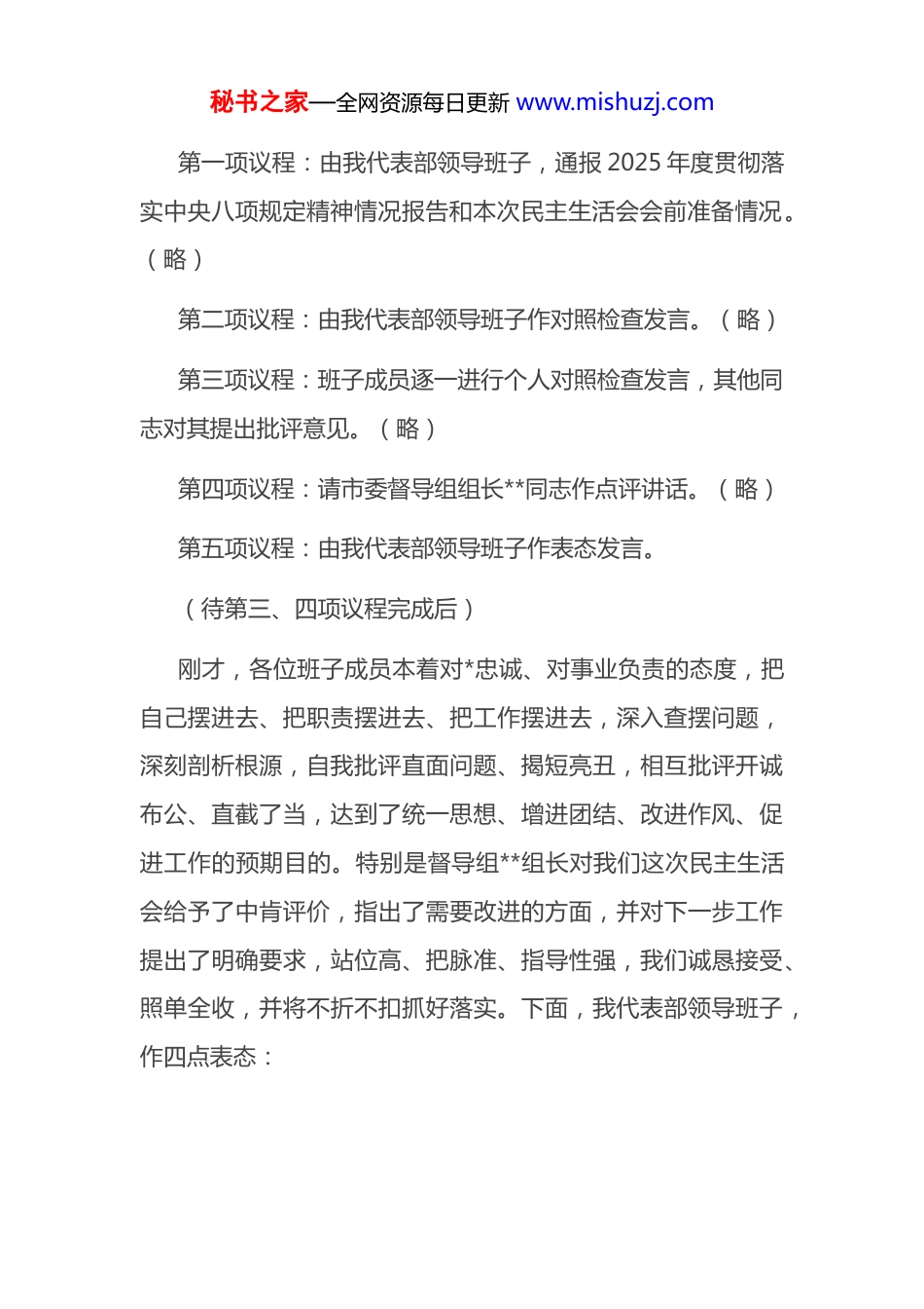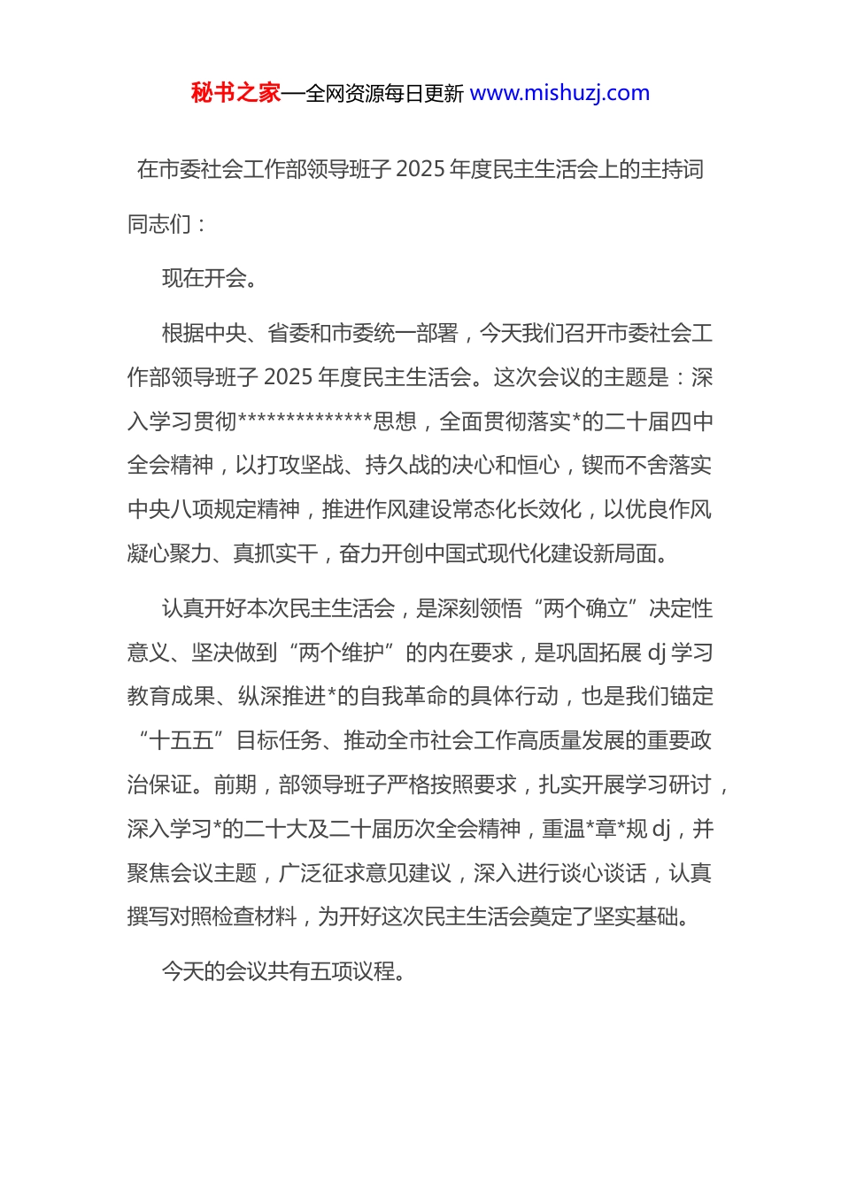 秘书之家—全网资源每日更新 www.mishuzj.com在市委社会工作部领导班子 2025 年度民主生活会上的主持词同志们:现在开会。根据中央、省委和市委统一部署,今天我们召开市委社会工作部领导班子 2025 年度民主生活会。这次会议的主题是:深入学习贯彻**************思想,全面贯彻落实*的二十届四中全会精神,以打攻坚战、持久战的决心和恒心,锲而不舍落实中央八项规定精神,推进作风建设常态化长效化,以优良作风凝心聚力、真抓实干,奋力开创中国式现代化建设新局面。认真开好本次民主生活会,是深刻领悟“两个确立”决定性意义、坚决做到“两个维护”的内在要求,是巩固拓展 dj 学习教育成果、纵深推进*的自我革命的具体行动,也是我们锚定“十五五”目标任务、推动全市社会工作高质量发展的重要政治保证。前期,部领导班子严格按照要求,扎实开展学习研讨,深入学习*的二十大及二十届历次全会精神,重温*章*规 dj,并聚焦会议主题,广泛征求意见建议,深入进行谈心谈话,认真撰写对照检查材料,为开好这次民主生活会奠定了坚实基础。今天的会议共有五项议程。秘书之家—全网资源每日更新 www.mishuzj.com第一项议程:由我代表部领导班子,通报 2025 年度贯彻落实中央八项规定精神情况报告和本次民主生活会会前准备情况。(略)第二项议程:由我代表部领导班子作对照检查发言。(略)第三项议程:班子成员逐一进行个人对照检查发言,其他同志对其提出批评意见。(略)第四项议程:请市委督导组组长**同志作点评讲话。(略)第五项议程:由我代表部领导班子作表态发言。(待第三、四项议程完成后)刚才,各位班子成员本着对*忠诚、对事业负责的态度,把自己摆进去、把职责摆进去、把工作摆进去,深入查摆问题,深刻剖析根源,自我批评直面问题、揭短亮丑,相互批评开诚布公、直截了当,达到了统一思想、增进团结、改进作风、促进工作的预期目的。特别是督导组**组长对我们这次民主生活会给予了中肯评价,指出了需要改进的方面,并对下一步工作提出了明确要求,站位高、把脉准、指导性强,我们诚恳接受、照单全收,并将不折不扣抓好落实。下面,我代表部领导班子,作四点表态:秘书之家—全网资源每日更新 www.mishuzj.com一、聚焦凝心铸魂,在筑牢政治忠诚上对标更高标准。我们将始终坚持把*的政治建设摆在首位,持续巩固拓展学习贯彻**************思想 zt 教育成果,将深入学习*的二十届四中全会精神和******关于*的建设的重要思想、关于社会建设与社会治理的重要论述作为首要政治任务。深刻领悟*中央组建社会工作部的战略考量,准确把握社会工作在推进国家治理体系和治理能力现代化中的职责定位,不断提高政治判断力、政治领悟力、政治执行力。严格落实“第一议题”制度,健全理论学习长效机制,自觉将学习成果转化为坚定理想、锤炼*性和指导实践、推动工作的强大力量,确保全市社会工作始终沿着正确政治方向前进,确保中央、省委和市委各项决策部署在社会工作领域落地生根、开花结果。二、聚焦动真碰硬,在狠抓整改落实上体现更实作风。抓好问题整改是检验民主生活会成效的关键标尺。针对本次民主生活会查摆出的问题、相互批评的意见以及督导组指出的不足,部领导班子将主动担责、带头整改,迅速制定班子和个人整改清单,逐项明确整改目标、责任主体和完成时限,实行台账管理、销号落实。我们将发扬彻底的自我革命精神,坚决杜绝“闯关”“过关”思想,对能够立即解决的,立行立改、抓紧见效;对需要持续攻坚的,明确路径、一抓到底;对深层次体制机制问题,深入研究、系统施策。坚持“当下改”与“长久秘书之家—全网资源每日更新 www.mishuzj.com立”相结合,注重从思想根源和制度机制上剖析反思,举一反三,堵塞漏洞,切实将整改过程转化为深化认识、提升能力、改进作风、推动发展的过程,以解决问题的实际成效取信于民。三、聚焦主责主业,在服务发展大局上展现更大作为。社会工作部肩负着加强*对社会工作全面领导、推动社会治理现代化的重要使命。我们将以此次民主生活会为新的起点,自觉将整改落实与履行职责紧密结合起来,锚定“走在前、开新局”目标要...
