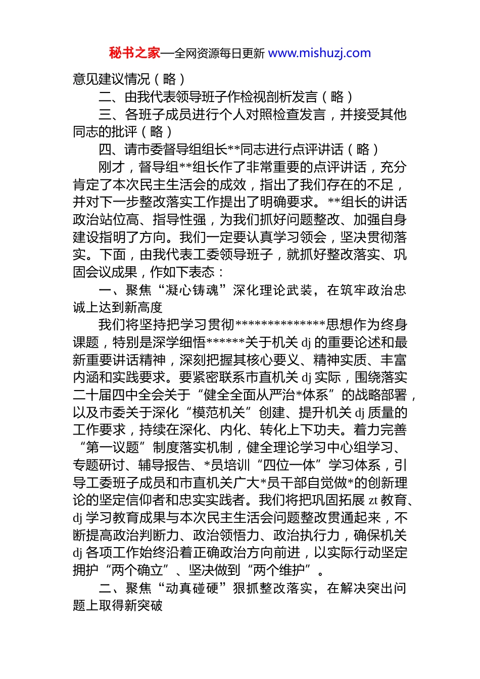 秘书之家—全网资源每日更新 www.mishuzj.com在市委直属机关工委领导班子 2025 年度民主生活会上的主持词(含表态发言)同志们:现在,我们召开市委直属机关工委领导班子 2025 年度民主生活会。本次会议的主题是:深入学习贯彻**************思想,全面贯彻落实*的二十届四中全会精神,以打攻坚战、持久战的决心和恒心,锲而不舍落实中央八项规定精神,推进作风建设常态化长效化,以优良作风凝心聚力、真抓实干,奋力开创中国式现代化建设新局面。认真开好本次民主生活会,是深入学习贯彻*的二十届四中全会精神,学习贯彻******关于深入贯彻中央八项规定精神学习教育的****精神,巩固拓展 dj 学习教育成果,落实推进*的自我革命“五个进一步到位”重要要求,为实现“十五五”良好开局打牢思想基础的关键举措。市委对开好这次民主生活会高度重视,市委督导组**组长一行亲临指导,让我们以热烈掌声表示欢迎和感谢!会前,工委领导班子严格按照中央、省委和市委部署要求,聚焦会议主题,扎实开展学习研讨,深入学习*的创新理论、*章*规 dj 以及******关于*的建设的重要思想、关于机关 dj 的重要讲话和指示精神,为开好民主生活会筑牢思想根基。我们广泛征求市直机关各级*组织、*员干部和基层群众的意见建议,深入进行谈心谈话,认真撰写对照检查材料,为会议召开作了充分准备。本次民主生活会共有五项议程:一、由我代表领导班子通报 2025 年“深入贯彻中央八项规定精神学习教育”问题整改整治情况报告和 2024 年度民主生活会查摆问题整改情况、2025 年度民主生活会征集秘书之家—全网资源每日更新 www.mishuzj.com意见建议情况(略)二、由我代表领导班子作检视剖析发言(略)三、各班子成员进行个人对照检查发言,并接受其他同志的批评(略)四、请市委督导组组长**同志进行点评讲话(略)刚才,督导组**组长作了非常重要的点评讲话,充分肯定了本次民主生活会的成效,指出了我们存在的不足,并对下一步整改落实工作提出了明确要求。**组长的讲话政治站位高、指导性强,为我们抓好问题整改、加强自身建设指明了方向。我们一定要认真学习领会,坚决贯彻落实。下面,由我代表工委领导班子,就抓好整改落实、巩固会议成果,作如下表态:一、聚焦“凝心铸魂”深化理论武装,在筑牢政治忠诚上达到新高度我们将坚持把学习贯彻**************思想作为终身课题,特别是深学细悟******关于机关 dj 的重要论述和最新重要讲话精神,深刻把握其核心要义、精神实质、丰富内涵和实践要求。要紧密联系市直机关 dj 实际,围绕落实二十届四中全会关于“健全全面从严治*体系”的战略部署,以及市委关于深化“模范机关”创建、提升机关 dj 质量的工作要求,持续在深化、内化、转化上下功夫。着力完善“第一议题”制度落实机制,健全理论学习中心组学习、专题研讨、辅导报告、*员培训“四位一体”学习体系,引导工委班子成员和市直机关广大*员干部自觉做*的创新理论的坚定信仰者和忠实实践者。我们将把巩固拓展 zt 教育、dj 学习教育成果与本次民主生活会问题整改贯通起来,不断提高政治判断力、政治领悟力、政治执行力,确保机关dj 各项工作始终沿着正确政治方向前进,以实际行动坚定拥护“两个确立”、坚决做到“两个维护”。二、聚焦“动真碰硬”狠抓整改落实,在解决突出问题上取得新突破秘书之家—全网资源每日更新 www.mishuzj.com问题是时代的声音,整改是进步的阶梯。针对本次民主生活会查摆出的问题、征集到的意见建议以及督导组指出的不足,工委领导班子将主动认领、照单全收。我们将立即着手制定班子整改方案和个人整改清单,明确整改目标、整改措施、整改责任和整改时限。建立“台账管理、动态更新、销号落实”的闭环机制,实行项目化推进、清单式管理。对于能够立即解决的,立行立改、马上就办;对于需要持续攻坚的,明确路线图、时间表,一抓到底、务求实效;对于涉及深层次机制问题的,将深入研究、系统谋划,推动从制度层面加以解决。整改过程要坚持开门纳谏,适时向*员干部群众通报整改情况,主动接受监督。我们要发扬钉钉子精神,以“刀刃向内”的勇气和...