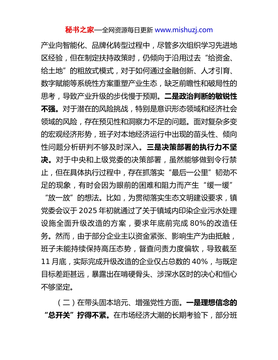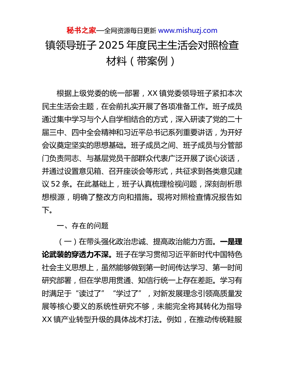 秘书之家—全网资源每日更新 www.mishuzj.com镇领导班子 2025 年度民主生活会对照检查材料(带案例)根据上级党委的统一部署,XX 镇党委领导班子紧扣本次民主生活会主题,在会前扎实开展了各项准备工作。班子成员通过集中学习与个人自学相结合的方式,深入研读了党的二十届三中、四中全会精神和习近平总书记系列重要讲话,为开好会议奠定坚实的思想基础。班子成员之间、班子成员与分管部门负责同志、与基层党员干部群众代表广泛开展了谈心谈话,并通过设置意见箱、召开座谈会等形式,共征求到各类意见建议 52 条。在此基础上,班子认真梳理检视问题,深刻剖析思想根源,明确了整改方向和措施。现将对照检查情况报告如下。一、存在的问题(一)在带头强化政治忠诚、提高政治能力方面。一是理论武装的穿透力不深。班子在学习贯彻习近平新时代中国特色社会主义思想上,虽然能够做到第一时间传达学习、第一时间研究部署,但在学思用贯通、知信行统一上存在差距。学习有时满足于“读过了”“学过了”,对新发展理念引领高质量发展等核心要义的系统性研究不够,未能完全将其转化为指导XX 镇产业转型升级的具体战术打法。例如,在推动传统鞋服秘书之家—全网资源每日更新 www.mishuzj.com产业向智能化、品牌化转型过程中,尽管多次组织学习先进地区经验,但在制定扶持政策时,仍倾向于沿用过去“给资金、给土地”的粗放式模式,对于如何通过金融创新、人才引育、数字赋能等系统性方案重塑产业生态,缺乏前瞻性和破局性的思考,导致产业升级的步伐慢于预期。二是政治判断的敏锐性不强。对于潜在的风险挑战,特别是意识形态领域和经济社会领域的风险,存在预见性和洞察力不足的问题。面对复杂多变的宏观经济形势,班子对本地经济运行中出现的苗头性、倾向性问题分析研判不够及时深入。三是决策部署的执行力不坚决。对于中央和上级党委的决策部署,虽然能够做到令行禁止,但在具体执行过程中,存在抓落实“最后一公里”韧劲不足的现象,有时会因为眼前的困难和阻力而产生“缓一缓”“放一放”的想法。比如,为贯彻落实生态文明建设要求,镇党委会议于 2025 年初就通过了关于镇域内印染企业污水处理设施全面升级改造的方案,要求年底前完成 80%的改造任务。然而,由于部分企业主以资金紧张、影响生产为由抵触,班子未能持续保持高压态势,督查问责力度偏软,导致截至11 月底,实际完成升级改造的企业仅占总数的 40%,与既定目标差距甚远,暴露出在啃硬骨头、涉深水区时的决心和恒心不够坚定。(二)在带头固本培元、增强党性方面。一是理想信念的“总开关”拧得不紧。在市场经济大潮的长期考验下,部分班秘书之家—全网资源每日更新 www.mishuzj.com子成员在思想深处对共产主义远大理想和中国特色社会主义共同理想的认识有所模糊,艰苦奋斗、甘于奉献的革命精神有所消减。日常工作中,谈经济指标、项目建设多,谈党性修养、理想信念少,潜意识中把经济发展作为“硬任务”,把党性锤炼视为“软指标”。在推动 XX 滨海创新产业园建设时,班子成员更多地关注招商引资的数据和固定资产投资的增速,但在如何发挥园区党组织的战斗堡垒作用、如何引导非公企业党员发挥先锋模范作用等党建引领发展方面,思考不深、投入精力不足。二是党内政治生活的“熔炉”烧得不旺。民主生活会、组织生活会等党内政治生活制度虽然得到执行,但质量不高,辣味不足。会上,班子成员之间开展相互批评时,有时碍于情面,习惯于“绕弯子”“兜圈子”,多是点到为止的希望和建议,缺少直截了当、一针见血的批评意见,“红脸出汗”的效果不明显。这种“你好我好大家好”的现象,使得党内政治生活锤炼党性、解决问题、促进团结的功能打了折扣,不利于及时发现和纠正班子内部存在的问题。三是宗旨意识的“根基”扎得不牢。虽然班子始终强调要践行以人民为中心的发展思想,但在实际工作中,有时存在官僚主义倾向,未能真正做到问计于民、问需于民。在落实“四下基层”制度时,有的下基层调研存在“走马观花”“蜻蜓点水”的现象,满足于听取汇报、查看现场,与普通群众的面对面交流不深入。例如,在规划建设 X...