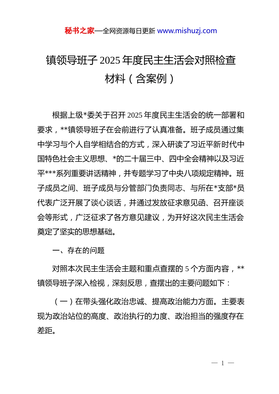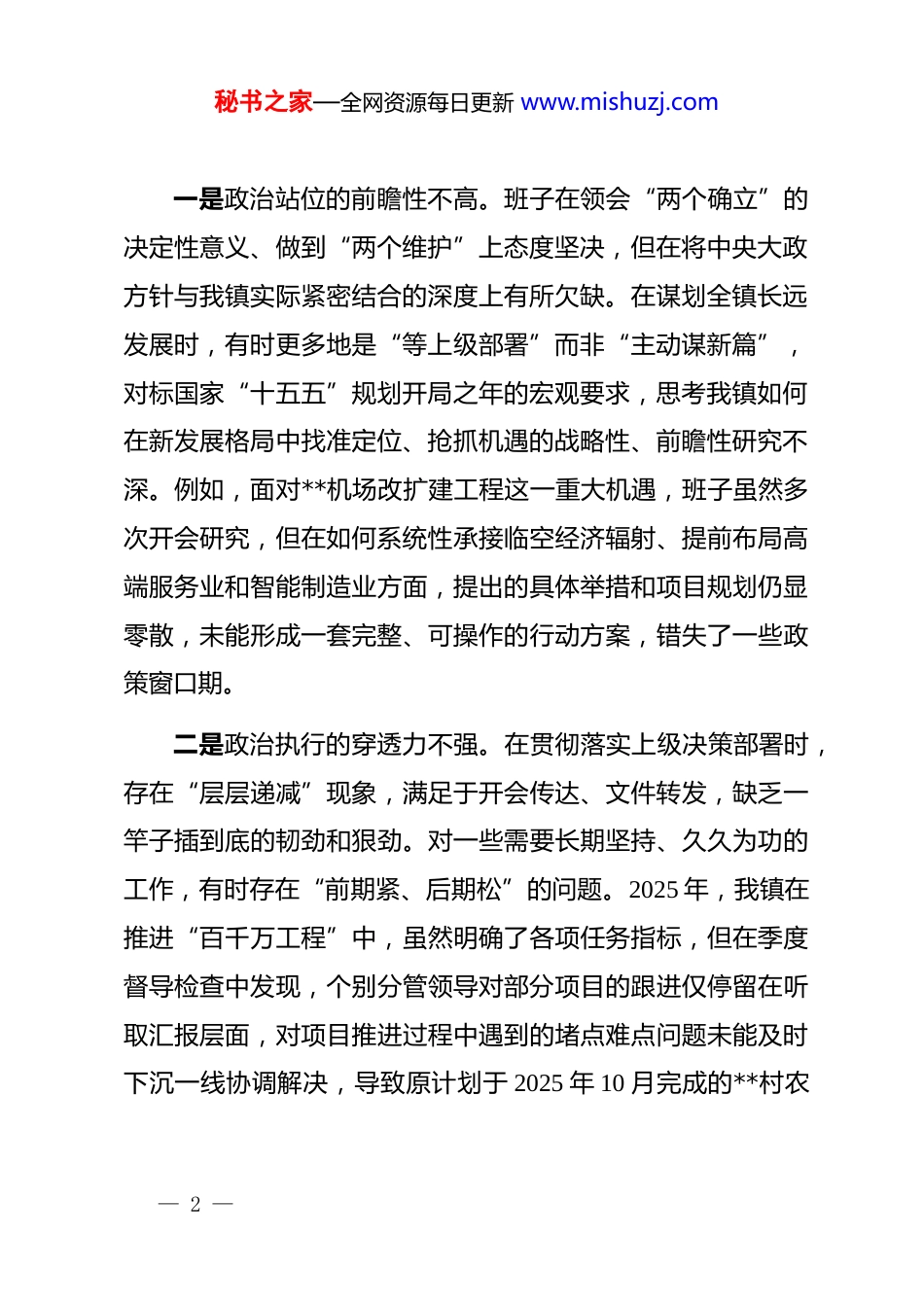 秘书之家—全网资源每日更新 www.mishuzj.com镇领导班子 2025 年度民主生活会对照检查材料(含案例)根据上级*委关于召开 2025 年度民主生活会的统一部署和要求,**镇领导班子在会前进行了认真准备。班子成员通过集中学习与个人自学相结合的方式,深入研读了习近平新时代中国特色社会主义思想、*的二十届三中、四中全会精神以及习近平***系列重要讲话精神,并专题学习了中央八项规定精神。班子成员之间、班子成员与分管部门负责同志、与所在*支部*员代表广泛开展了谈心谈话,并通过发放征求意见函、召开座谈会等形式,广泛征求了各方意见建议,为开好这次民主生活会奠定了坚实的思想基础。一、存在的问题对照本次民主生活会主题和重点查摆的 5 个方面内容,**镇领导班子深入检视,深刻反思,查摆出的主要问题如下:(一)在带头强化政治忠诚、提高政治能力方面。主要表现为政治站位的高度、政治执行的力度、政治担当的强度存在差距。— 1 —秘书之家—全网资源每日更新 www.mishuzj.com一是政治站位的前瞻性不高。班子在领会“两个确立”的决定性意义、做到“两个维护”上态度坚决,但在将中央大政方针与我镇实际紧密结合的深度上有所欠缺。在谋划全镇长远发展时,有时更多地是“等上级部署”而非“主动谋新篇”,对标国家“十五五”规划开局之年的宏观要求,思考我镇如何在新发展格局中找准定位、抢抓机遇的战略性、前瞻性研究不深。例如,面对**机场改扩建工程这一重大机遇,班子虽然多次开会研究,但在如何系统性承接临空经济辐射、提前布局高端服务业和智能制造业方面,提出的具体举措和项目规划仍显零散,未能形成一套完整、可操作的行动方案,错失了一些政策窗口期。二是政治执行的穿透力不强。在贯彻落实上级决策部署时,存在“层层递减”现象,满足于开会传达、文件转发,缺乏一竿子插到底的韧劲和狠劲。对一些需要长期坚持、久久为功的工作,有时存在“前期紧、后期松”的问题。2025 年,我镇在推进“百千万工程”中,虽然明确了各项任务指标,但在季度督导检查中发现,个别分管领导对部分项目的跟进仅停留在听取汇报层面,对项目推进过程中遇到的堵点难点问题未能及时下沉一线协调解决,导致原计划于 2025 年 10 月完成的**村农— 2 —秘书之家—全网资源每日更新 www.mishuzj.com文旅融合示范点建设进度滞后了近两个月。三是政治担当的坚定性不足。在面对一些历史遗留的矛盾和发展中的硬骨头时,敢于斗争、善于斗争的精神有所弱化,存在求稳怕乱、畏难退缩的思想。对于一些涉及多部门协调、群众意见不一的复杂问题,有时习惯于向上级请示汇报,主动“揽责”破解难题的魄力不够。例如,在处理**片区违章建筑拆除工作中,由于涉及户数多、历史成因复杂,班子在决策时反复权衡,耗时较长,担心引发不稳定因素,未能果断采取有效措施,致使问题一再拖延,影响了全镇的整体规划和发展形象。(二)在带头固本培元、增强*性方面。主要表现为理论武装的深度、*性锤炼的硬度、价值追求的纯度存在差距。一是理论武装系统性不深。班子成员能够坚持学习习近平新时代中国特色社会主义思想,但学习的系统性、连贯性、深入性不够。多是满足于完成“规定动作”,学习内容碎片化,读原著、学原文、悟原理的功夫下得不实。在运用*的创新理论指导实践、推动工作方面,存在学用脱节现象。2025 年,镇*委理论学习中心组虽然组织了 12 次集体学习,但研讨交流环节,部分成员的发言还是停留在谈认识、谈体会的表层,未能紧密— 3 —秘书之家—全网资源每日更新 www.mishuzj.com联系分管领域工作,深刻剖析问题,提出创新性思路和举措。二是*性锤炼经常性不实。在严格执行*内政治生活制度方面,存在标准不高、要求不严的问题。开展批评和自我批评时,有时还存在“好人主义”思想,担心批评过重会影响班子团结,辣味不足,没有真正达到“红脸出汗、排毒治病”的效果。在以普通*员身份参加支部组织生活时,投入的时间和精力不够,示范带头作用发挥不充分。个别班子成员 2025 年度参加所在支部的“三会一课”次数不足,且在支部活动中多是作为领导听取汇报,未能真正沉下...