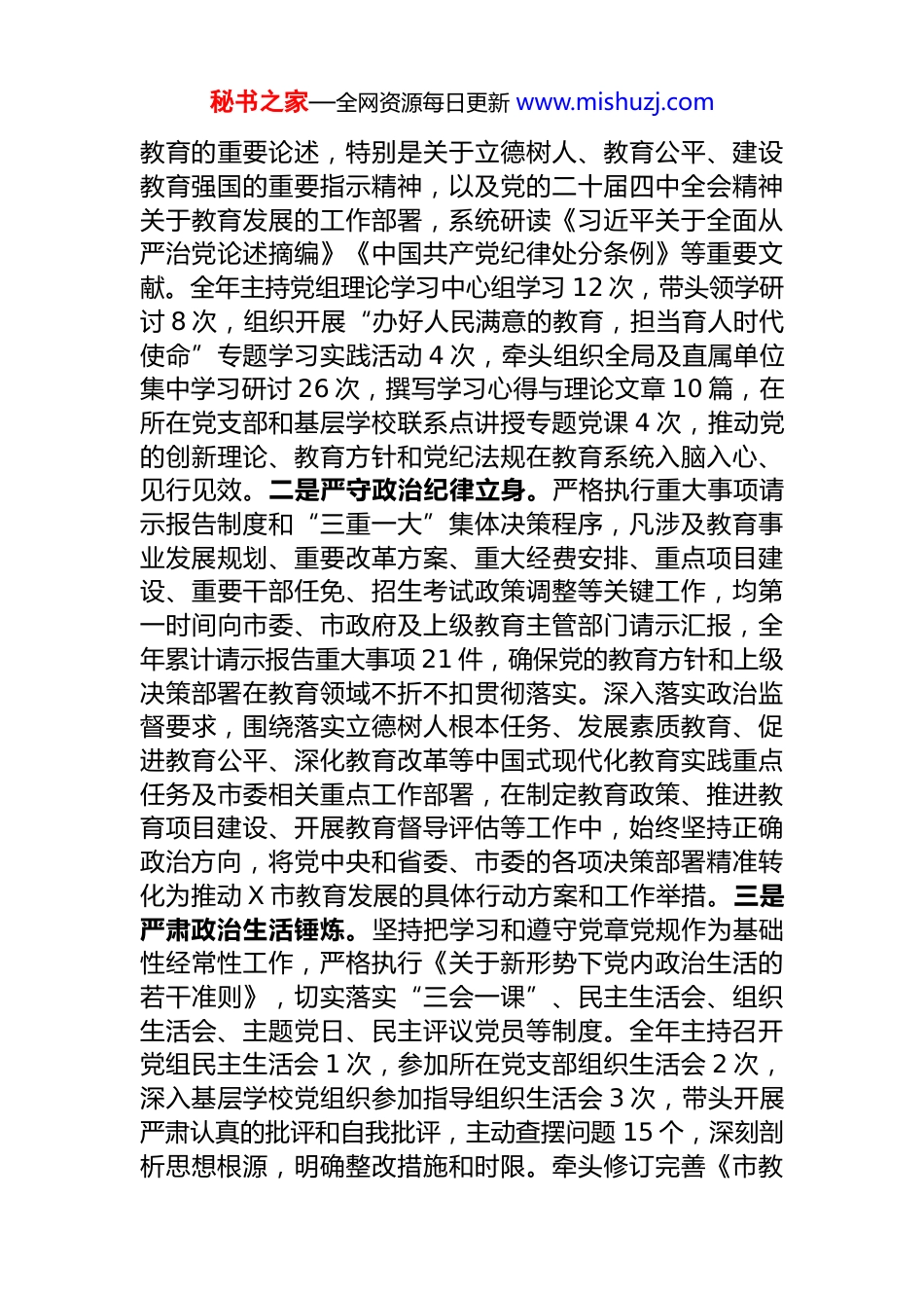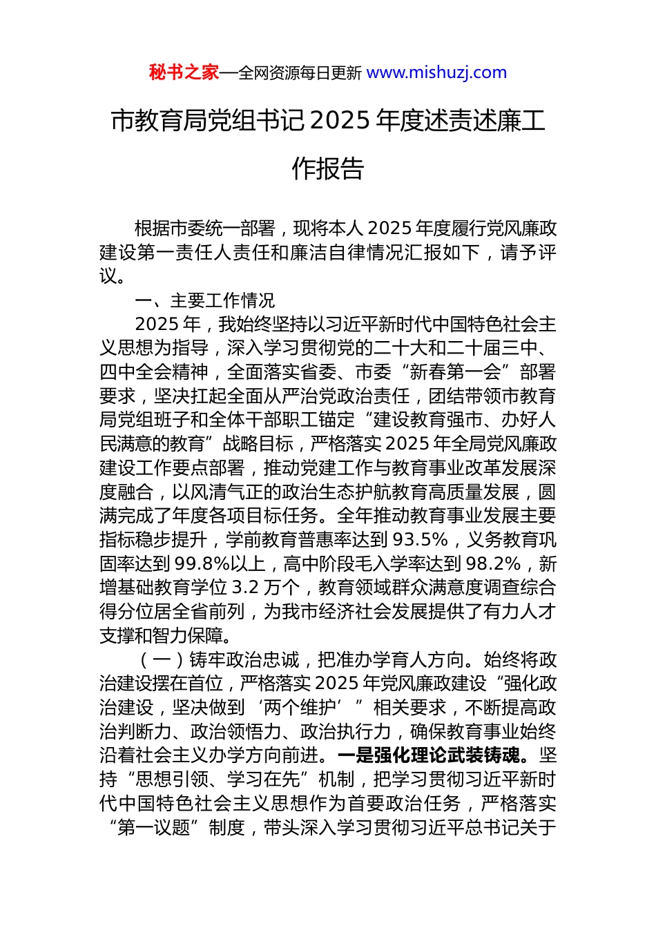 秘书之家—全网资源每日更新 www.mishuzj.com市教育局党组书记 2025 年度述责述廉工作报告根据市委统一部署,现将本人 2025 年度履行党风廉政建设第一责任人责任和廉洁自律情况汇报如下,请予评议。一、主要工作情况2025 年,我始终坚持以习近平新时代中国特色社会主义思想为指导,深入学习贯彻党的二十大和二十届三中、四中全会精神,全面落实省委、市委“新春第一会”部署要求,坚决扛起全面从严治党政治责任,团结带领市教育局党组班子和全体干部职工锚定“建设教育强市、办好人民满意的教育”战略目标,严格落实 2025 年全局党风廉政建设工作要点部署,推动党建工作与教育事业改革发展深度融合,以风清气正的政治生态护航教育高质量发展,圆满完成了年度各项目标任务。全年推动教育事业发展主要指标稳步提升,学前教育普惠率达到 93.5%,义务教育巩固率达到 99.8%以上,高中阶段毛入学率达到 98.2%,新增基础教育学位 3.2 万个,教育领域群众满意度调查综合得分位居全省前列,为我市经济社会发展提供了有力人才支撑和智力保障。(一)铸牢政治忠诚,把准办学育人方向。始终将政治建设摆在首位,严格落实 2025 年党风廉政建设“强化政治建设,坚决做到‘两个维护’”相关要求,不断提高政治判断力、政治领悟力、政治执行力,确保教育事业始终沿着社会主义办学方向前进。一是强化理论武装铸魂。坚持“思想引领、学习在先”机制,把学习贯彻习近平新时代中国特色社会主义思想作为首要政治任务,严格落实“第一议题”制度,带头深入学习贯彻习近平总书记关于秘书之家—全网资源每日更新 www.mishuzj.com教育的重要论述,特别是关于立德树人、教育公平、建设教育强国的重要指示精神,以及党的二十届四中全会精神关于教育发展的工作部署,系统研读《习近平关于全面从严治党论述摘编》《中国共产党纪律处分条例》等重要文献。全年主持党组理论学习中心组学习 12 次,带头领学研讨 8 次,组织开展“办好人民满意的教育,担当育人时代使命”专题学习实践活动 4 次,牵头组织全局及直属单位集中学习研讨 26 次,撰写学习心得与理论文章 10 篇,在所在党支部和基层学校联系点讲授专题党课 4 次,推动党的创新理论、教育方针和党纪法规在教育系统入脑入心、见行见效。二是严守政治纪律立身。严格执行重大事项请示报告制度和“三重一大”集体决策程序,凡涉及教育事业发展规划、重要改革方案、重大经费安排、重点项目建设、重要干部任免、招生考试政策调整等关键工作,均第一时间向市委、市政府及上级教育主管部门请示汇报,全年累计请示报告重大事项 21 件,确保党的教育方针和上级决策部署在教育领域不折不扣贯彻落实。深入落实政治监督要求,围绕落实立德树人根本任务、发展素质教育、促进教育公平、深化教育改革等中国式现代化教育实践重点任务及市委相关重点工作部署,在制定教育政策、推进教育项目建设、开展教育督导评估等工作中,始终坚持正确政治方向,将党中央和省委、市委的各项决策部署精准转化为推动 X 市教育发展的具体行动方案和工作举措。三是严肃政治生活锤炼。坚持把学习和遵守党章党规作为基础性经常性工作,严格执行《关于新形势下党内政治生活的若干准则》,切实落实“三会一课”、民主生活会、组织生活会、主题党日、民主评议党员等制度。全年主持召开党组民主生活会 1 次,参加所在党支部组织生活会 2 次,深入基层学校党组织参加指导组织生活会 3 次,带头开展严肃认真的批评和自我批评,主动查摆问题 15 个,深刻剖析思想根源,明确整改措施和时限。牵头修订完善《市教秘书之家—全网资源每日更新 www.mishuzj.com育局党组 2025 年度组织生活计划》,创新开展“党建+立德树人”“党建+教学提质”等主题党日活动 8 次,加强对全市教育系统各级党组织党内政治生活状况的指导和监督检查,着力增强党内政治生活的政治性、时代性、原则性、战斗性,营造了风清气正、潜心育人的良好政治生态。(二)扛牢政治责任,深化教育系统全面从严治党。始终坚持把抓好党建作为最大政绩,严格落实 2025 年党风廉政建设“压实主体责...
