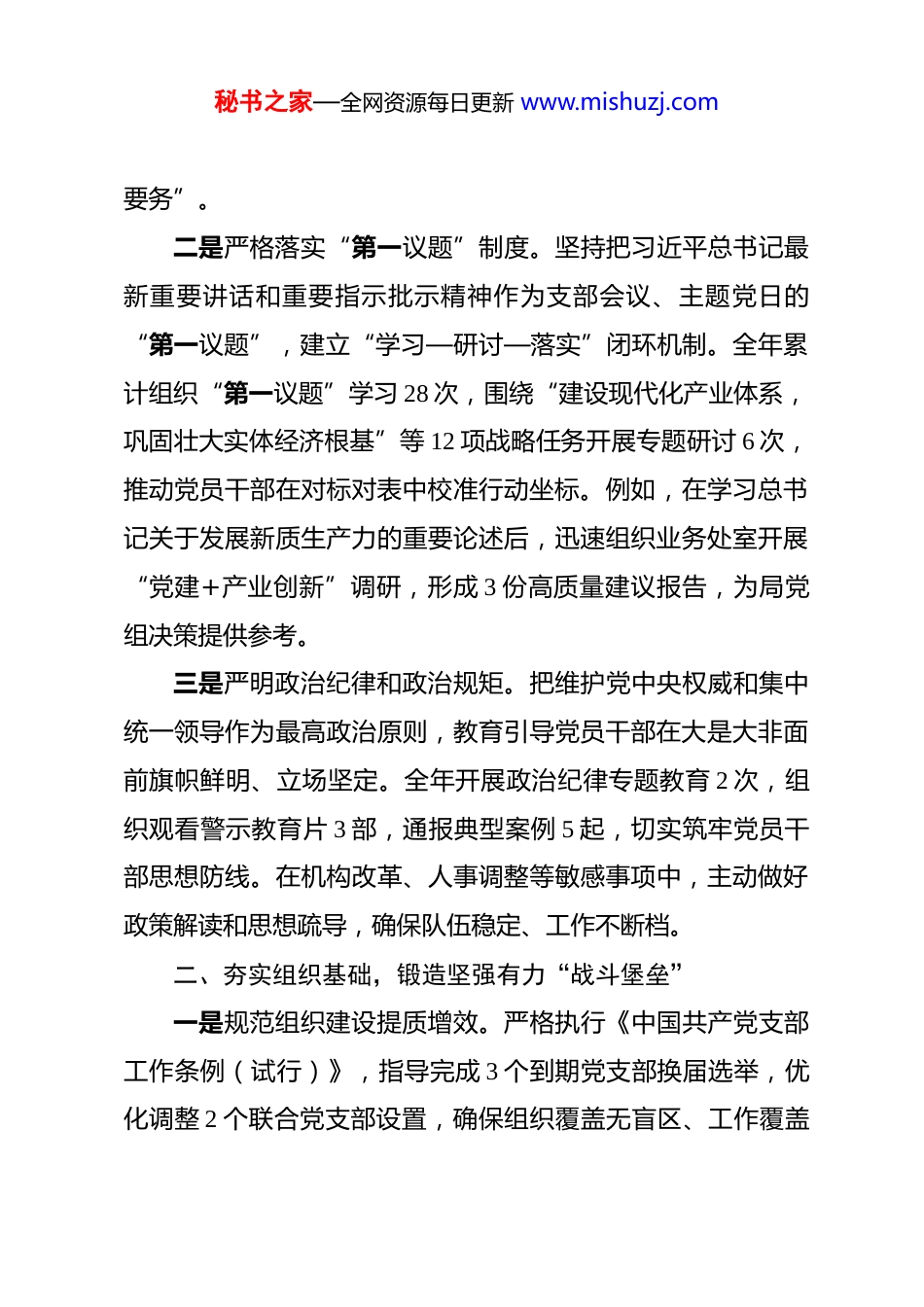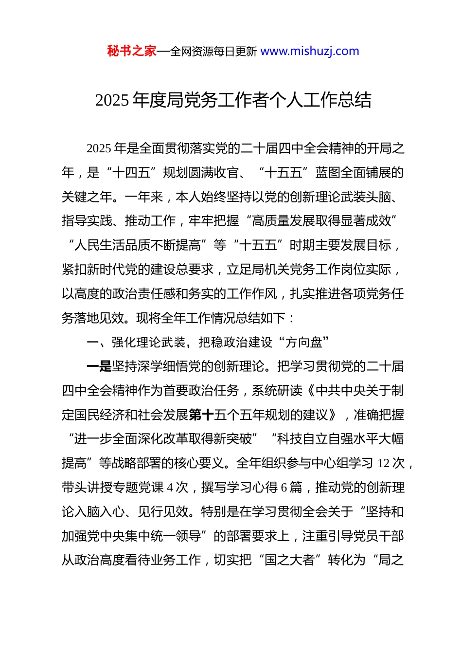 秘书之家—全网资源每日更新 www.mishuzj.com2025 年度局党务工作者个人工作总结 2025 年是全面贯彻落实党的二十届四中全会精神的开局之年,是“十四五”规划圆满收官、“十五五”蓝图全面铺展的关键之年。一年来,本人始终坚持以党的创新理论武装头脑、指导实践、推动工作,牢牢把握“高质量发展取得显著成效”“人民生活品质不断提高”等“十五五”时期主要发展目标,紧扣新时代党的建设总要求,立足局机关党务工作岗位实际,以高度的政治责任感和务实的工作作风,扎实推进各项党务任务落地见效。现将全年工作情况总结如下:一、强化理论武装,把稳政治建设“方向盘”一是坚持深学细悟党的创新理论。把学习贯彻党的二十届四中全会精神作为首要政治任务,系统研读《中共中央关于制定国民经济和社会发展第十五个五年规划的建议》,准确把握“进一步全面深化改革取得新突破”“科技自立自强水平大幅提高”等战略部署的核心要义。全年组织参与中心组学习 12 次,带头讲授专题党课 4 次,撰写学习心得 6 篇,推动党的创新理论入脑入心、见行见效。特别是在学习贯彻全会关于“坚持和加强党中央集中统一领导”的部署要求上,注重引导党员干部从政治高度看待业务工作,切实把“国之大者”转化为“局之秘书之家—全网资源每日更新 www.mishuzj.com要务”。二是严格落实“第一议题”制度。坚持把习近平总书记最新重要讲话和重要指示批示精神作为支部会议、主题党日的“第一议题”,建立“学习—研讨—落实”闭环机制。全年累计组织“第一议题”学习 28 次,围绕“建设现代化产业体系,巩固壮大实体经济根基”等 12 项战略任务开展专题研讨 6 次,推动党员干部在对标对表中校准行动坐标。例如,在学习总书记关于发展新质生产力的重要论述后,迅速组织业务处室开展“党建+产业创新”调研,形成 3 份高质量建议报告,为局党组决策提供参考。三是严明政治纪律和政治规矩。把维护党中央权威和集中统一领导作为最高政治原则,教育引导党员干部在大是大非面前旗帜鲜明、立场坚定。全年开展政治纪律专题教育 2 次,组织观看警示教育片 3 部,通报典型案例 5 起,切实筑牢党员干部思想防线。在机构改革、人事调整等敏感事项中,主动做好政策解读和思想疏导,确保队伍稳定、工作不断档。二、夯实组织基础,锻造坚强有力“战斗堡垒”一是规范组织建设提质增效。严格执行《中国共产党支部工作条例(试行)》,指导完成 3 个到期党支部换届选举,优化调整 2 个联合党支部设置,确保组织覆盖无盲区、工作覆盖秘书之家—全网资源每日更新 www.mishuzj.com无空白。创新推行“三会一课”质量评估机制,建立“计划报备—过程纪实—效果反馈”全流程管理,全年审核支部活动方案 42 份,抽查会议记录 18 次,推动组织生活从“有形覆盖”向“有效覆盖”转变。某业务处党支部因“三会一课”记录规范、内容充实,被市直机关工委评为“示范党支部”。二是党员教育管理精准精细。严把发展党员“入口关”,全年发展新党员 5 名,其中 35 岁以下青年业务骨干占比 80%。建立党员积分量化考核体系,将参加组织生活、完成急难险重任务、服务群众等情况纳入积分管理,结果与评优评先挂钩。针对离退休党员、流动党员等特殊群体,采取“送学上门”“云端党课”等方式,确保教育管理全覆盖。全年组织“政治生日”活动 12 场,为 23 名老党员颁发“光荣在党 50 年”纪念章,增强党员归属感和荣誉感。三是党建品牌创建走深走实。聚焦“社会文明程度明显提升”目标,打造“红色引擎·服务先锋”党建品牌,推动党建与业务深度融合。组织党员突击队参与“十五五”规划前期调研,走访企业 67 家,收集意见建议 128 条;开展“我为群众办实事”实践活动,协调解决群众反映强烈的办事流程烦琐、政策咨询不畅等问题 23 项。局机关党委获评 2025 年度“市直机关先进基层党组织”,2 个党支部入选全市“党建示范点”培育秘书之家—全网资源每日更新 www.mishuzj.com名单。三、服务中心大局,激活融合发展“红色动能”一是助力重大决策部署落地。紧扣“十五五”规划建议中“推进社...