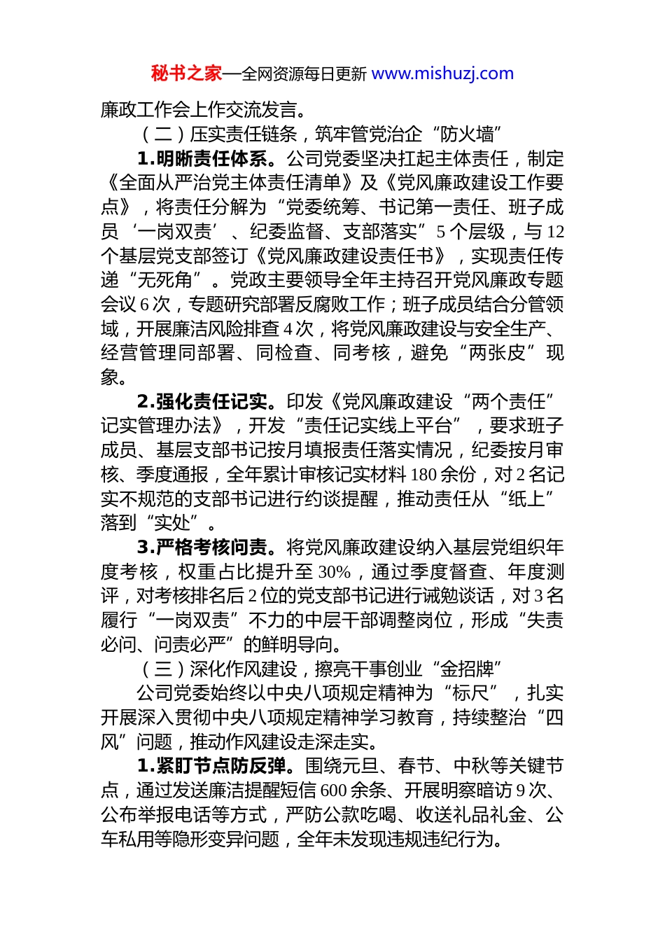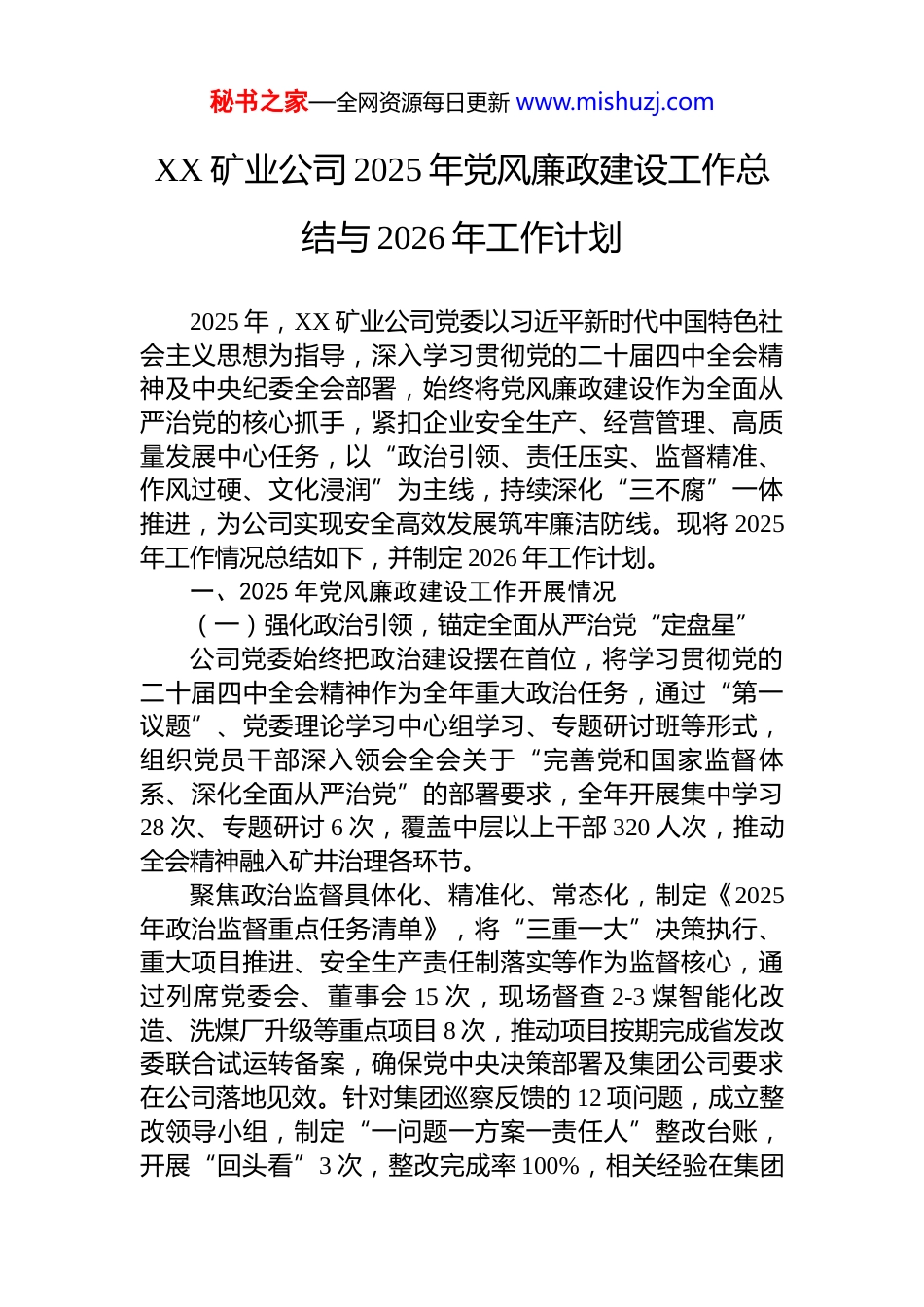 秘书之家—全网资源每日更新 www.mishuzj.comXX 矿业公司 2025 年党风廉政建设工作总结与 2026 年工作计划2025 年,XX 矿业公司党委以习近平新时代中国特色社会主义思想为指导,深入学习贯彻党的二十届四中全会精神及中央纪委全会部署,始终将党风廉政建设作为全面从严治党的核心抓手,紧扣企业安全生产、经营管理、高质量发展中心任务,以“政治引领、责任压实、监督精准、作风过硬、文化浸润”为主线,持续深化“三不腐”一体推进,为公司实现安全高效发展筑牢廉洁防线。现将 2025年工作情况总结如下,并制定 2026 年工作计划。一、2025 年党风廉政建设工作开展情况(一)强化政治引领,锚定全面从严治党“定盘星”公司党委始终把政治建设摆在首位,将学习贯彻党的二十届四中全会精神作为全年重大政治任务,通过“第一议题”、党委理论学习中心组学习、专题研讨班等形式,组织党员干部深入领会全会关于“完善党和国家监督体系、深化全面从严治党”的部署要求,全年开展集中学习28 次、专题研讨 6 次,覆盖中层以上干部 320 人次,推动全会精神融入矿井治理各环节。聚焦政治监督具体化、精准化、常态化,制定《2025年政治监督重点任务清单》,将“三重一大”决策执行、重大项目推进、安全生产责任制落实等作为监督核心,通过列席党委会、董事会 15 次,现场督查 2-3 煤智能化改造、洗煤厂升级等重点项目 8 次,推动项目按期完成省发改委联合试运转备案,确保党中央决策部署及集团公司要求在公司落地见效。针对集团巡察反馈的 12 项问题,成立整改领导小组,制定“一问题一方案一责任人”整改台账,开展“回头看”3 次,整改完成率 100%,相关经验在集团秘书之家—全网资源每日更新 www.mishuzj.com廉政工作会上作交流发言。(二)压实责任链条,筑牢管党治企“防火墙”1.明晰责任体系。公司党委坚决扛起主体责任,制定《全面从严治党主体责任清单》及《党风廉政建设工作要点》,将责任分解为“党委统筹、书记第一责任、班子成员‘一岗双责’、纪委监督、支部落实”5 个层级,与 12个基层党支部签订《党风廉政建设责任书》,实现责任传递“无死角”。党政主要领导全年主持召开党风廉政专题会议 6 次,专题研究部署反腐败工作;班子成员结合分管领域,开展廉洁风险排查 4 次,将党风廉政建设与安全生产、经营管理同部署、同检查、同考核,避免“两张皮”现象。2.强化责任记实。印发《党风廉政建设“两个责任”记实管理办法》,开发“责任记实线上平台”,要求班子成员、基层支部书记按月填报责任落实情况,纪委按月审核、季度通报,全年累计审核记实材料 180 余份,对 2 名记实不规范的支部书记进行约谈提醒,推动责任从“纸上”落到“实处”。3.严格考核问责。将党风廉政建设纳入基层党组织年度考核,权重占比提升至 30%,通过季度督查、年度测评,对考核排名后 2 位的党支部书记进行诫勉谈话,对 3 名履行“一岗双责”不力的中层干部调整岗位,形成“失责必问、问责必严”的鲜明导向。(三)深化作风建设,擦亮干事创业“金招牌”公司党委始终以中央八项规定精神为“标尺”,扎实开展深入贯彻中央八项规定精神学习教育,持续整治“四风”问题,推动作风建设走深走实。1.紧盯节点防反弹。围绕元旦、春节、中秋等关键节点,通过发送廉洁提醒短信 600 余条、开展明察暗访 9 次、公布举报电话等方式,严防公款吃喝、收送礼品礼金、公车私用等隐形变异问题,全年未发现违规违纪行为。秘书之家—全网资源每日更新 www.mishuzj.com2.整治形式主义官僚主义。以“基层减负年”为抓手,精简会议文件,全年召开会议同比减少 25 场次、发文减少 68 份;优化工作流程,取消基层报表 12 项,推动“线上办公”覆盖率达 90%,切实为工区减负。针对工作中推诿扯皮、不作为等问题,查处典型案例 3 起,对 5 名责任人进行批评教育、2 人给予组织处理,形成有力震慑。3.聚焦群众身边微腐败。开展“职工身边不正之风专项整治”,围绕薪酬分配、厂务公开、物资领用等职工关切问题,深入 17 个基层工区,与 210 名职工座谈,发放调查问...