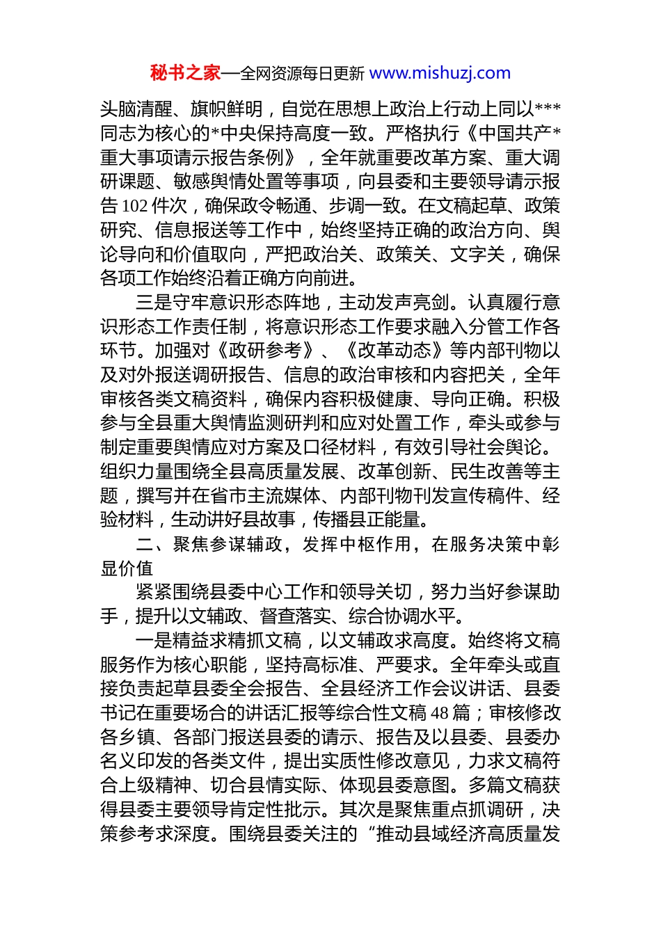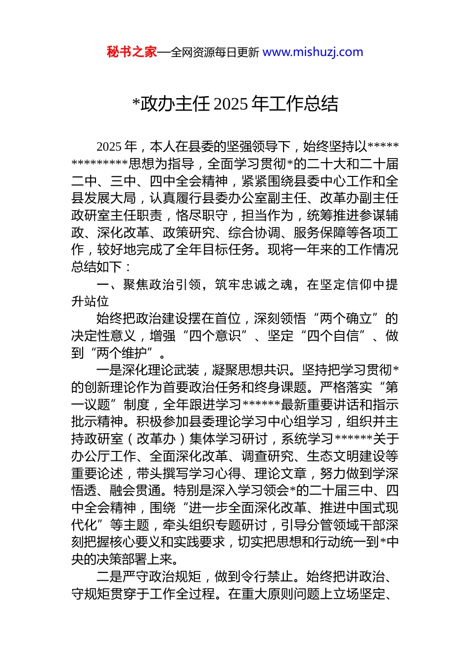秘书之家—全网资源每日更新 www.mishuzj.com*政办主任 2025 年工作总结2025 年,本人在县委的坚强领导下,始终坚持以**************思想为指导,全面学习贯彻*的二十大和二十届二中、三中、四中全会精神,紧紧围绕县委中心工作和全县发展大局,认真履行县委办公室副主任、改革办副主任政研室主任职责,恪尽职守,担当作为,统筹推进参谋辅政、深化改革、政策研究、综合协调、服务保障等各项工作,较好地完成了全年目标任务。现将一年来的工作情况总结如下:一、聚焦政治引领,筑牢忠诚之魂,在坚定信仰中提升站位始终把政治建设摆在首位,深刻领悟“两个确立”的决定性意义,增强“四个意识”、坚定“四个自信”、做到“两个维护”。一是深化理论武装,凝聚思想共识。坚持把学习贯彻*的创新理论作为首要政治任务和终身课题。严格落实“第一议题”制度,全年跟进学习******最新重要讲话和指示批示精神。积极参加县委理论学习中心组学习,组织并主持政研室(改革办)集体学习研讨,系统学习******关于办公厅工作、全面深化改革、调查研究、生态文明建设等重要论述,带头撰写学习心得、理论文章,努力做到学深悟透、融会贯通。特别是深入学习领会*的二十届三中、四中全会精神,围绕“进一步全面深化改革、推进中国式现代化”等主题,牵头组织专题研讨,引导分管领域干部深刻把握核心要义和实践要求,切实把思想和行动统一到*中央的决策部署上来。二是严守政治规矩,做到令行禁止。始终把讲政治、守规矩贯穿于工作全过程。在重大原则问题上立场坚定、秘书之家—全网资源每日更新 www.mishuzj.com头脑清醒、旗帜鲜明,自觉在思想上政治上行动上同以***同志为核心的*中央保持高度一致。严格执行《中国共产*重大事项请示报告条例》,全年就重要改革方案、重大调研课题、敏感舆情处置等事项,向县委和主要领导请示报告 102 件次,确保政令畅通、步调一致。在文稿起草、政策研究、信息报送等工作中,始终坚持正确的政治方向、舆论导向和价值取向,严把政治关、政策关、文字关,确保各项工作始终沿着正确方向前进。三是守牢意识形态阵地,主动发声亮剑。认真履行意识形态工作责任制,将意识形态工作要求融入分管工作各环节。加强对《政研参考》、《改革动态》等内部刊物以及对外报送调研报告、信息的政治审核和内容把关,全年审核各类文稿资料,确保内容积极健康、导向正确。积极参与全县重大舆情监测研判和应对处置工作,牵头或参与制定重要舆情应对方案及口径材料,有效引导社会舆论。组织力量围绕全县高质量发展、改革创新、民生改善等主题,撰写并在省市主流媒体、内部刊物刊发宣传稿件、经验材料,生动讲好县故事,传播县正能量。二、聚焦参谋辅政,发挥中枢作用,在服务决策中彰显价值紧紧围绕县委中心工作和领导关切,努力当好参谋助手,提升以文辅政、督查落实、综合协调水平。一是精益求精抓文稿,以文辅政求高度。始终将文稿服务作为核心职能,坚持高标准、严要求。全年牵头或直接负责起草县委全会报告、全县经济工作会议讲话、县委书记在重要场合的讲话汇报等综合性文稿 48 篇;审核修改各乡镇、各部门报送县委的请示、报告及以县委、县委办名义印发的各类文件,提出实质性修改意见,力求文稿符合上级精神、切合县情实际、体现县委意图。多篇文稿获得县委主要领导肯定性批示。其次是聚焦重点抓调研,决策参考求深度。围绕县委关注的“推动县域经济高质量发秘书之家—全网资源每日更新 www.mishuzj.com展”、“全面推进乡村振兴”、“优化营商环境”、“加强基层治理”等重大课题,牵头制定年度重点调研计划,采取“室领导领题+科室攻关+联合调研”模式,全年组织开展专题调研,形成有情况、有分析、有对策的调研报告其中,《关于我县融入区域发展战略的路径研究》、《破解乡村产业发展瓶颈的思考与建议》等 8 篇报告获县委主要领导批示,部分建议已转化为具体政策举措;《县深化“放管服”改革优化营商环境的实践》被市委政研室刊物采用。二是强化督查抓落实,推动决策求实效。把推动县委决策部署落地生根作为重要职责。优化督查工作机制,制定《县委年度重点工作督...