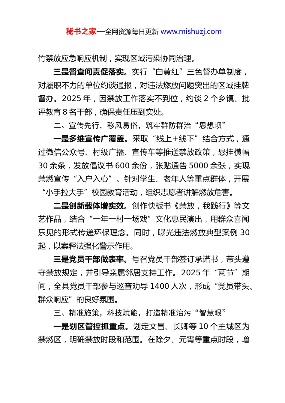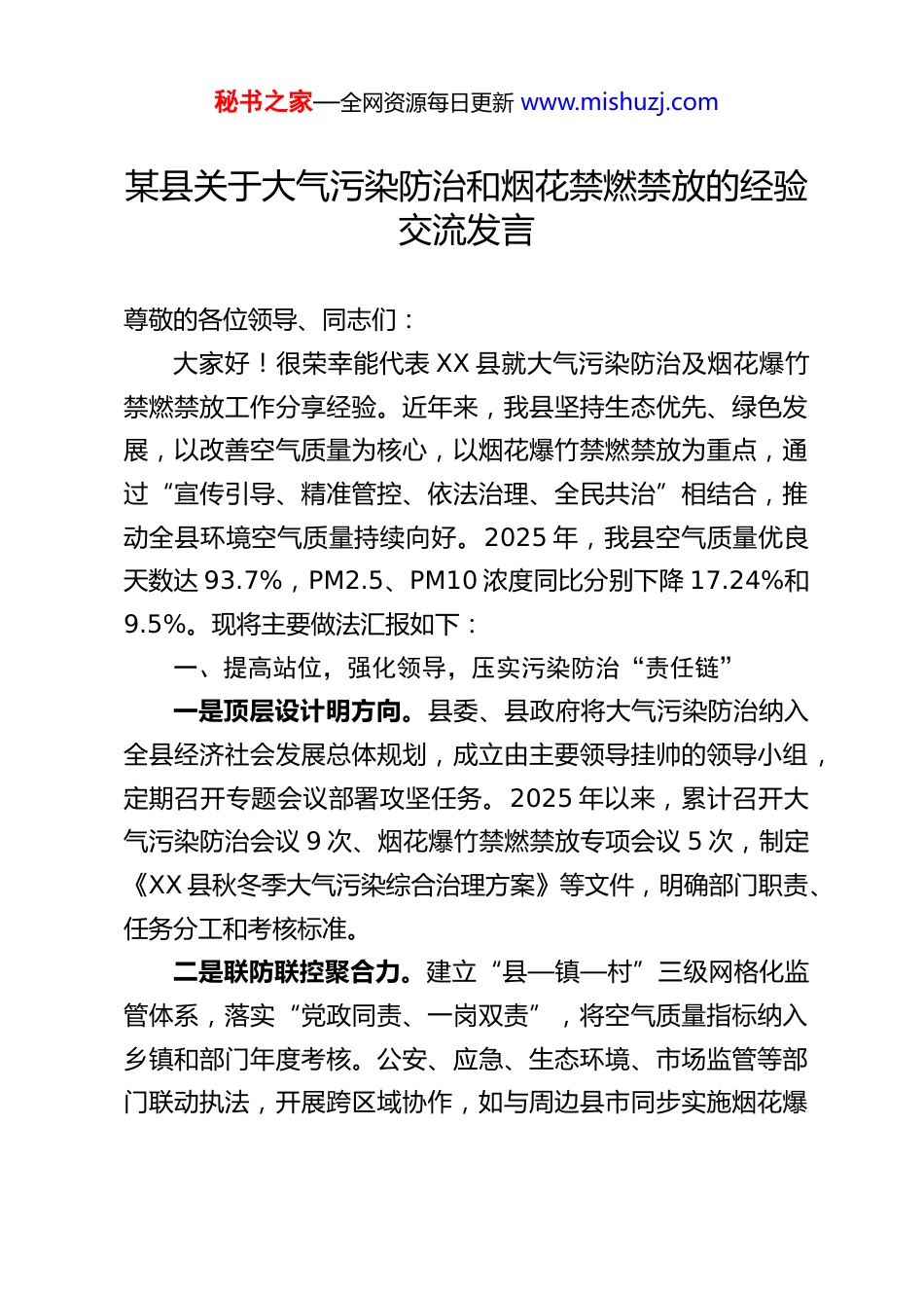 秘书之家—全网资源每日更新 www.mishuzj.com某县关于大气污染防治和烟花禁燃禁放的经验交流发言尊敬的各位领导、同志们:大家好!很荣幸能代表 XX 县就大气污染防治及烟花爆竹禁燃禁放工作分享经验。近年来,我县坚持生态优先、绿色发展,以改善空气质量为核心,以烟花爆竹禁燃禁放为重点,通过“宣传引导、精准管控、依法治理、全民共治”相结合,推动全县环境空气质量持续向好。2025 年,我县空气质量优良天数达 93.7%,PM2.5、PM10 浓度同比分别下降 17.24%和9.5%。现将主要做法汇报如下:一、提高站位,强化领导,压实污染防治“责任链”一是顶层设计明方向。县委、县政府将大气污染防治纳入全县经济社会发展总体规划,成立由主要领导挂帅的领导小组,定期召开专题会议部署攻坚任务。2025 年以来,累计召开大气污染防治会议 9 次、烟花爆竹禁燃禁放专项会议 5 次,制定《XX 县秋冬季大气污染综合治理方案》等文件,明确部门职责、任务分工和考核标准。二是联防联控聚合力。建立“县—镇—村”三级网格化监管体系,落实“党政同责、一岗双责”,将空气质量指标纳入乡镇和部门年度考核。公安、应急、生态环境、市场监管等部门联动执法,开展跨区域协作,如与周边县市同步实施烟花爆秘书之家—全网资源每日更新 www.mishuzj.com竹禁放应急响应机制,实现区域污染协同治理。三是督查问责促落实。实行“白黄红”三色督办单制度,对履职不力的单位约谈通报,对违法燃放问题突出的区域挂牌督办。2025 年,因禁放工作落实不到位,约谈 2 个乡镇、批评教育 8 名干部,确保责任压到实处。二、宣传先行,移风易俗,筑牢群防群治“思想坝”一是多维宣传广覆盖。采取“线上+线下”结合方式,通过微信公众号、村级广播、宣传车等推送禁放政策,悬挂横幅30 余条,发放倡议书 600 余份,张贴通告 5000 余张,实现禁燃宣传“入户入心”。针对学生、老年人等重点群体,开展“小手拉大手”校园教育活动,组织志愿者讲解燃放危害。二是创新载体增实效。创作快板书《禁放,我践行》等文艺作品,结合“一年一村一场戏”文化惠民演出,用群众喜闻乐见的形式传递环保理念。同时,曝光违法燃放典型案例 30起,以案释法强化警示作用。三是党员干部做表率。号召党员干部签订承诺书,带头遵守禁放规定,并引导亲属邻居支持工作。2025 年“两节”期间,全县党员干部参与巡查劝导 1400 人次,形成“党员带头、群众响应”的良好氛围。三、精准施策,科技赋能,打造精准治污“智慧眼”一是划区管控抓重点。划定文昌、长卿等 10 个主城区为禁燃区,明确禁放时段和范围。在除夕、元宵等重点时段,增秘书之家—全网资源每日更新 www.mishuzj.com设临时巡查卡点,出动执法人员 1.1 万人次,劝止违法燃放行为 1545 起。二是科技支撑提效能。布设 35 个空气质量微站、2 台激光雷达,实时监测污染物浓度,利用大数据平台分析污染源分布规律。2025 年,通过雷达扫描发现并处置污染源头 184 处,人工增雨作业 10 次,有效降低污染物浓度。三是源头治理减存量。应急、公安等部门联合开展“打非治违”行动,排查香烛店、超市等重点场所 70 家,收缴烟花爆竹 6 箱,处罚非法销售店铺 18 家,切断烟花爆竹流通链条。四、依法监管,严格执法,保持高压震慑“惩戒尺”一是健全法规强保障。依据《大气污染防治法》《烟花爆竹安全管理条例》,制定《XX 县烟花爆竹禁燃禁放实施细则》,明确违法燃放拘留、罚款等法律责任,实现执法有据可依。二是联合执法常态化。公安、生态环境等部门每晚开展夜查行动,重点整治渣土车、烧烤油烟、工地扬尘等污染源2025 年,查处环境违法案件 30 起,行政拘留 5 人,形成“不敢违、不能违”的震慑效应。三是行刑衔接增威力。对造成严重污染或火灾事故的违法行为,移送司法机关追究刑事责任,并通过媒体公开曝光,实现“查处一案、警示一片”。五、巩固成效,常态长效,绘就蓝天白云“新画卷”尽管取得阶段性成效,但我们清醒认识到,大气污染防治秘书之家—全网资源每日更新 www.mishuzj.com具有长期性、反复性。下一步,我县将重点推...
